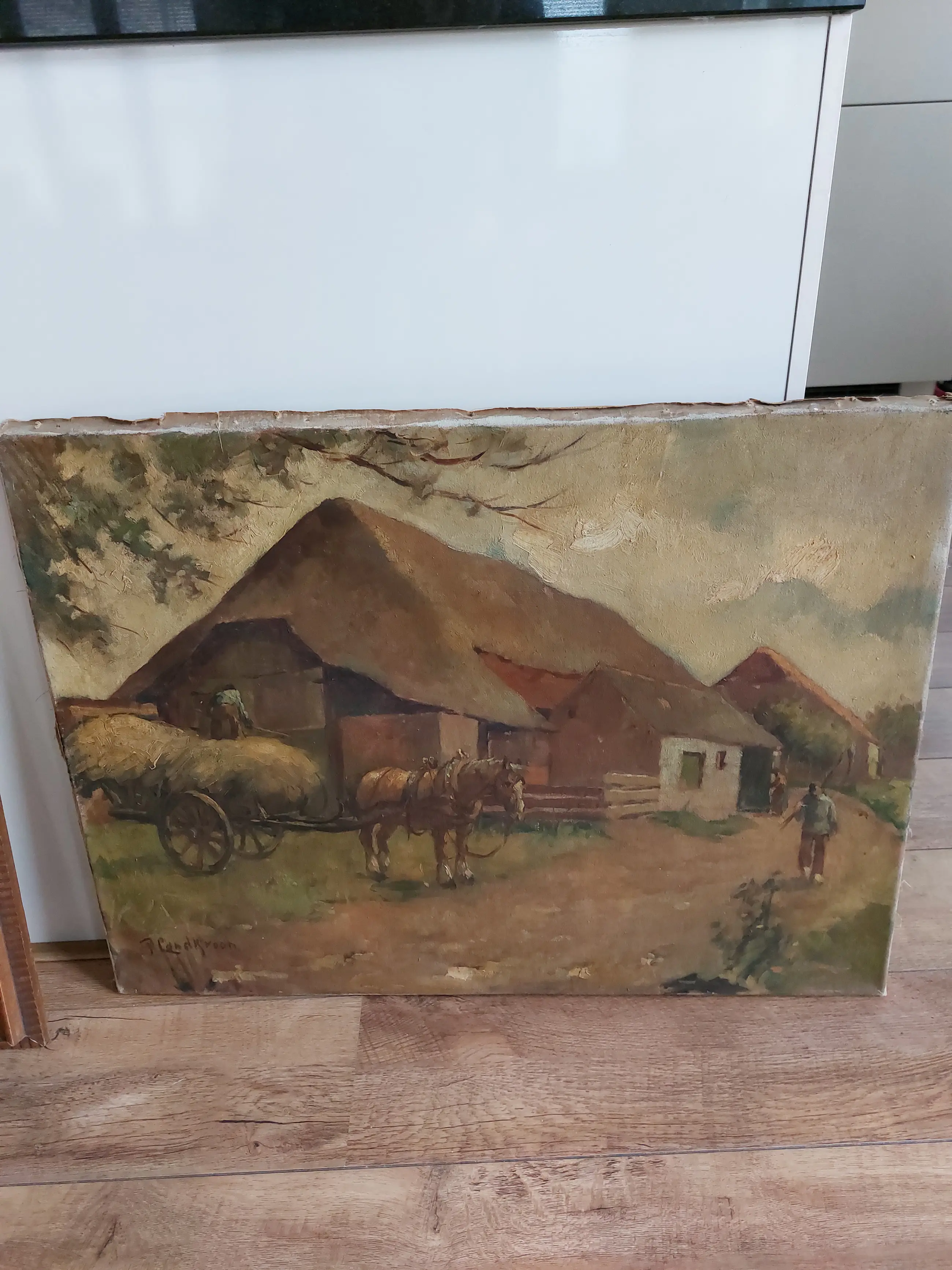 Het schilderij is niet ingelijst en stelt een boerderij met paard en wagen voor.