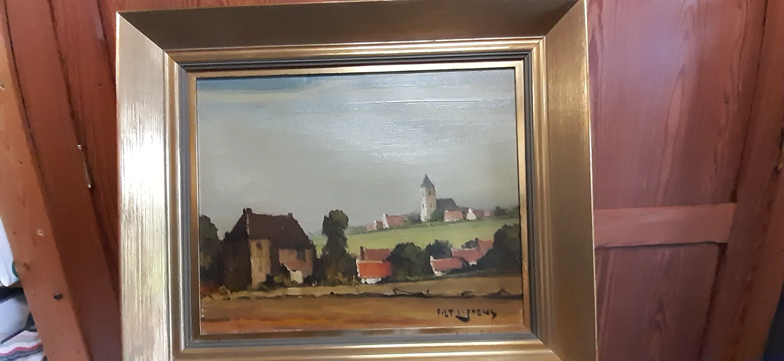 Mooi werk van Piet Lippens. Landschapszicht met kerk van Moregem nabij Oudenaarde.