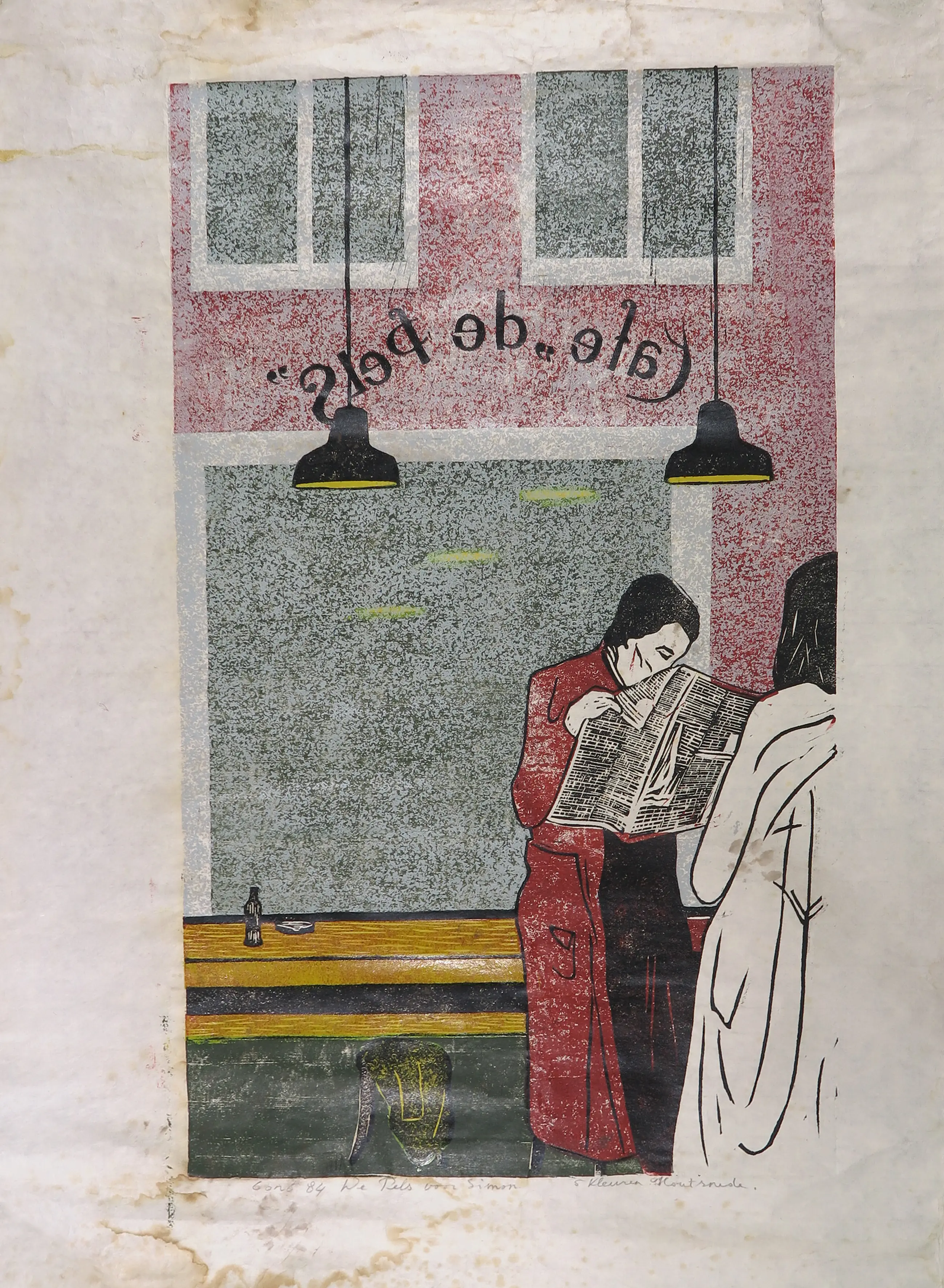 Grote waterschade zichtbaar. Ook enkele vlekken te zien in de compositie. Kreukels in het papier. | |||||||||||