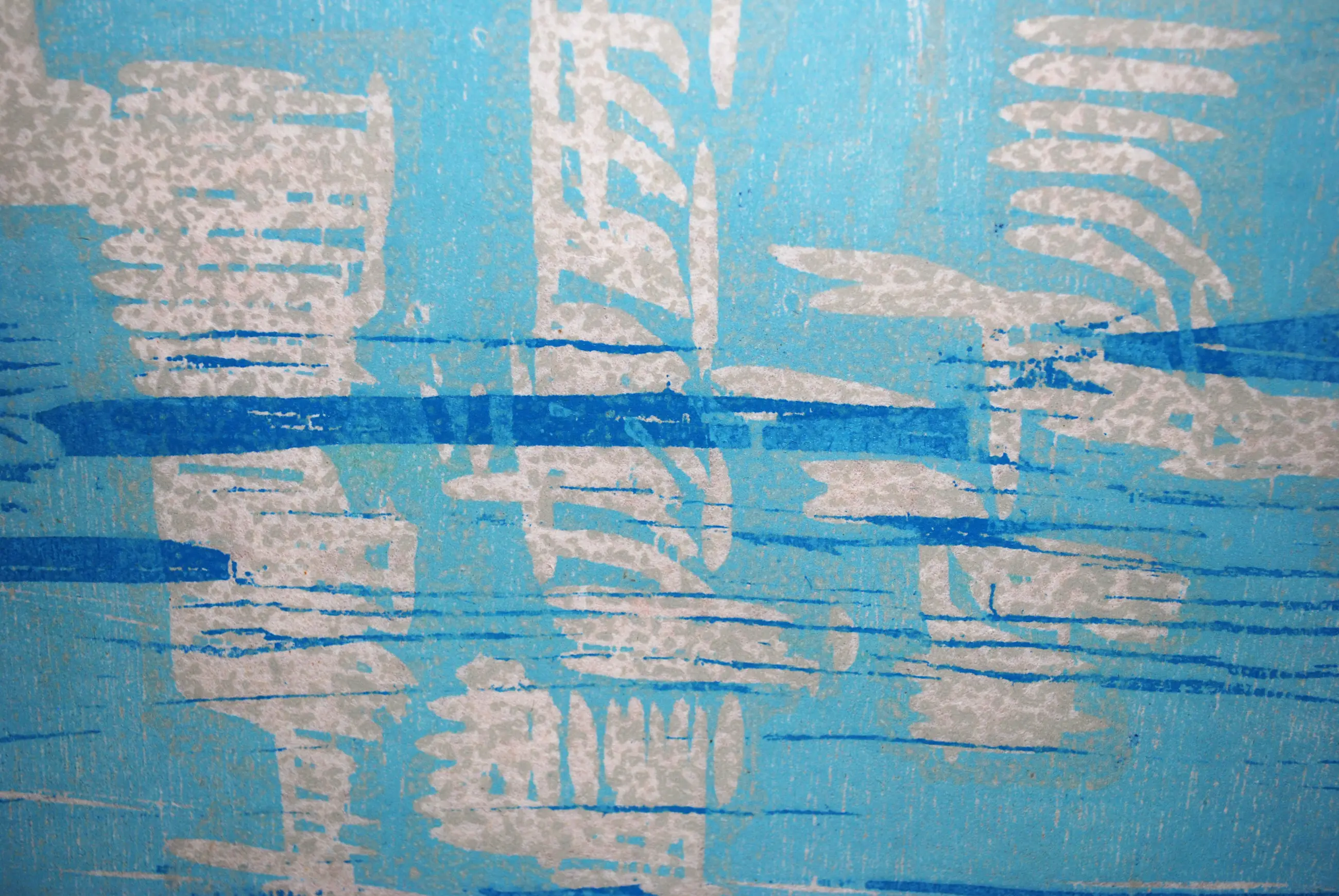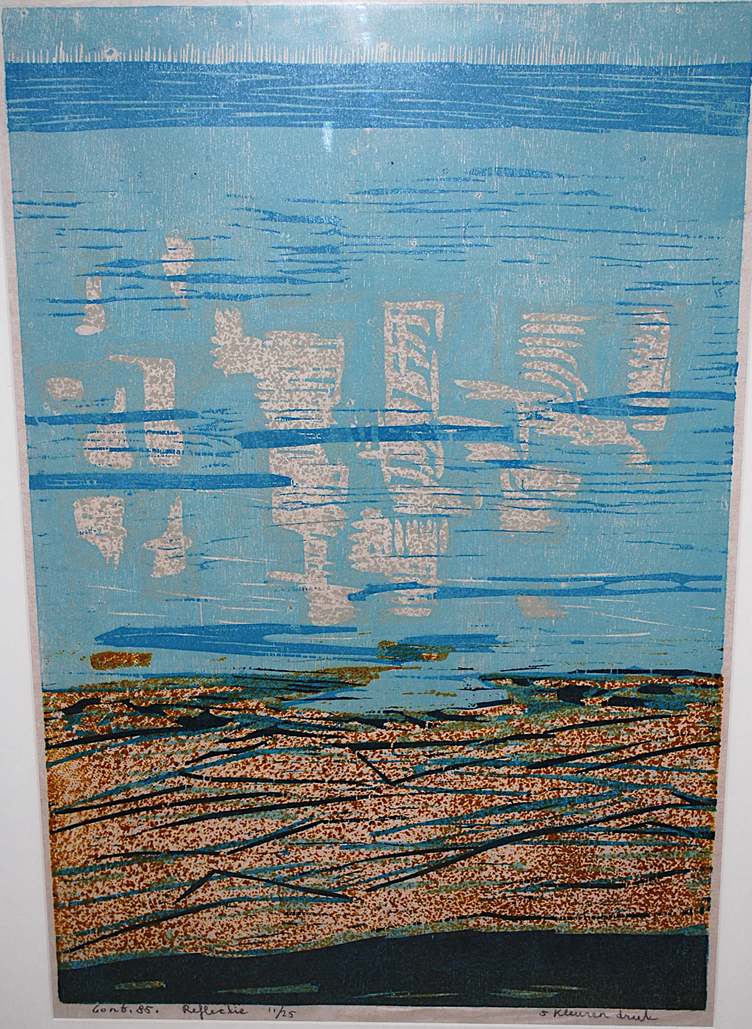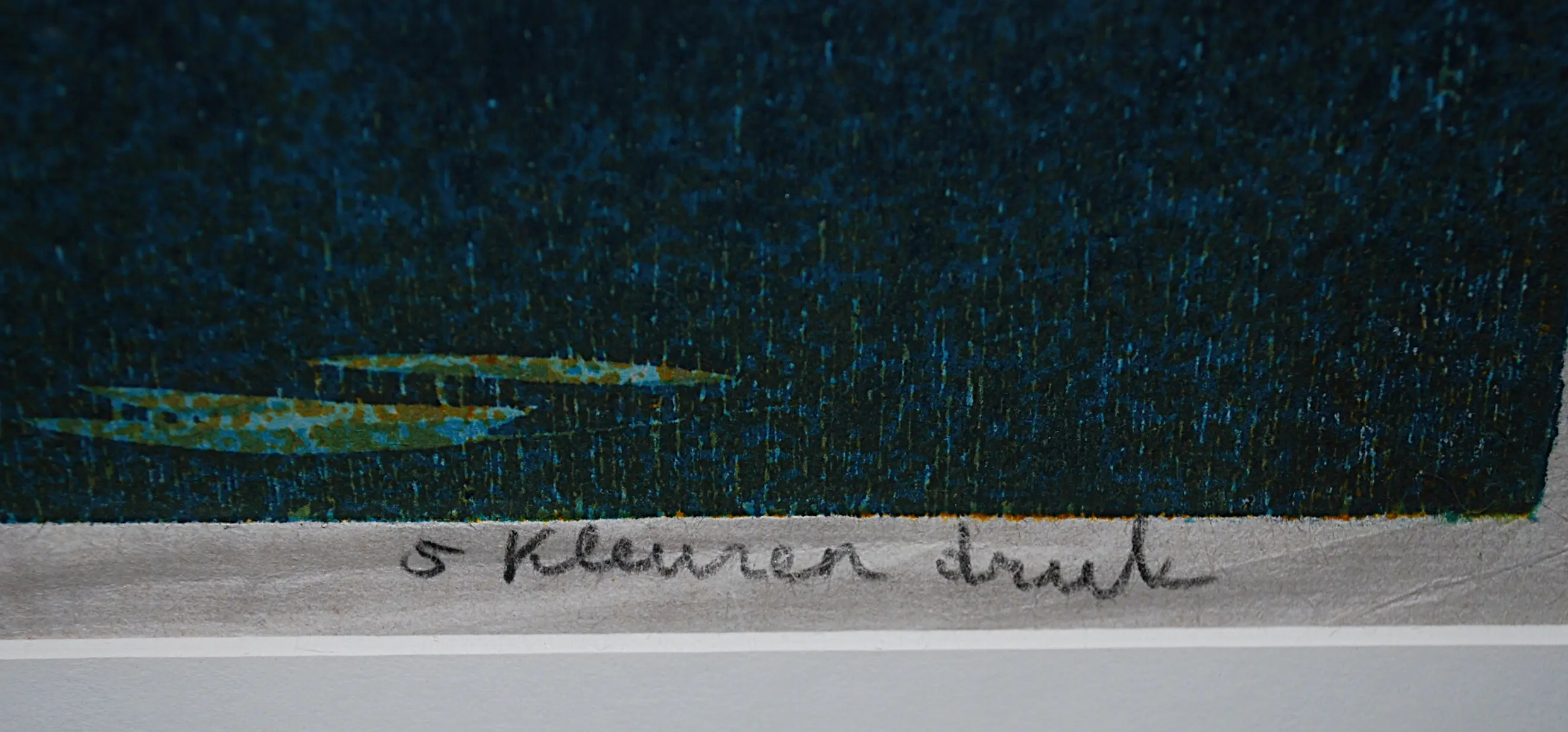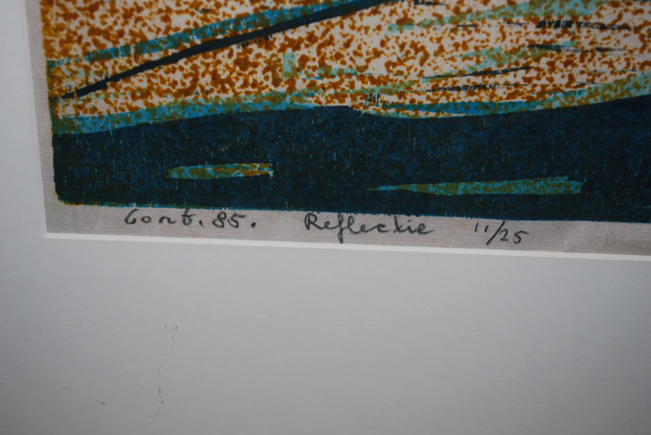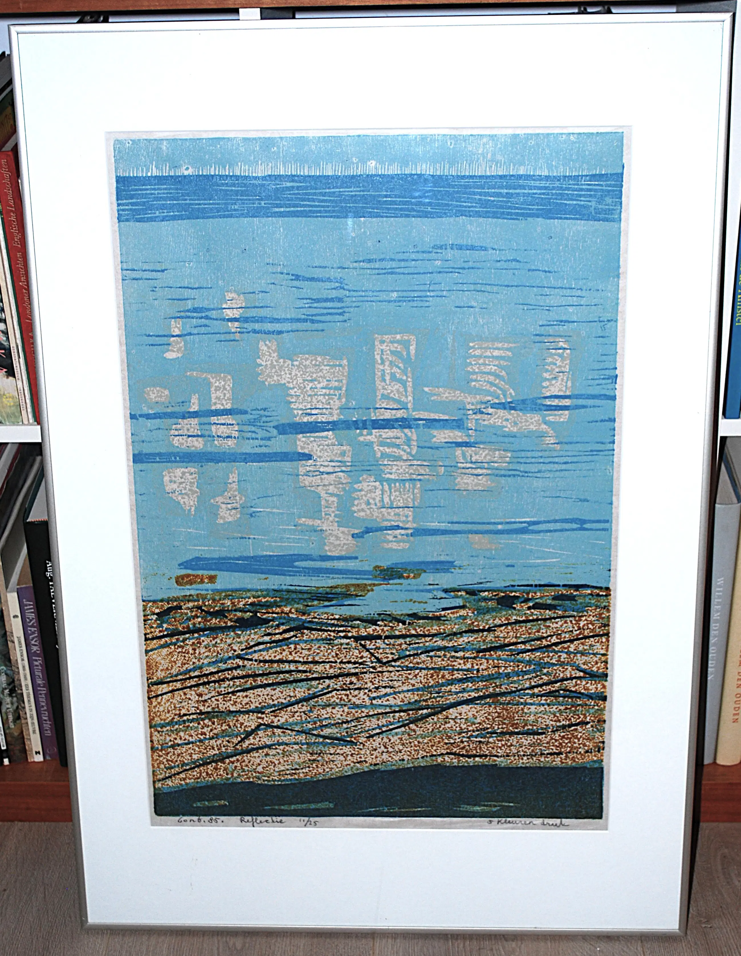 Piet Lont - 'Reflectie' (op het wad) - grote 5-kleuren houtsnede - oplage 25