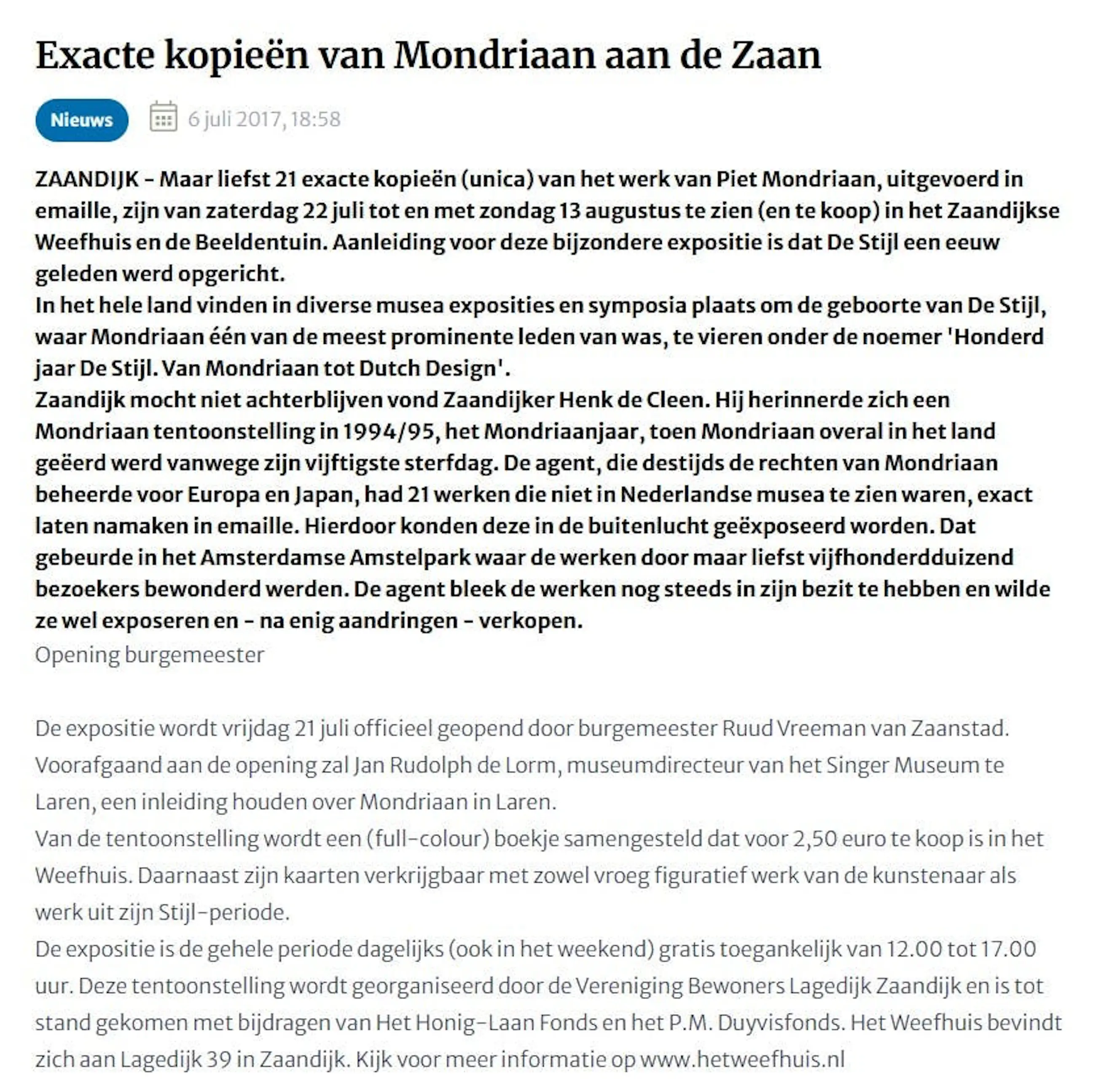 In het Mondriaanjaar (1994, Mondriaan’s 50e sterfdag) was er in het Amstelpark een tentoonstelling van 21 unieke, exacte replica’s van zijn werk uitgevoerd in emaille. In 2017 waren deze 21 werken weer te zien in het Weefhuis in Zaandijk in het kader van de 100e verjaardag van De Stijl (zie bijgevoegde documentatie).