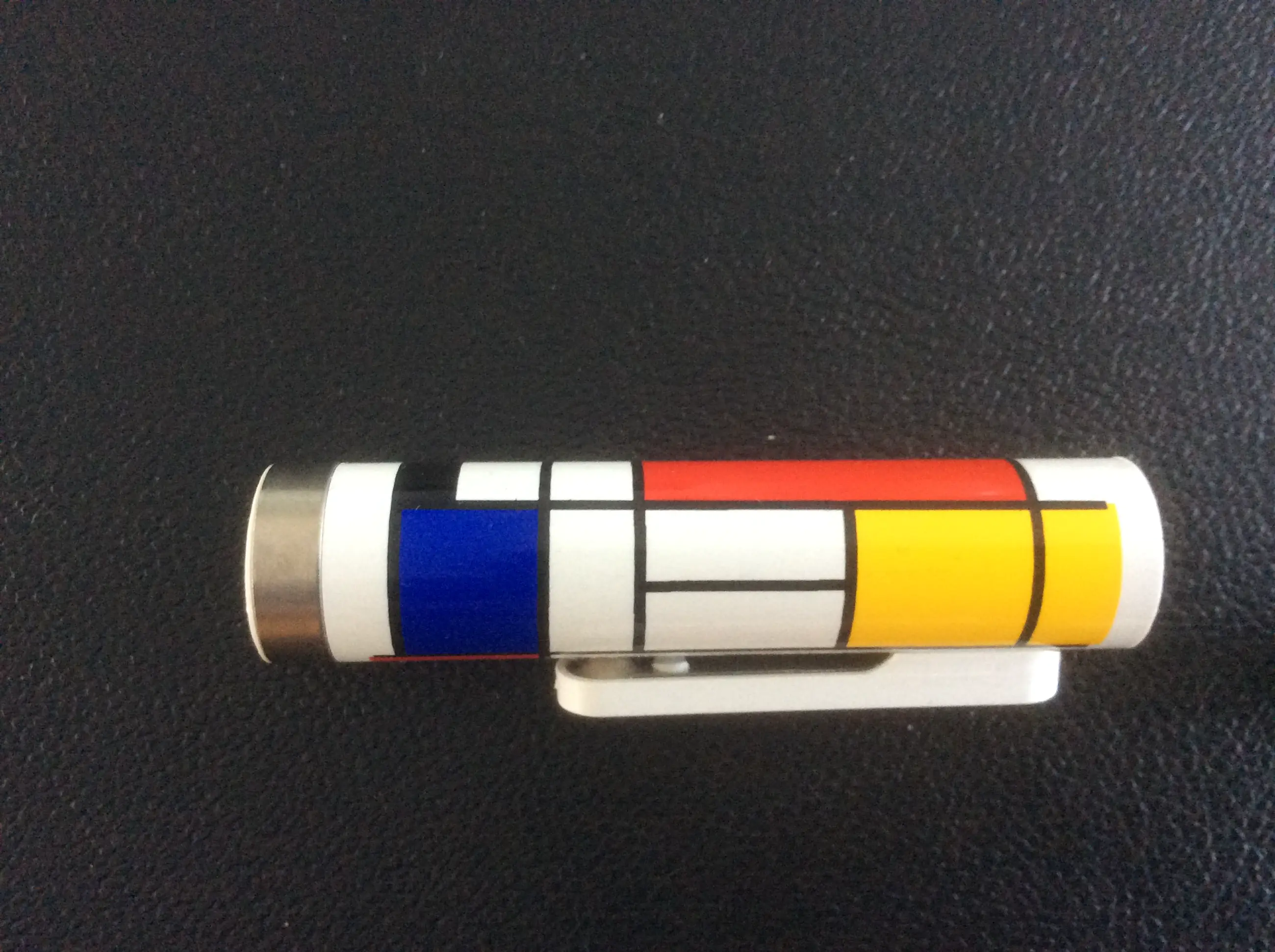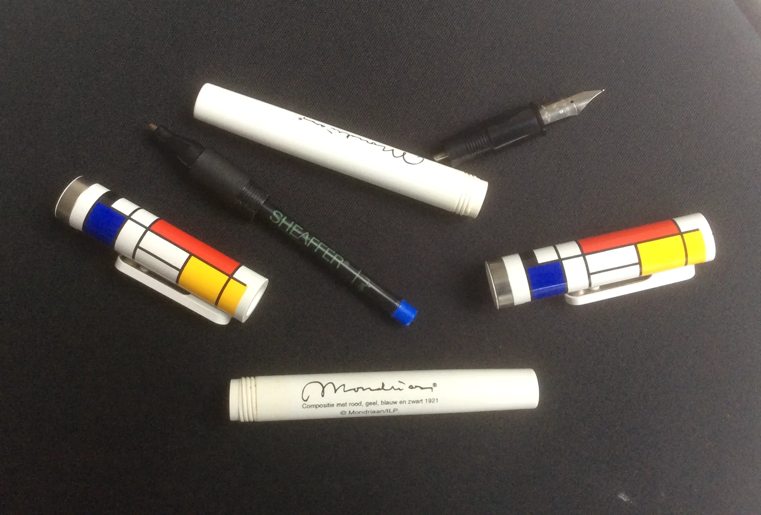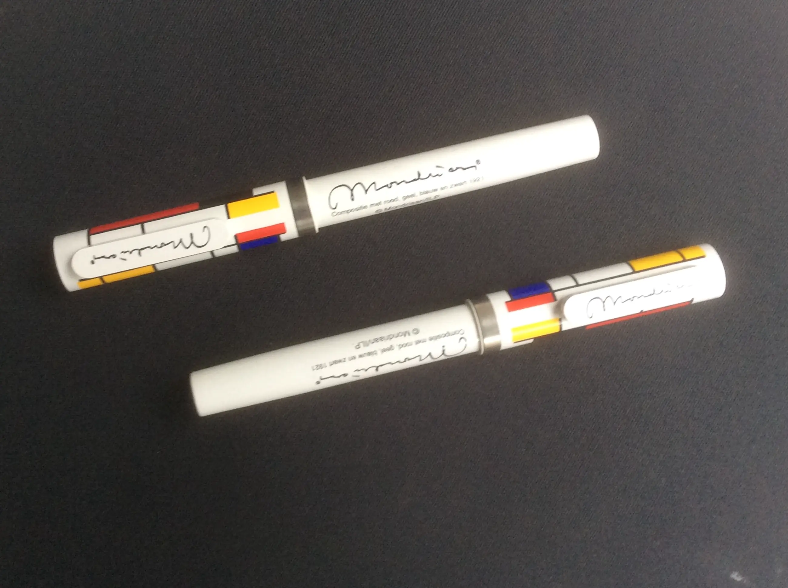 Een vulpen en een balpen van een speciale editie van Sheaffer. De doppen vertonen de compositie “Rood, geel, blauw en zwart” uit 1921 van Piet Mondriaan. Geen vullingen bijgeleverd.