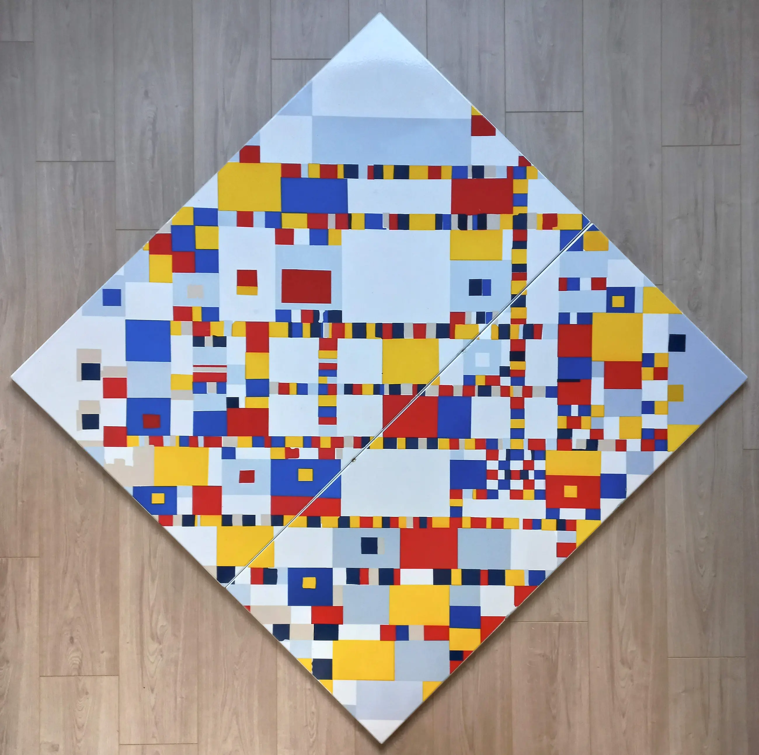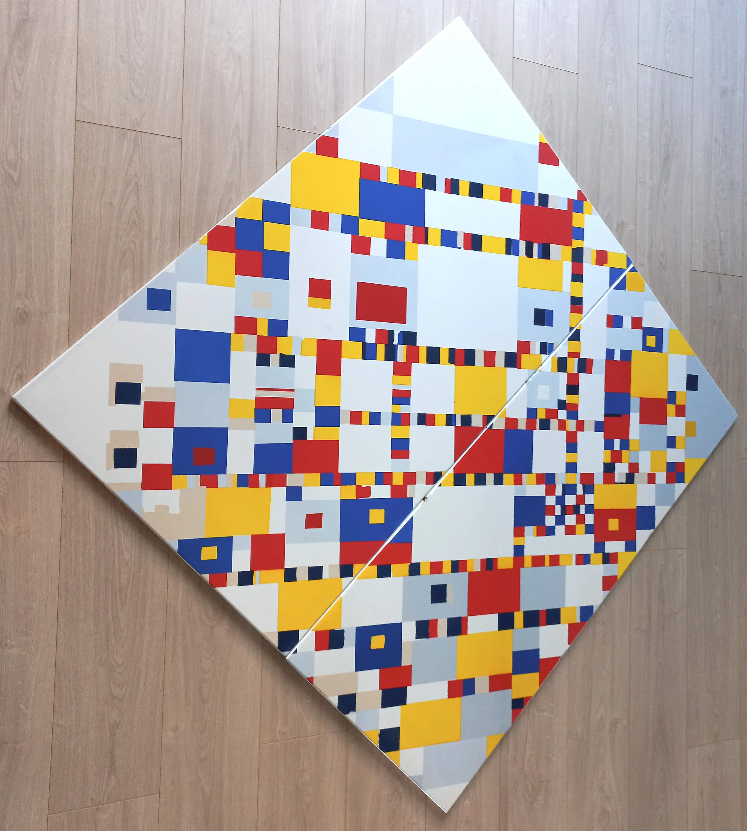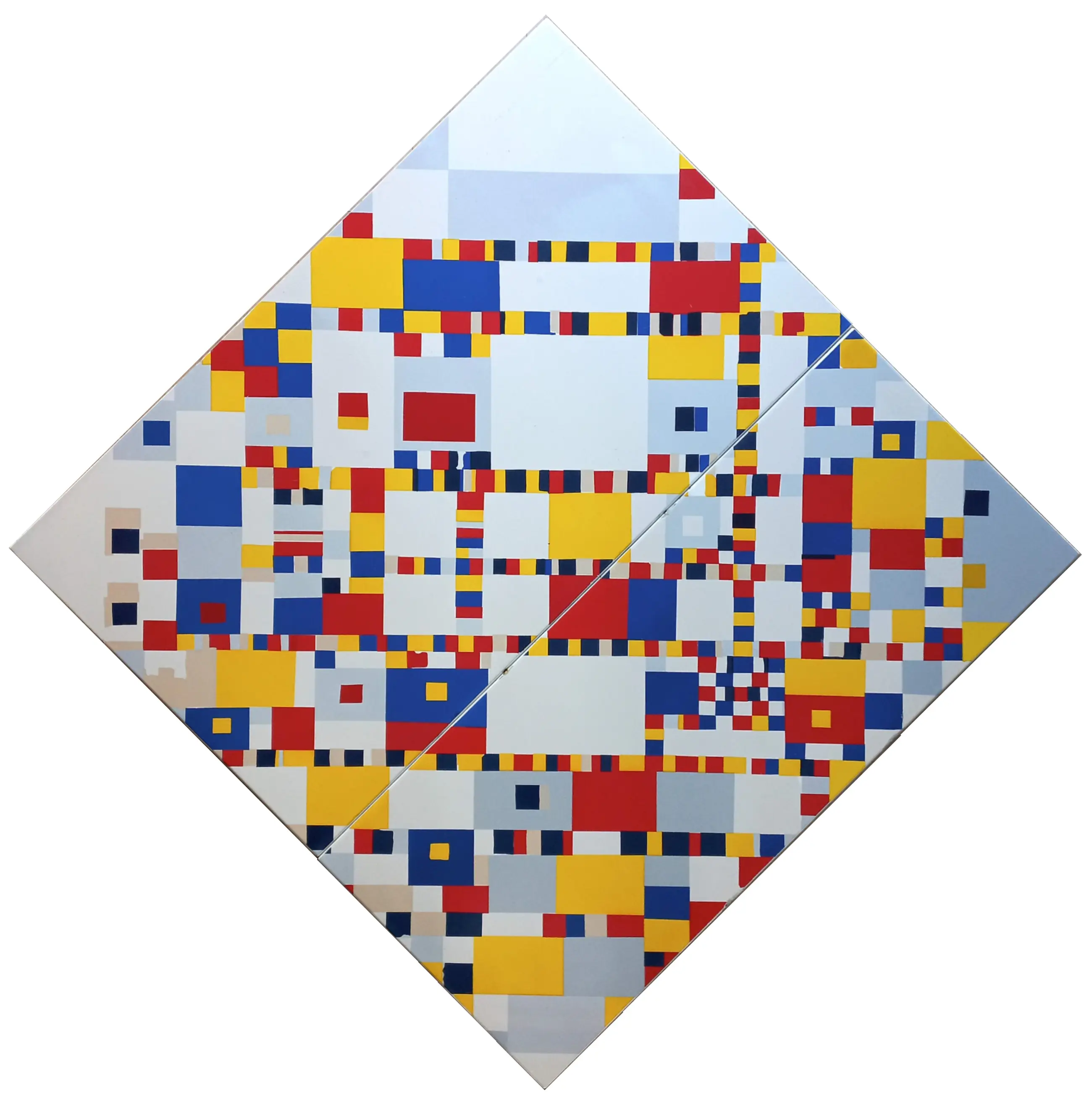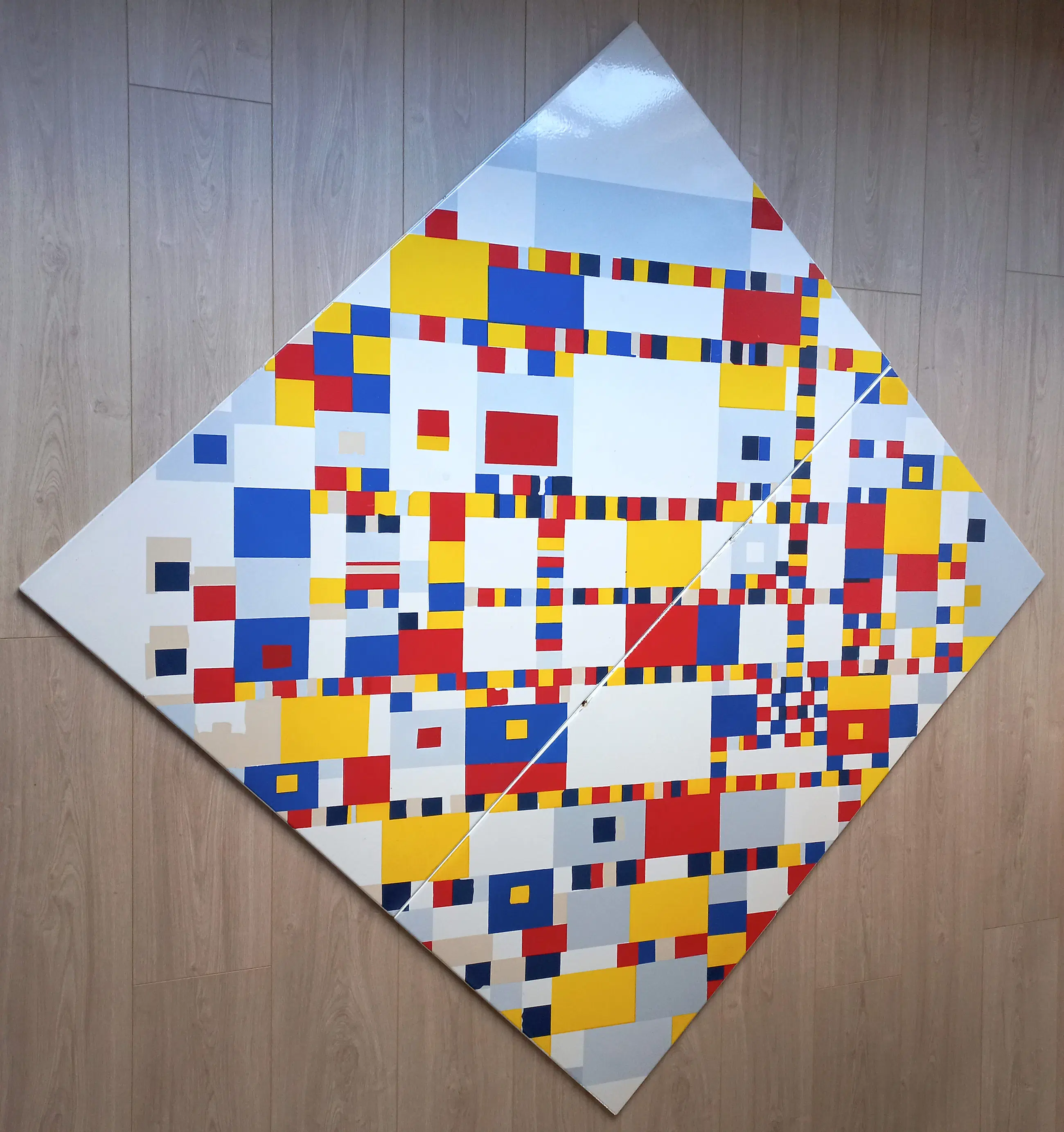 Dit is één van die werken. Een exacte replica in emaille van het wereldberoemde Victory Boogie Woogie uit 1942-1944. Emaille op twee metalen platen, samengevoegd een geheel op ware grootte van het origineel. Het is bij elkaar een aardig oppervlak aan metaal en emaille dus redelijk zwaar (schatting: 10-15 kg). In goede conditie. Literatuur: Catalogue Raisonné of the Work of 1911-1944, nr. B324.