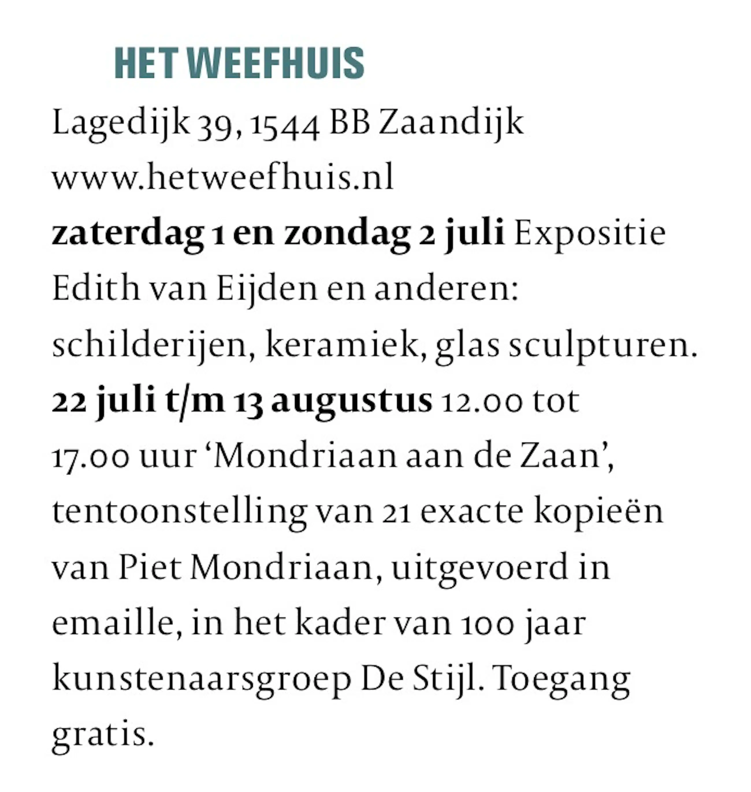 In het Mondriaanjaar (1994, Mondriaan’s 50e sterfdag) was er in het Amstelpark een tentoonstelling van 21 unieke, exacte replica’s van zijn werk uitgevoerd in emaille. In 2017 waren deze 21 werken weer te zien in het Weefhuis in Zaandijk in het kader van de 100e verjaardag van De Stijl (zie bijgevoegde documentatie).