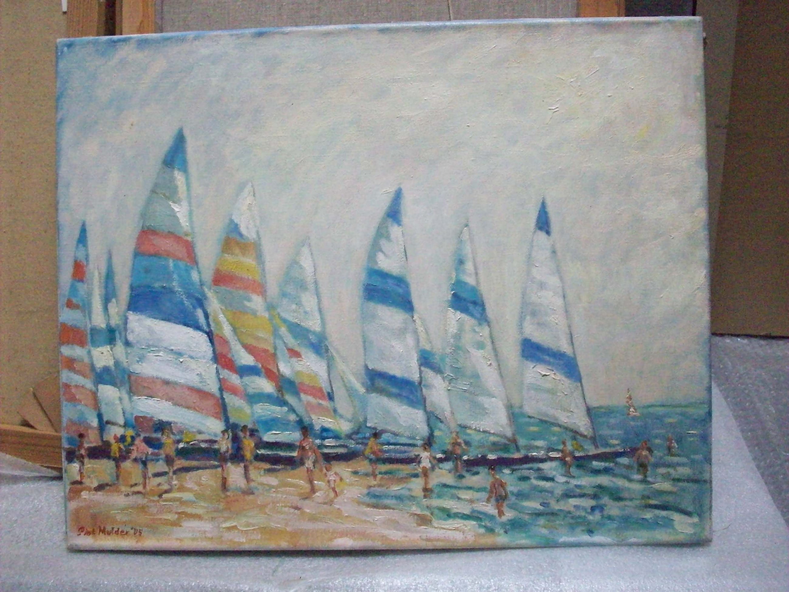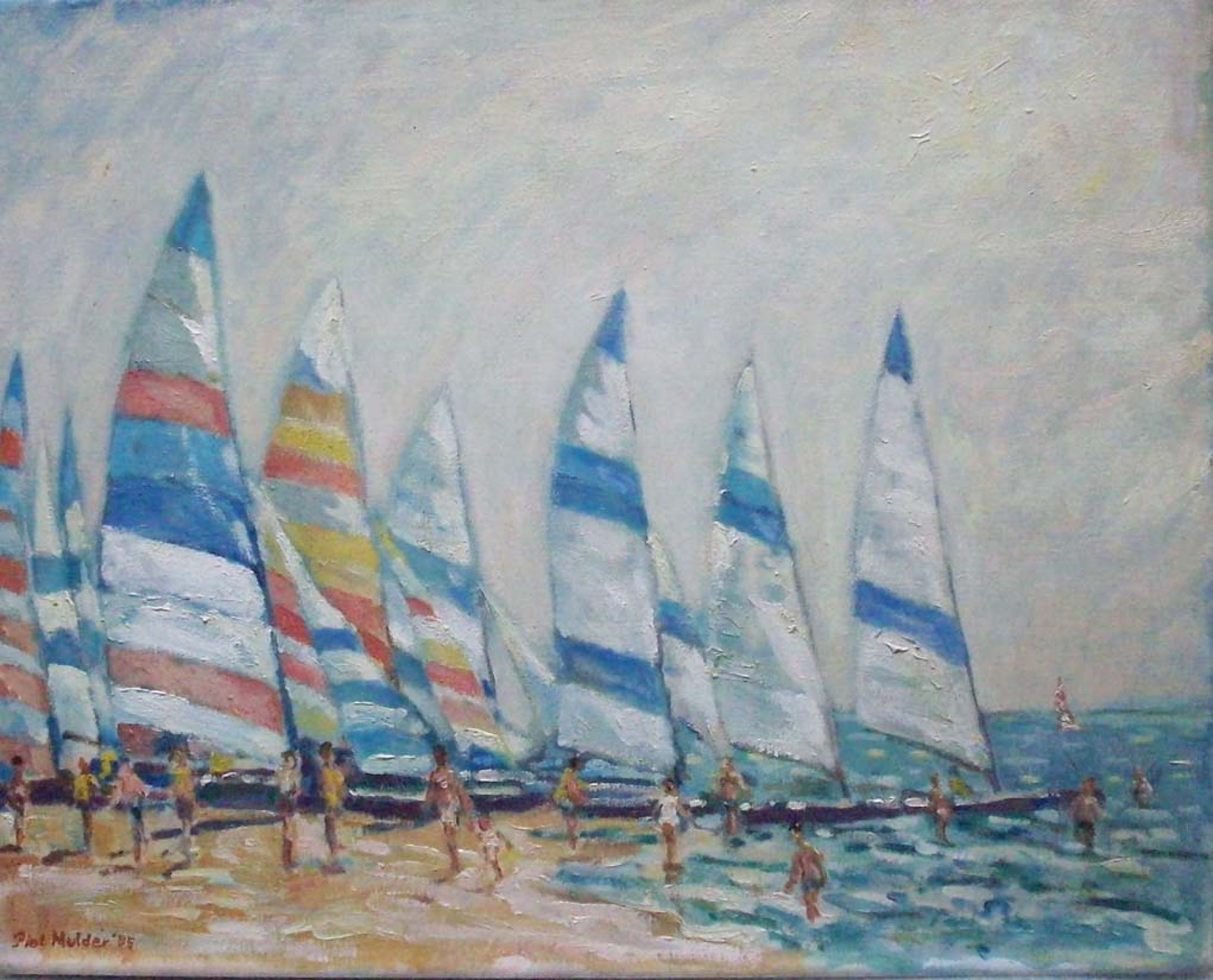 Piet Mulder (1919-2001) was meer dan een halve eeuw de Betuwse schilder van landschappen, zeegezichten en portretten. In de jaren zestig was hij één van de drijvende krachten achter de Kontaktkring voor Beeldende Kunst tussen de Grote Rivieren, waarbij kunstenaars als Marinus van de Boezem, Johan Ponsioen en Jan van Munster waren aangesloten, daarna werd hij actief in de Tielse Kunstenaarssocieteit Tijdens zijn leven had hij meer dan 40 eenmans-exposities en deed hij aan meer dan zestig groepexposities mee, van het Amsterdamse Scheepvaartmuseum, Museum Mesdag en het Rotterdamse Maritiem Museum tot aan de International Marine Art Exhibition in Mystic (VS). Op die laatste tentoonstelling rekende criticus William Zimmer van de New York Times (13 augustus 1989) zijn Laag water in Harwich tot de beste aquarellen van de show: ‘with scruffy small boats, seemingly floating on mud’.
