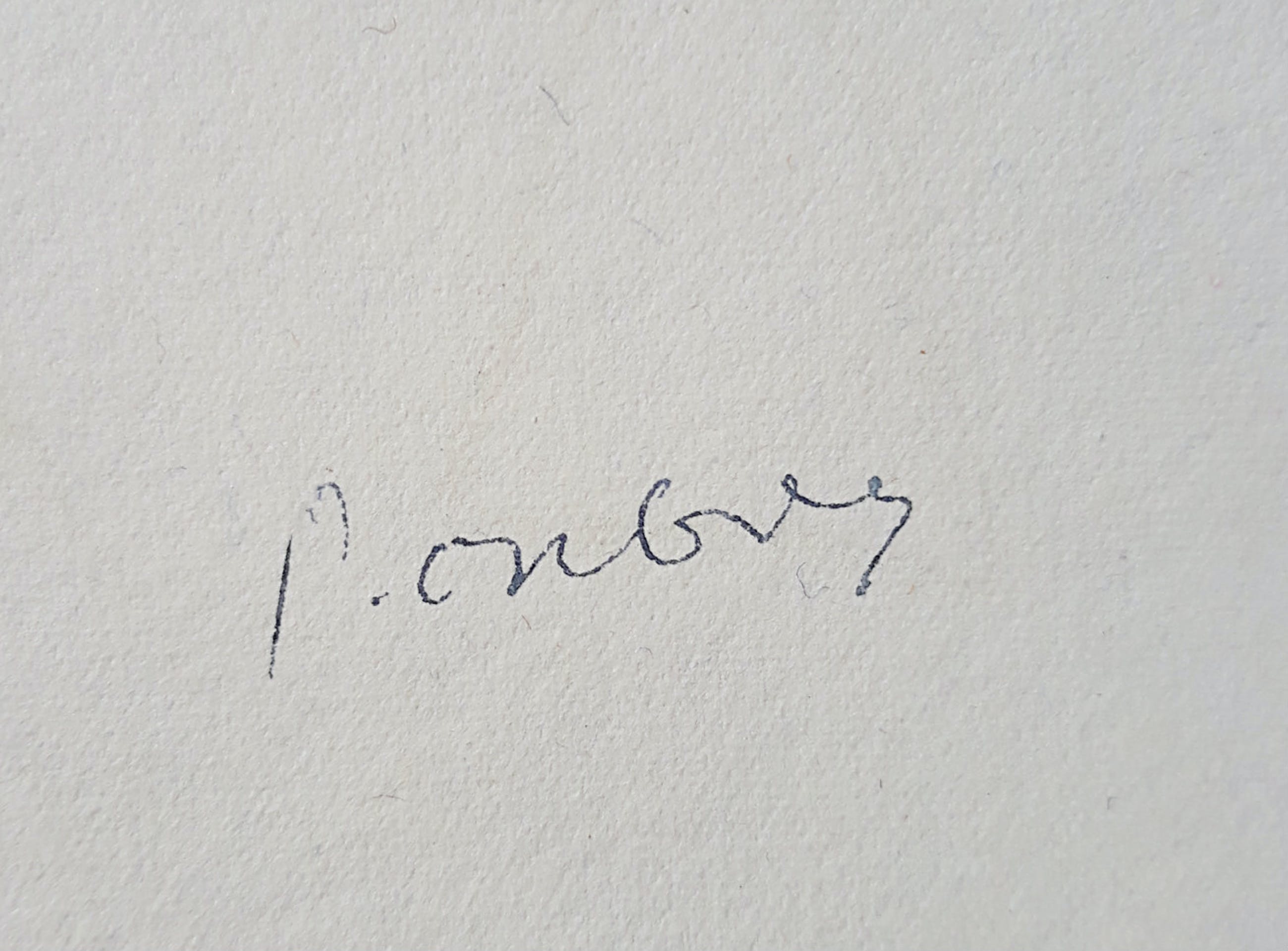 Litho op papier, met de hand ingekleurd en in verso met pen gesigneerd door Ouborg zelf. In goede conditie; aan de achterkant zitten wel twee vierkantjes taperesten in de bovenhoeken die doorschijnen naar de voorkant. Ingelijst met passe-partout zijn die niet zichtbaar, het beeld zelf is uitstekend.