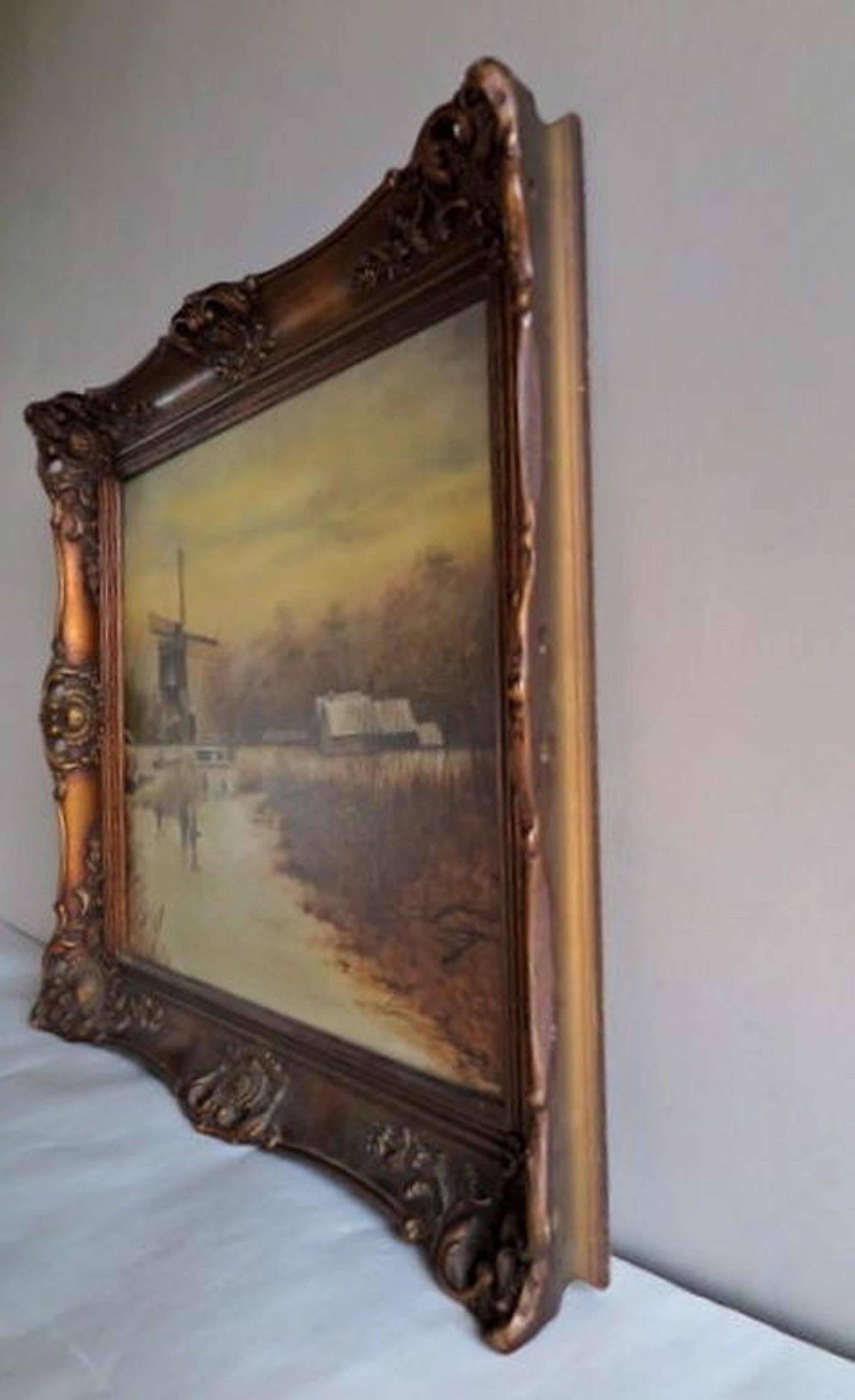 Hollands polderlandschap in de winter. Gevat in een zeer fraaie vergulde sierlijst Afmetingen: 74 x 67 x 9,5 cm (lijst) en 60 x 50 cm (doek)