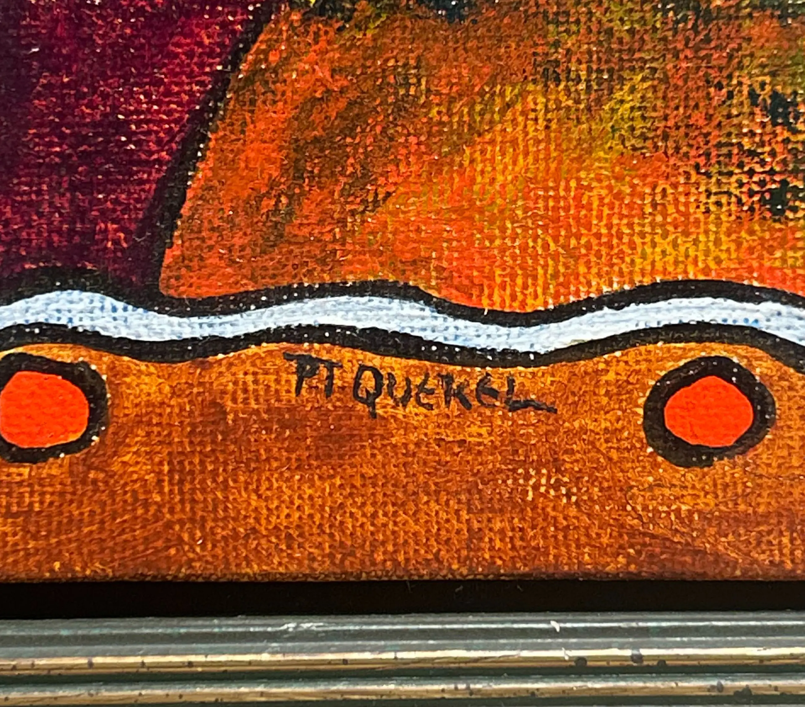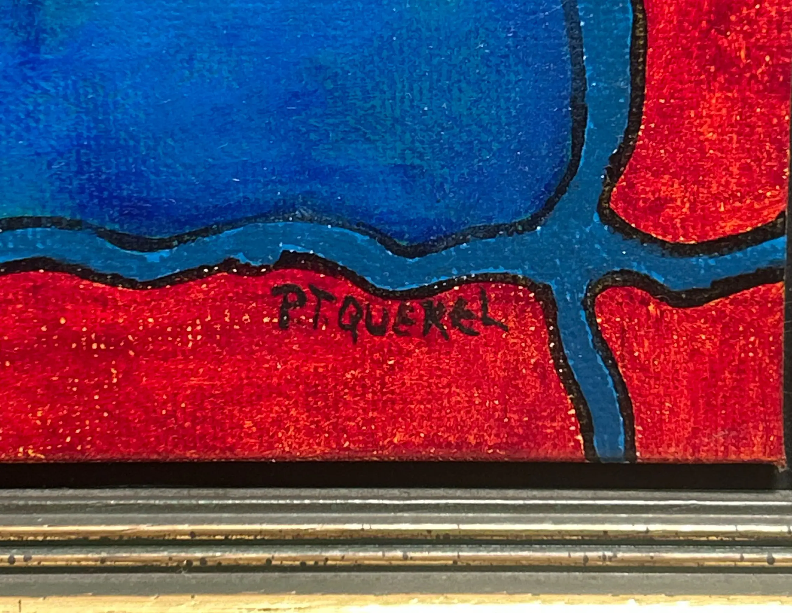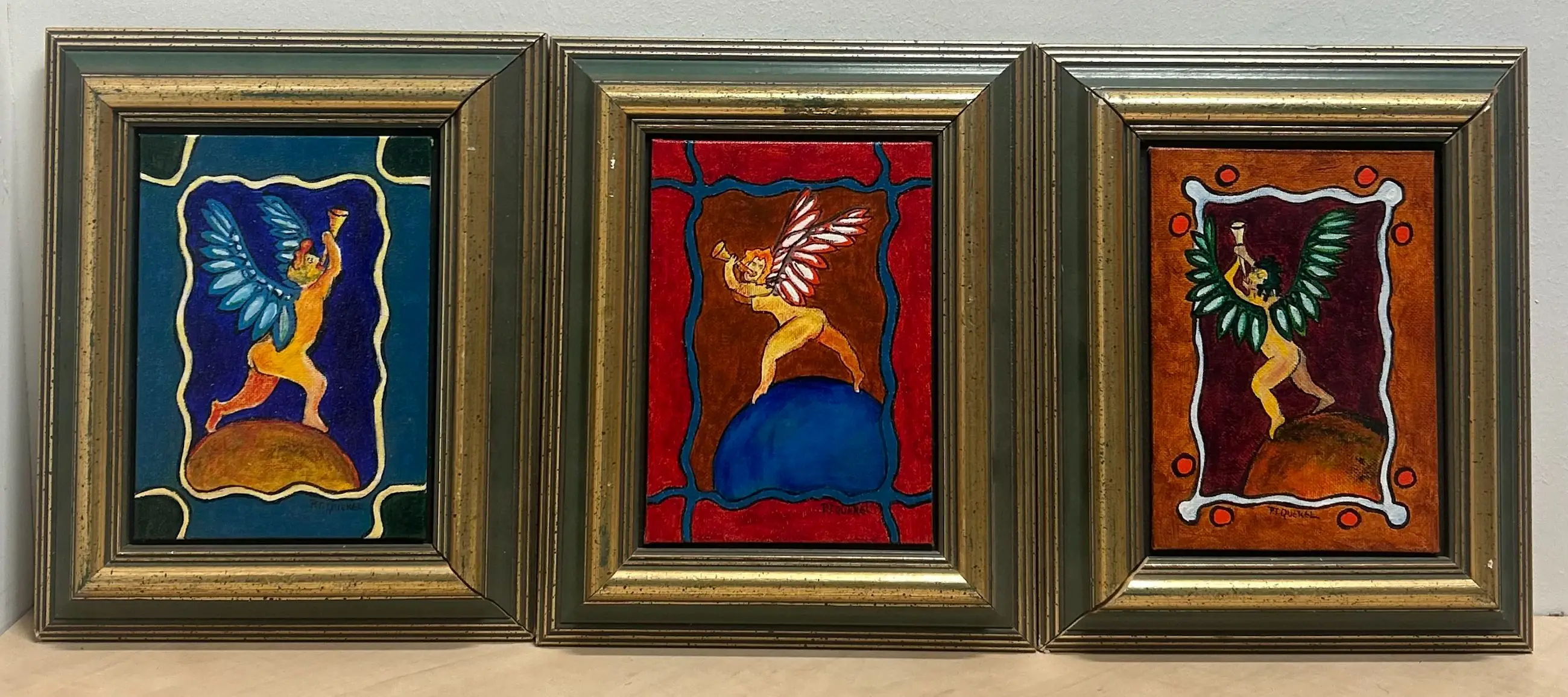 Drie charmante schilderijtjes van Piet Quekel, uitgevoerd in acryl op doek. De werken hebben een prettig klein formaat en zijn daardoor ideaal voor een kleinere wand, nis of als combinatie in een speelse compositie.