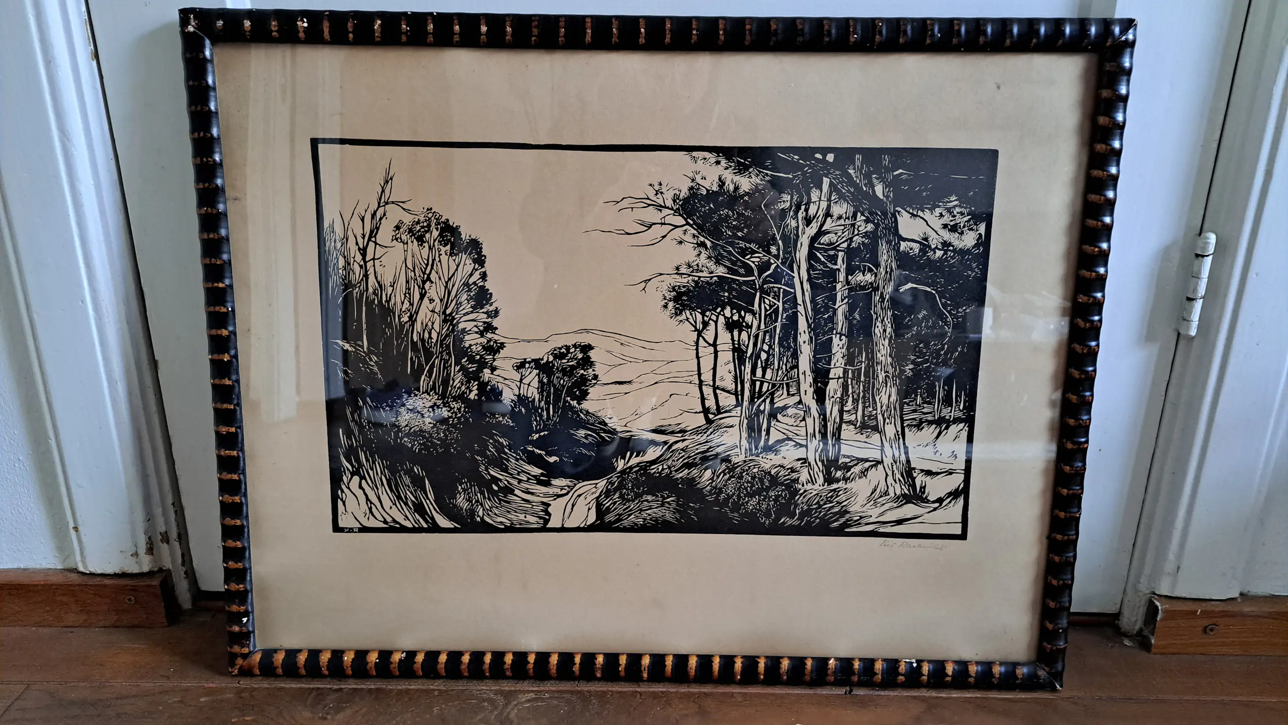 Prachtig duinlandschap van Piet Rackwitsz (1892 - 1968). Grafiek/hout/linosnede/linodruk. Gesigneerd. Originele lijst met wel wat kleine beschadigingen maar zijn zeer beperkt. Afmeting lijst 67 x 52 cm.