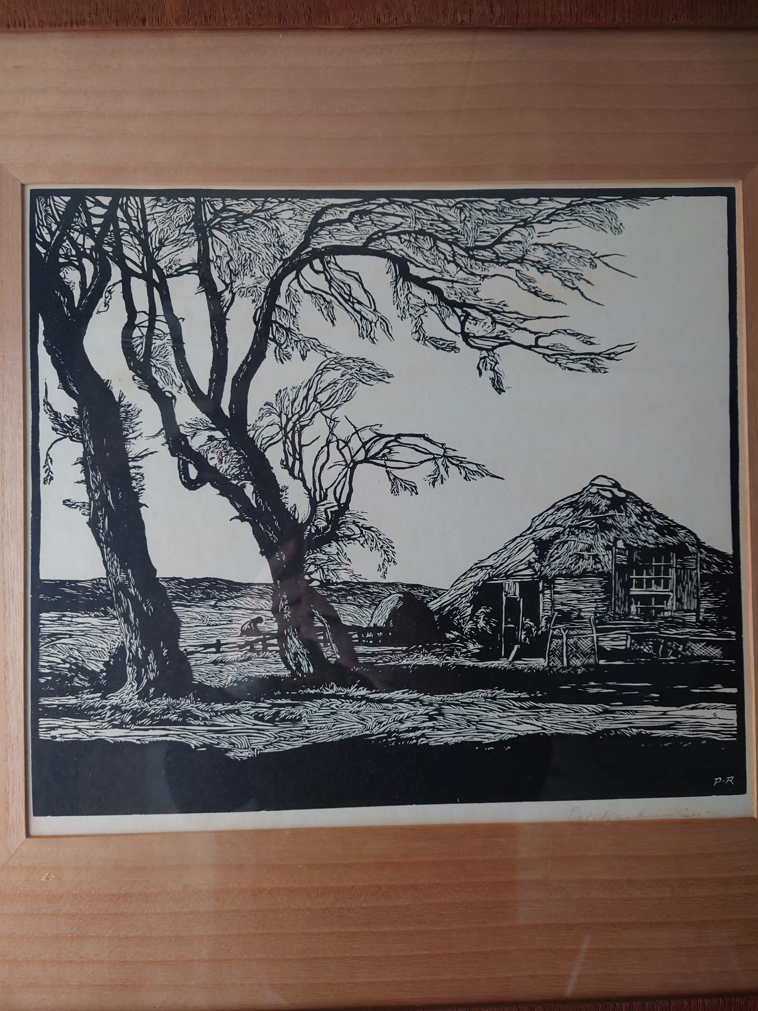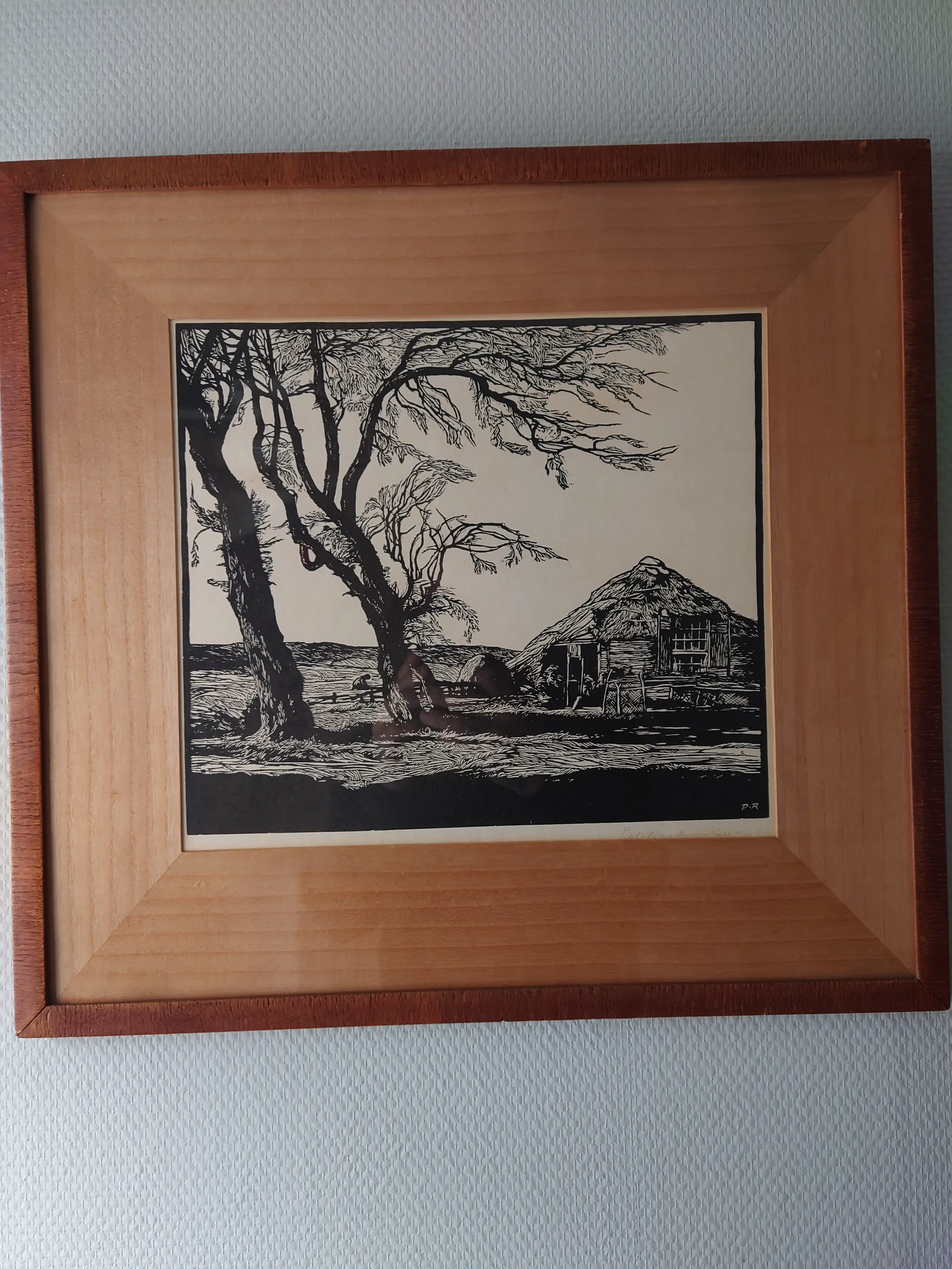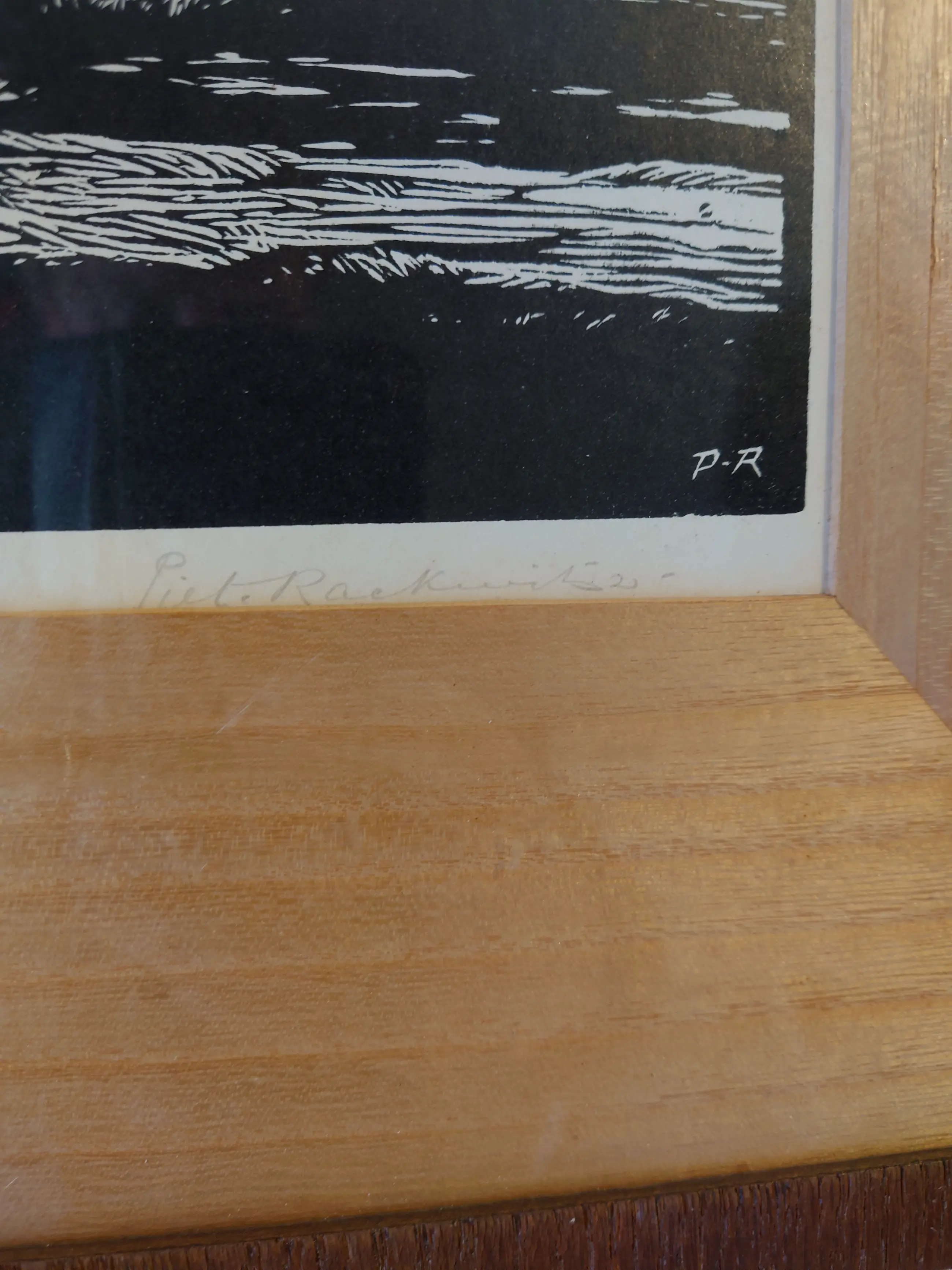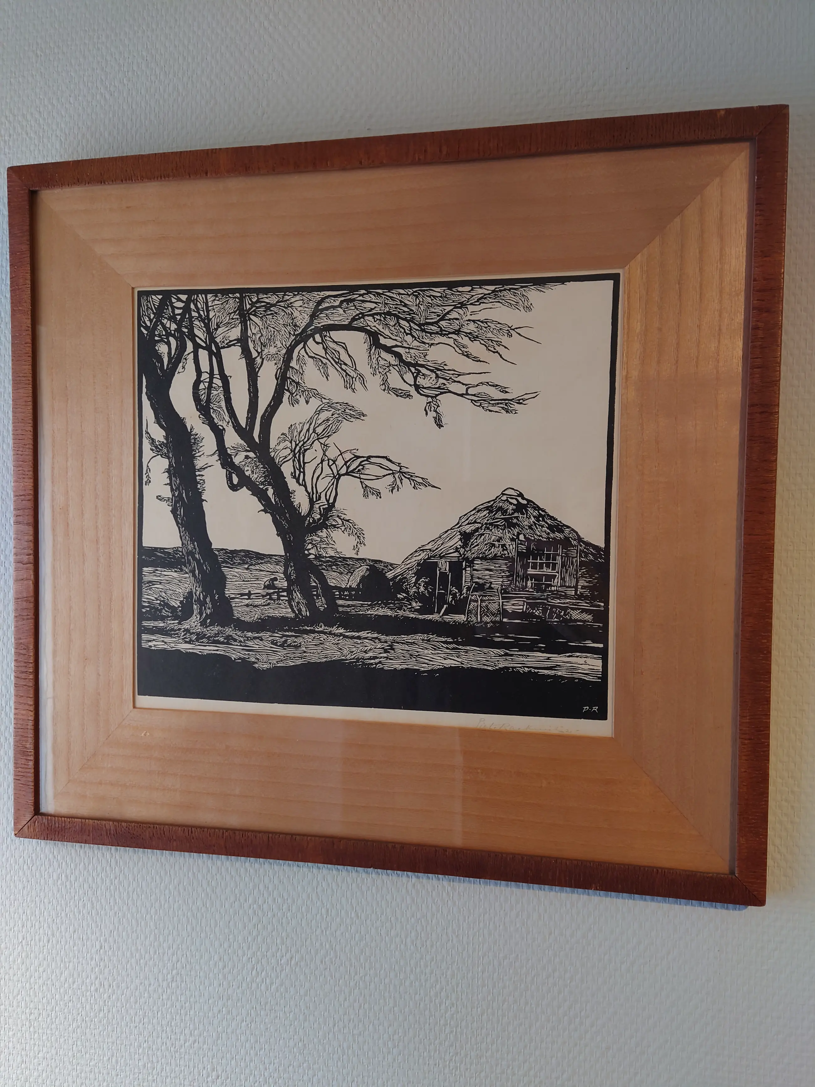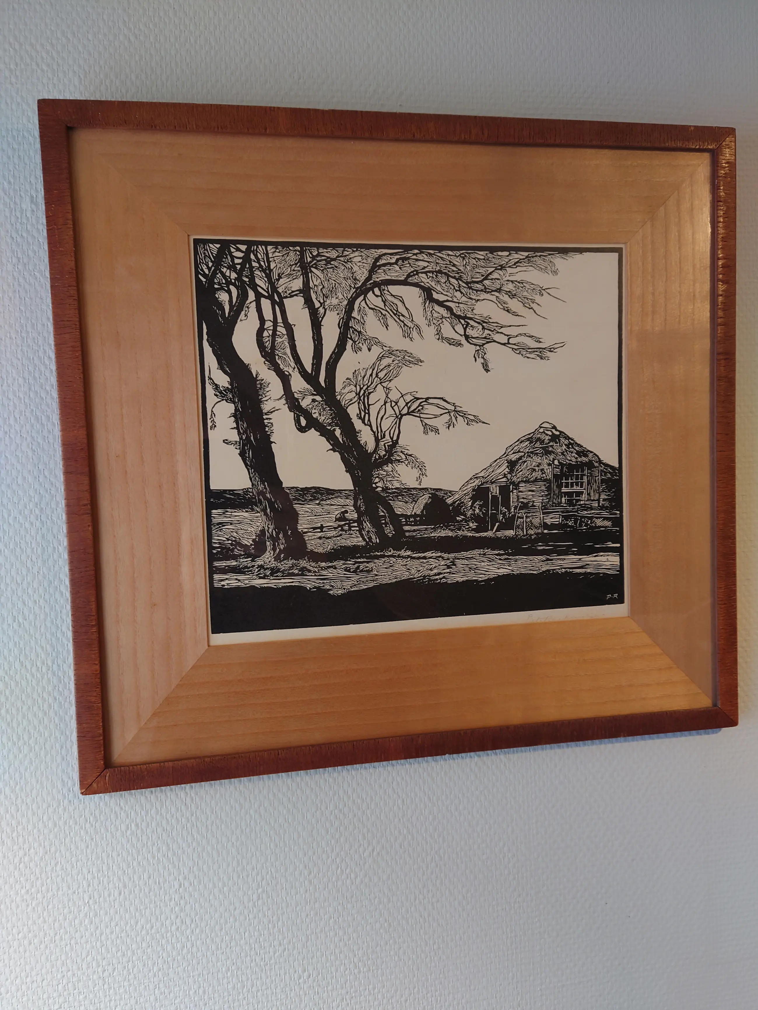 Mooie in perfecte staat verkerende ets van Piet Rackwitsz. Ingelijst achter glas. Boerderij met land en bomen.