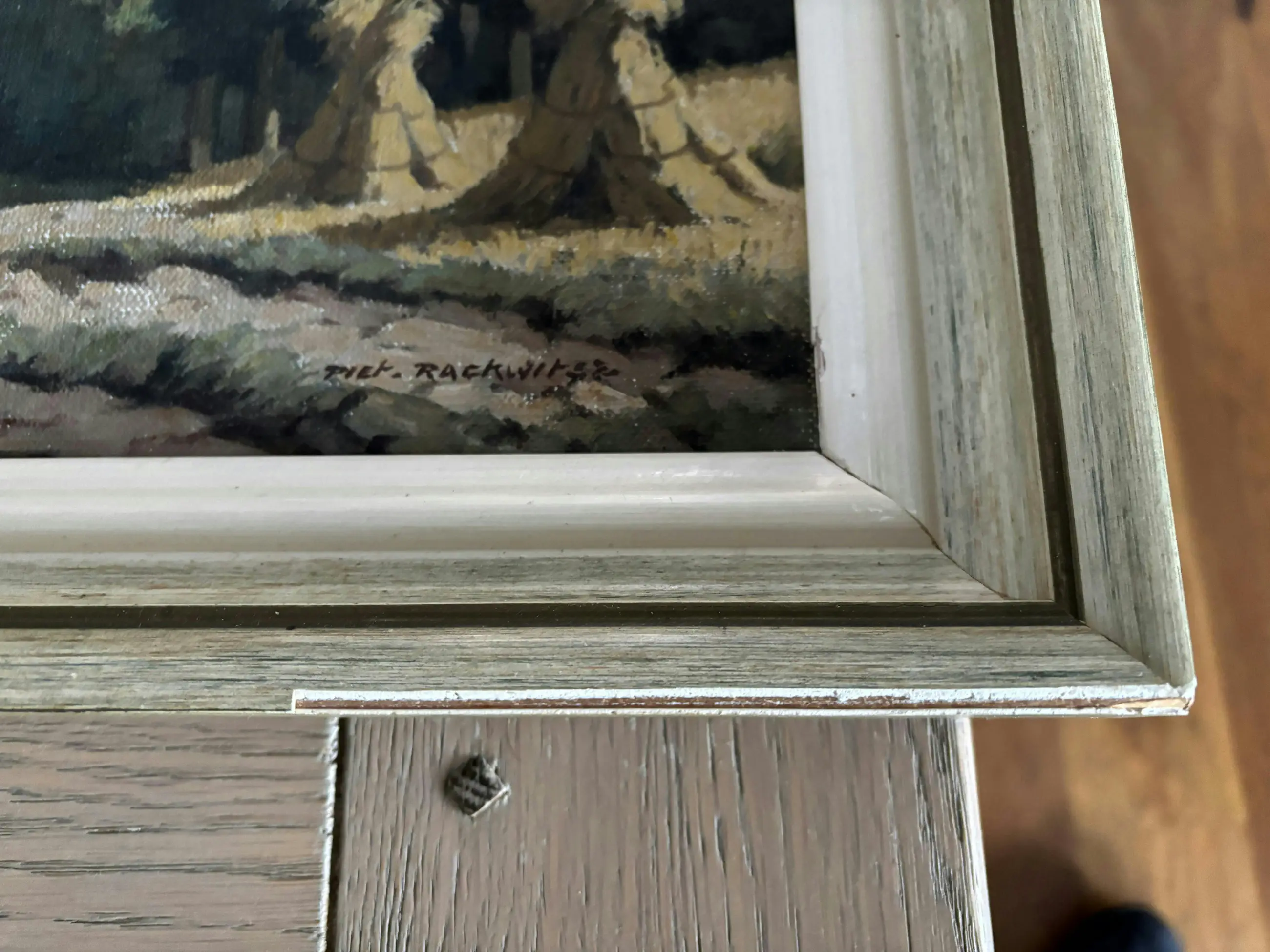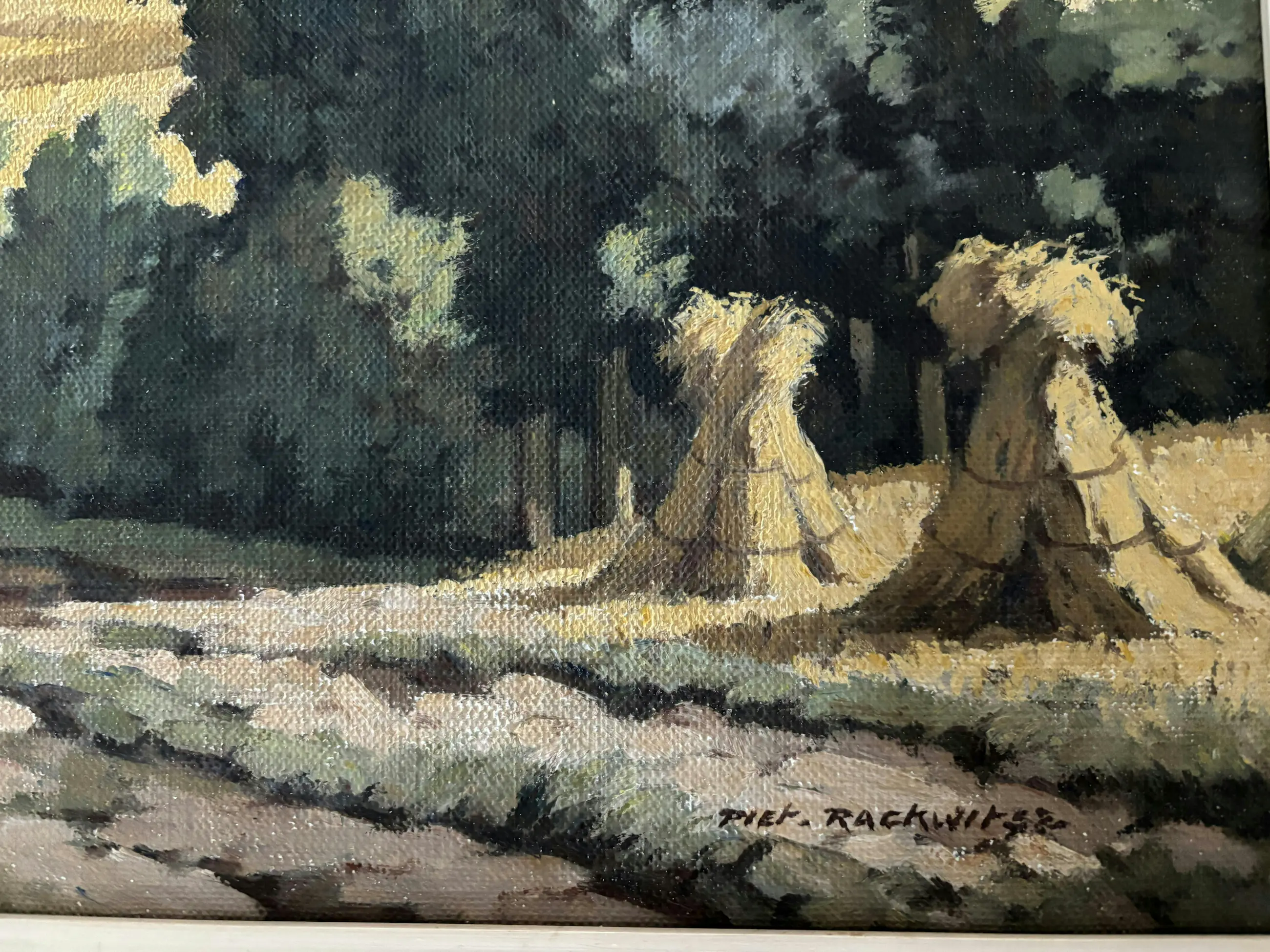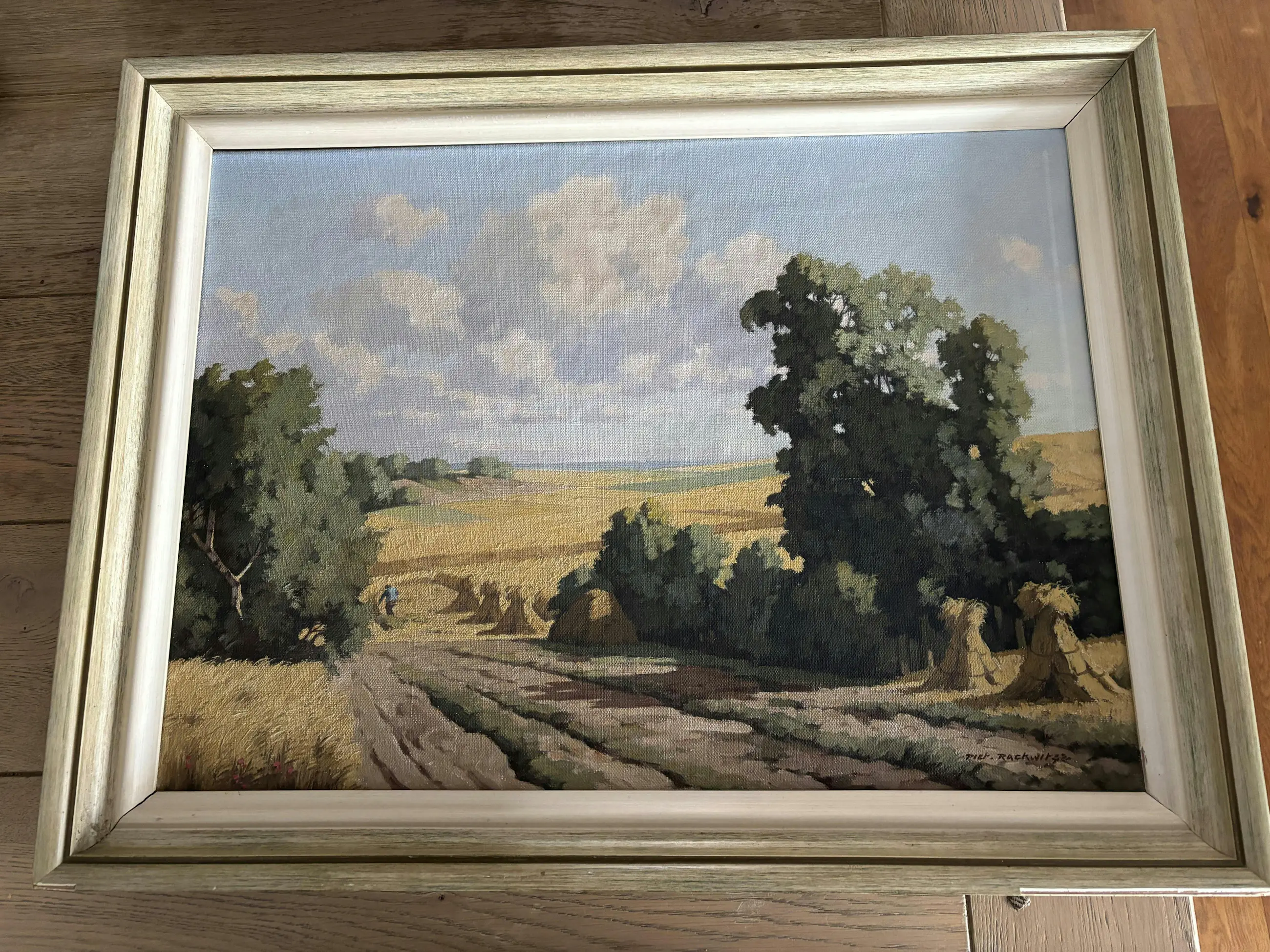 Het aangeboden schilderij is afkomstig van een oudoom, die een vriend was van de schilder Piet Rackwitsz. Via mijn ouders is het in mijn bezit gekomen. Vermoedelijk geschilderd in de periode 1945-1955. Het toont een landschap van een korenveld met bossages.