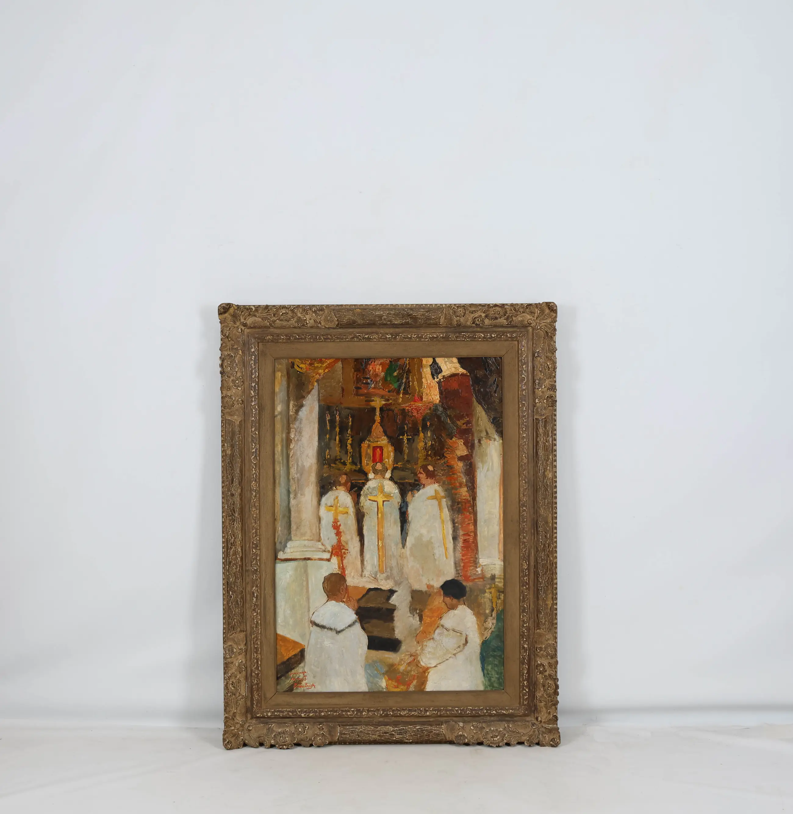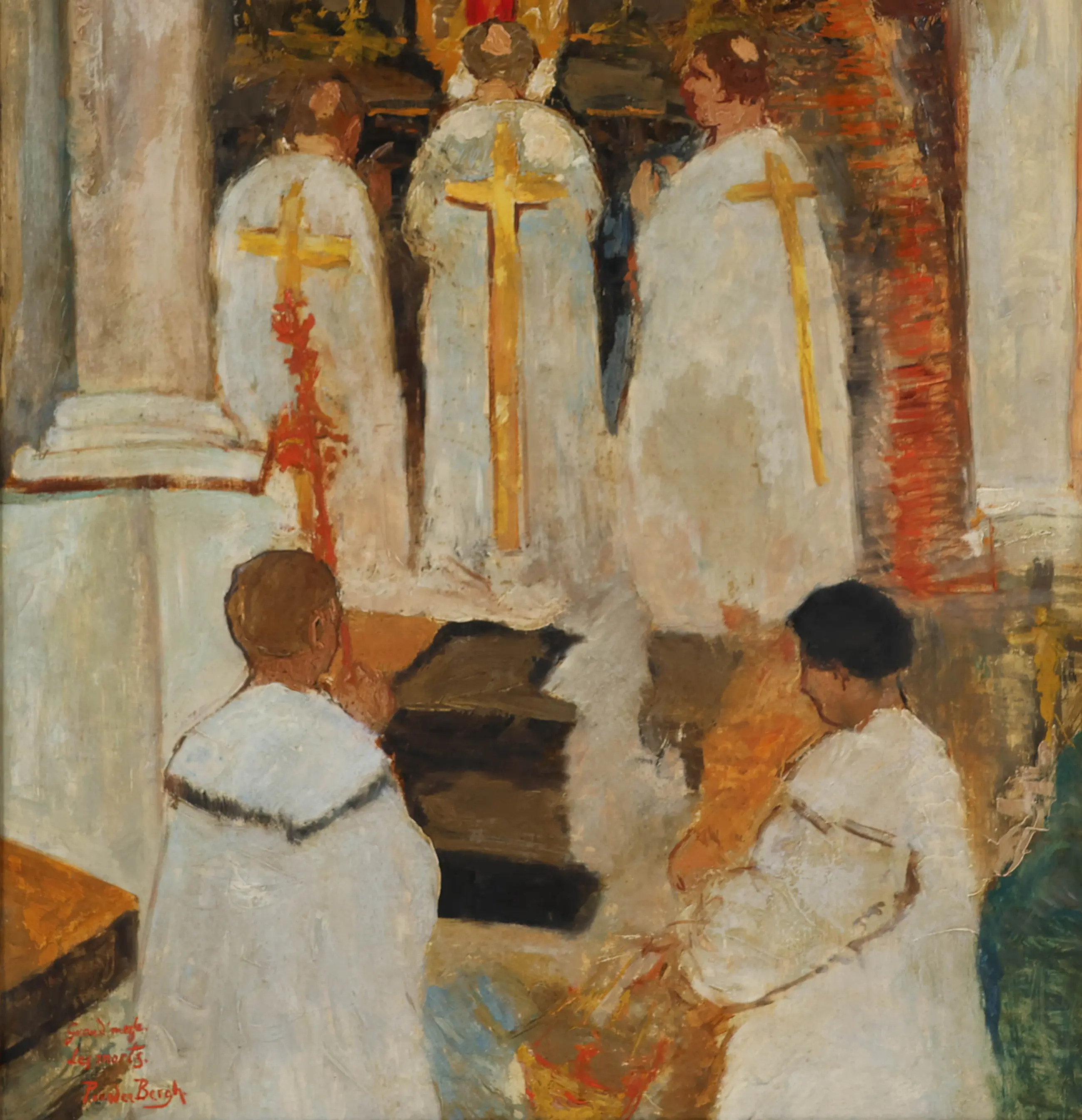 Dit is een olieverfschilderij van Piet van den Bergh (1865-1950). Hoewel het onderwerp een kerkdienst is – een scène die vaak sober of donker wordt weergegeven – kiest Van den Bergh juist voor een opvallend lichte en serene atmosfeer. Grand’ messe des morts is een plechtige mis voor de overledenen, een hoge liturgische mis binnen de katholieke traditie die wordt opgedragen ter nagedachtenis aan de doden.