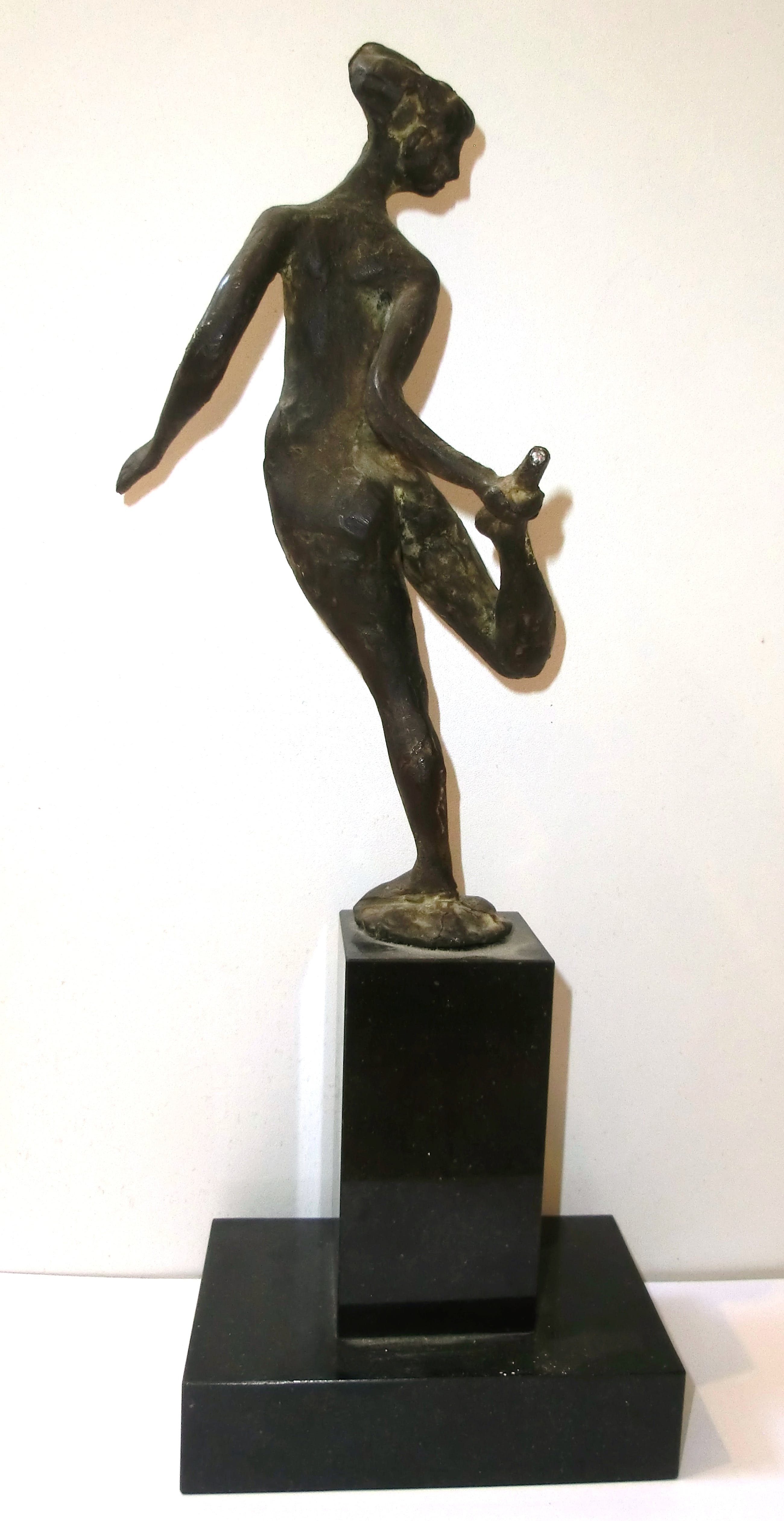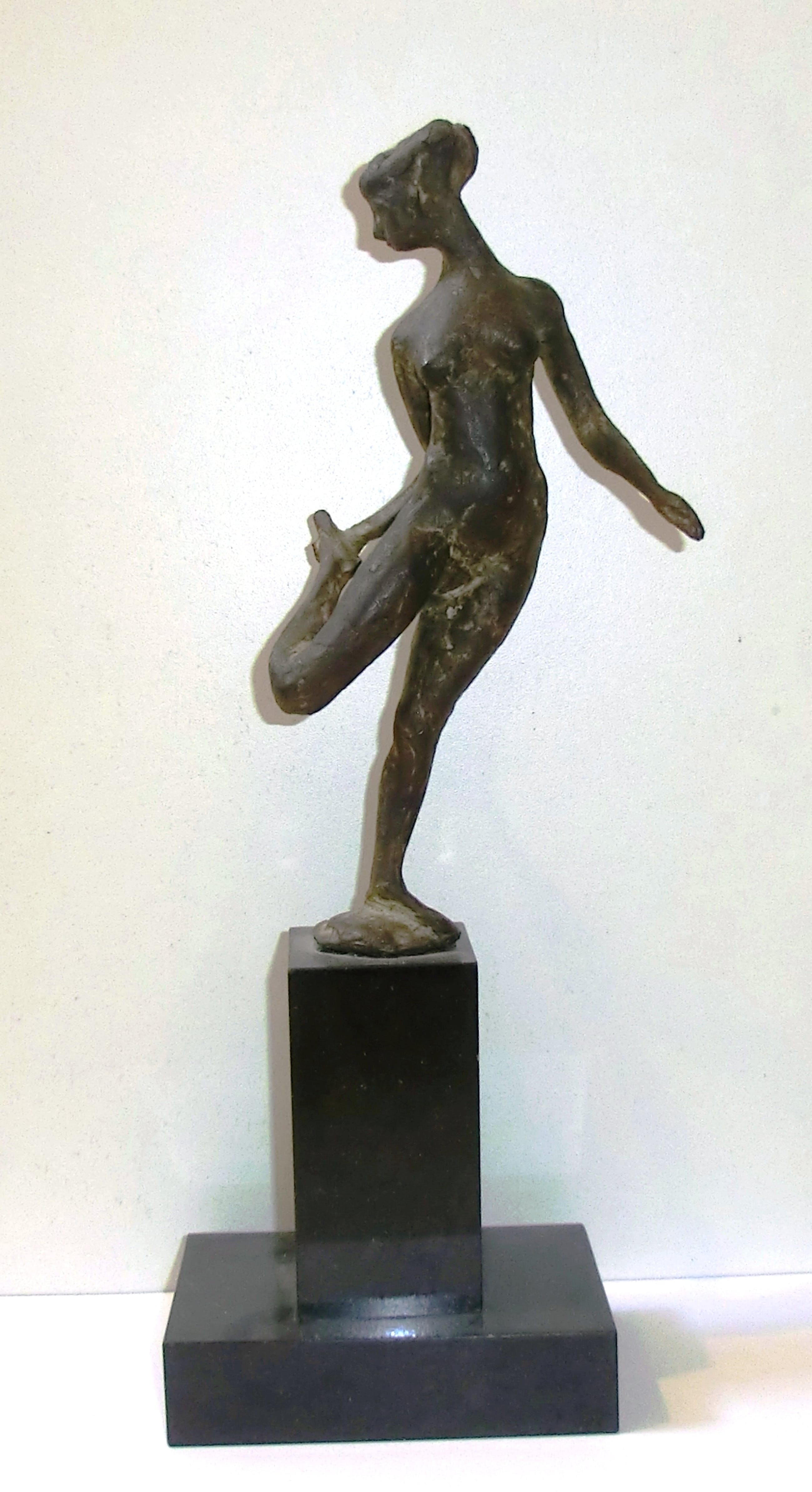 Fraai beeldje van de Haarlemse kunstenaar Piet van Heerden. Hij maakte de meest prachtige kleine beeldjes van naakten in allerlei houdingen. Werk van hem is o.a. aanwezig in de collectie van het Frans Halsmuseum in Haarlem. Piet van Heerden zijn beelden en vooral zijn kleine plastieken hebben hem in Nederland als wel daarbuiten een grote reputatie bezorgd. Hij is altijd trouw gebleven aan de figuratie. Beelden van een hoge kwaliteit en onmiddellijk herkenbaar als werk van Van Heerden. Hij werd verder geroemd om de patina van zijn sculpturen. Een versie van het beeldje is te zien op blz 108 en 109 van het boek "Piet van Heerden schilder, tekenaar, beeldhouwer" uit 2005 *Maten incl. sokkel: 35 x 12 x 8 cm Rechtstreeks van de kunstenaar verworven