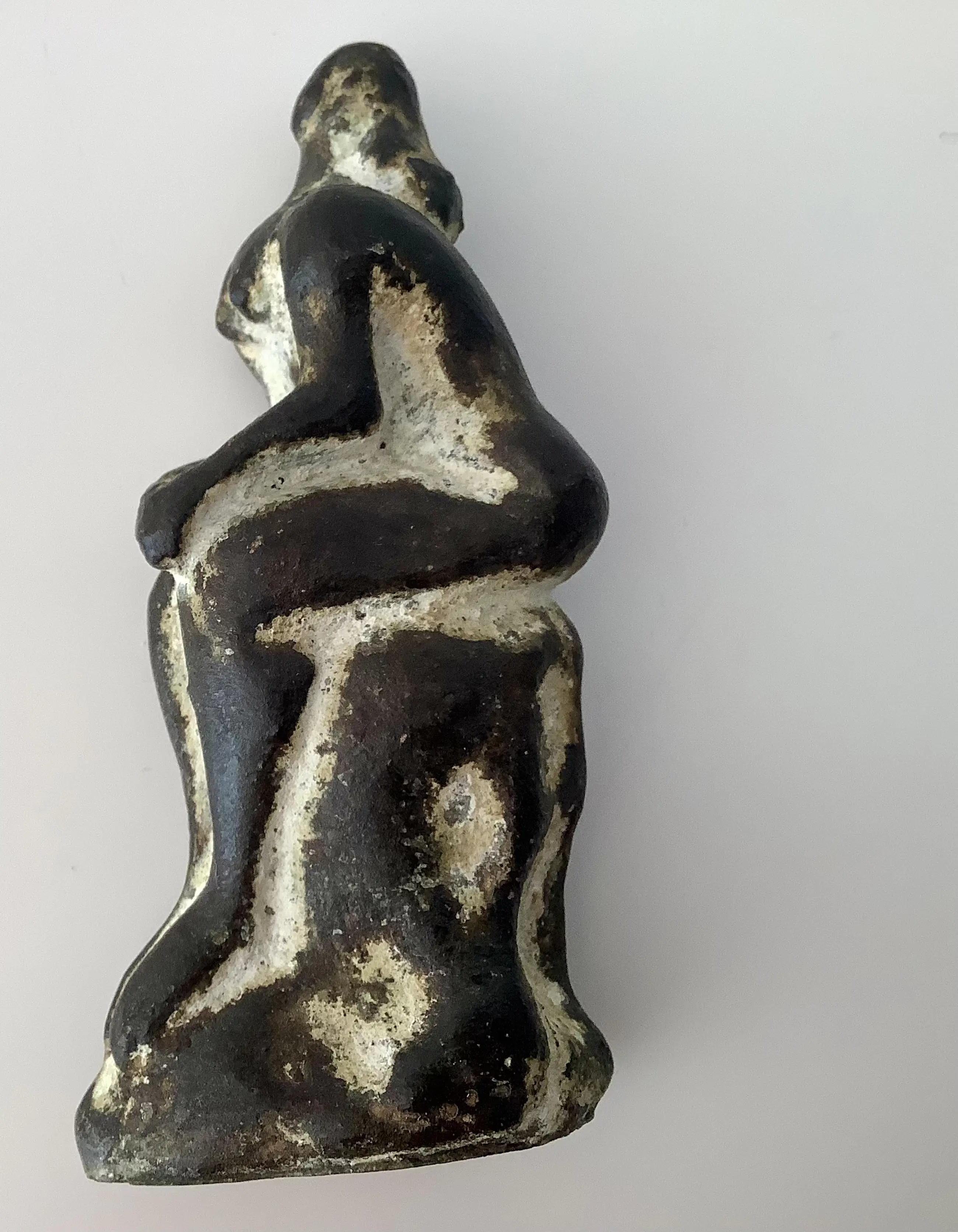 In de kenmerkende pose en met de speciale patina. Massief brons, klein maar krachtig en decoratief object.
