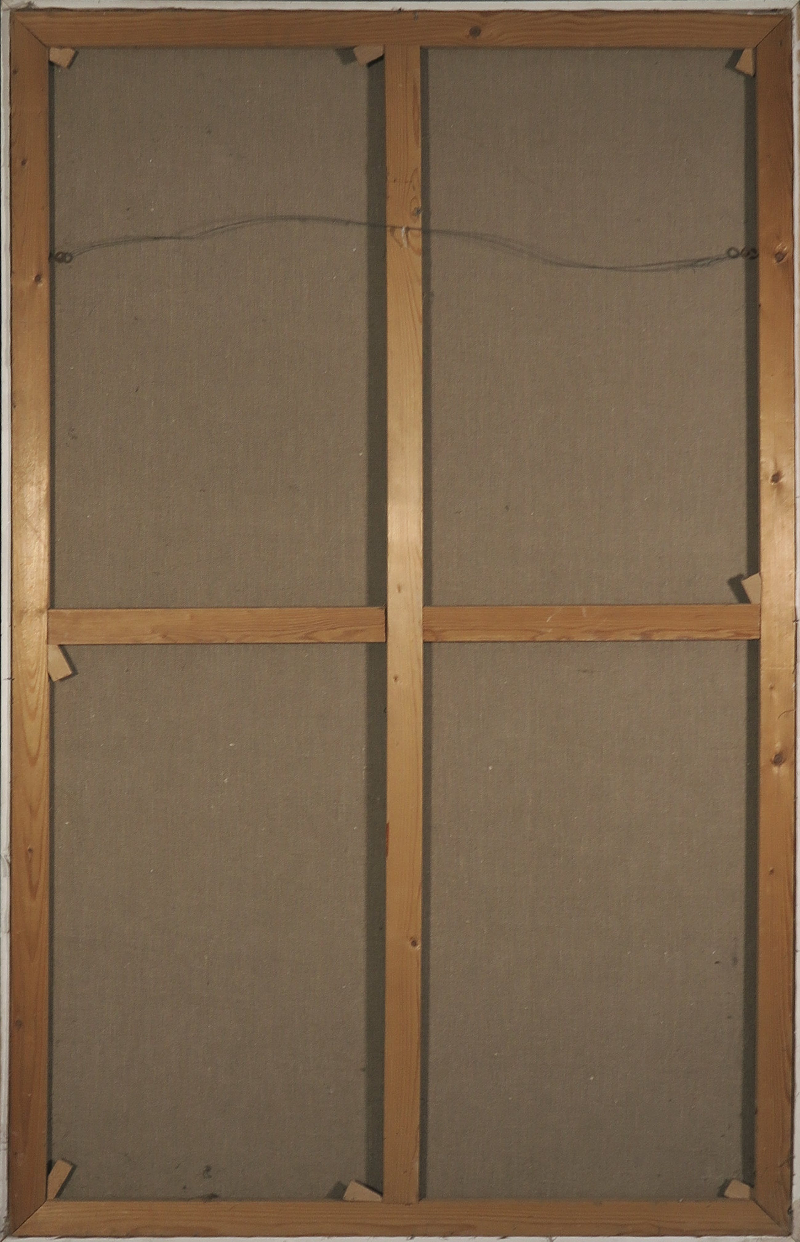 | In de hoeken wat zeer lichte golving van het doek. De lijst is iets beschadigd. | |