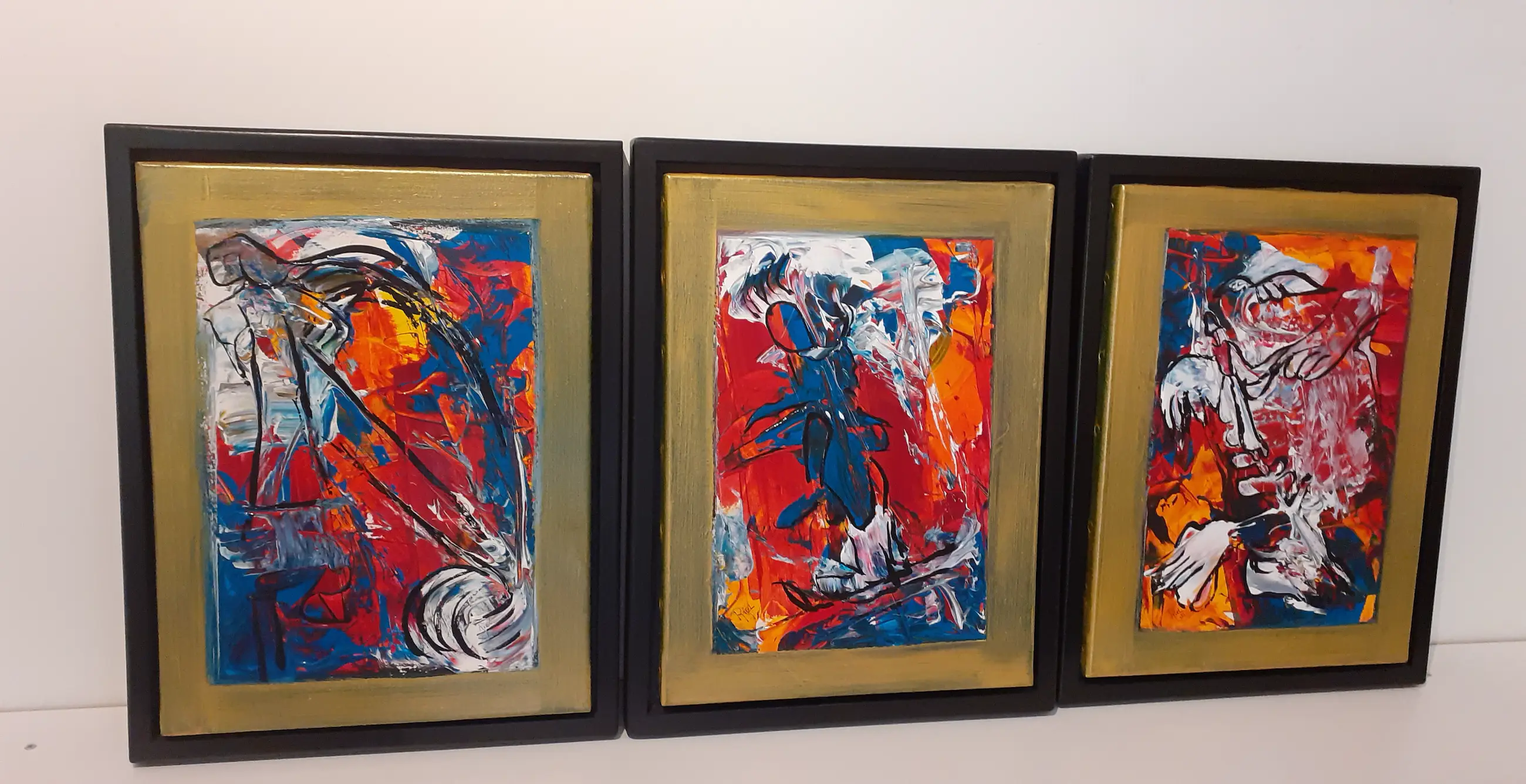 Prachtig, zeer kleurrijk drieluik (acrylverf dik aangebracht op schildersdoek) 'Vogels' van Piet van Riel .