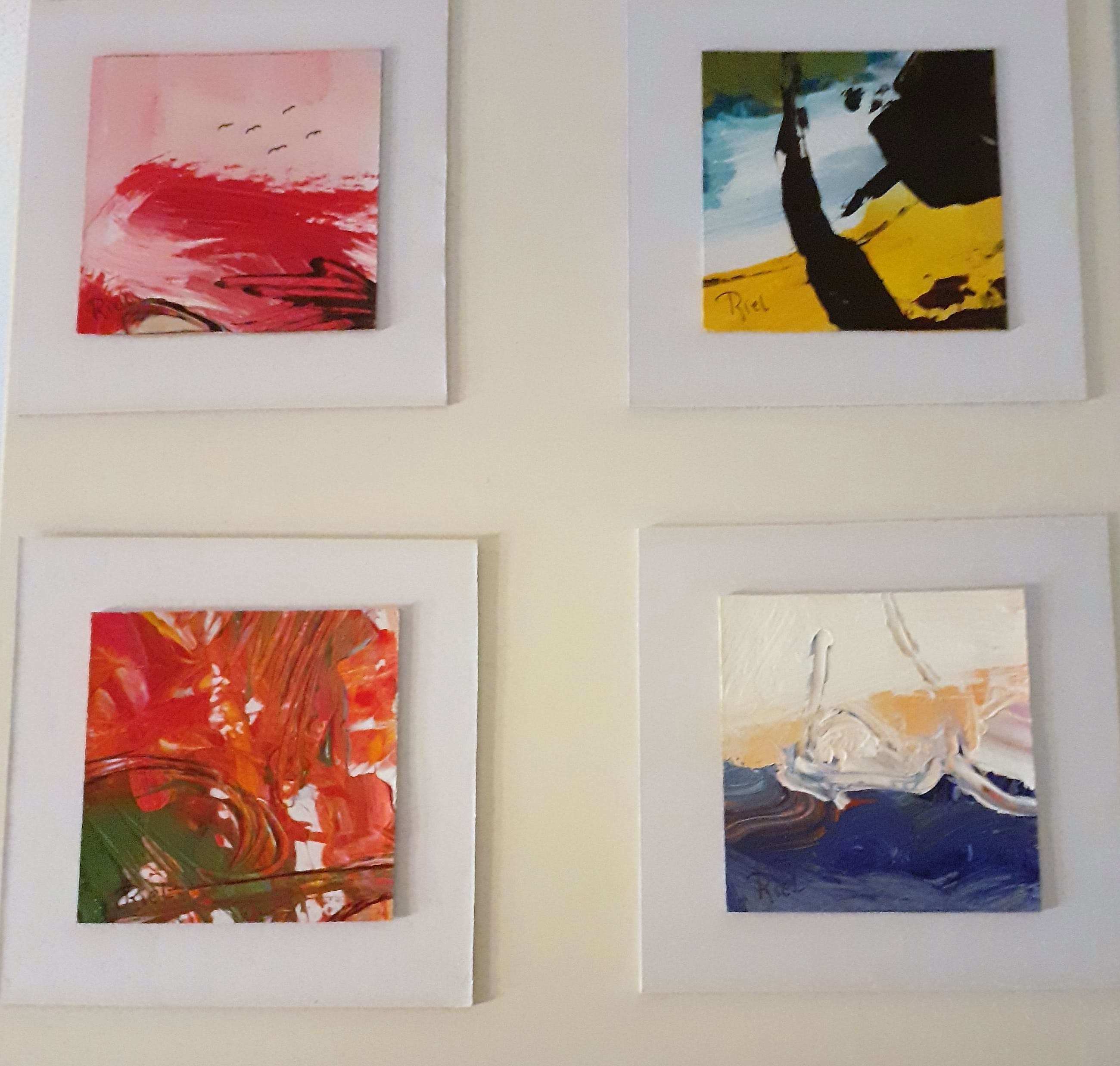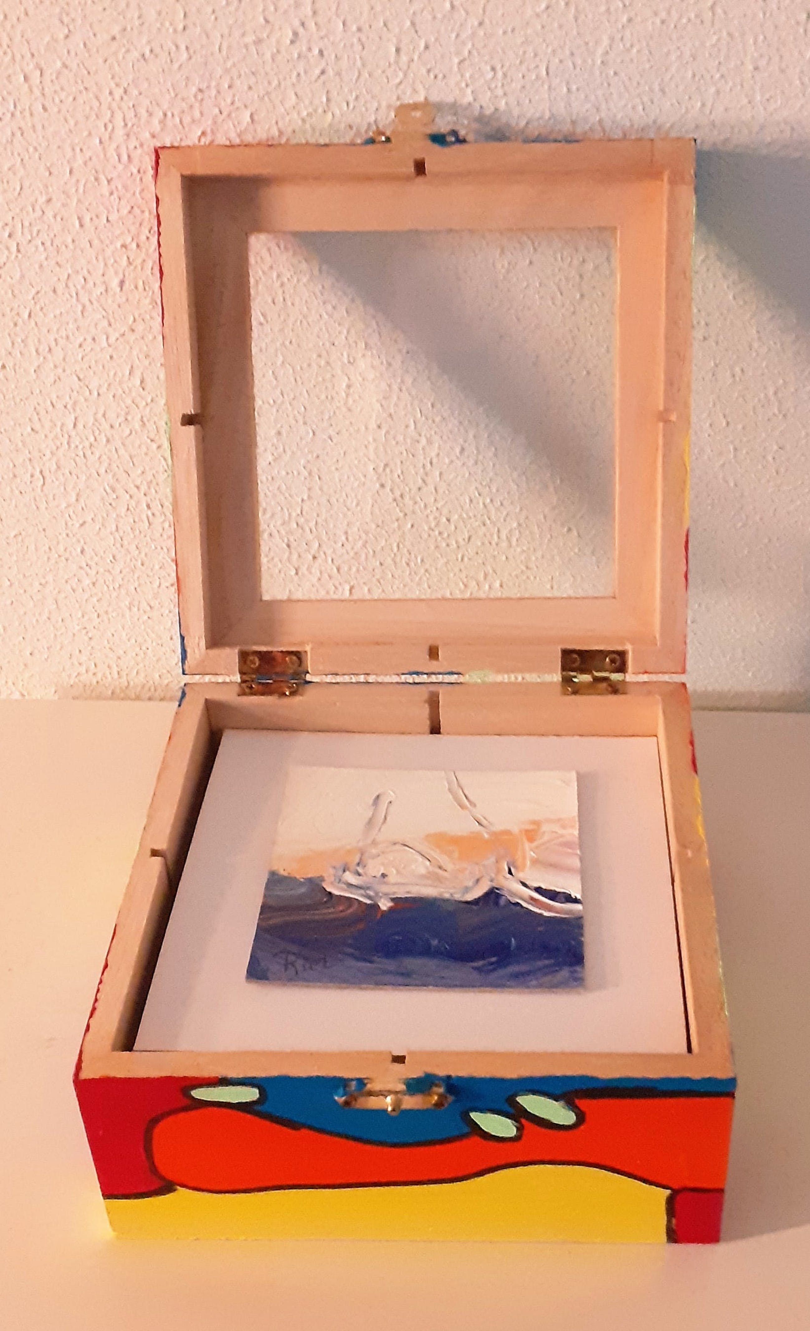 Kijkdoos met 15 schilderijtjes, origineel geschilderd door Piet van Riel Foto's van schilderijtjes zijn bijgevoegd Alles, ook de doos, hand gesigneerd door kunstenaar Kijkdoos: 14 x 4 x 7,5 cm Schilderijtjes: 12 x 12 cm Enorm leuk object!
