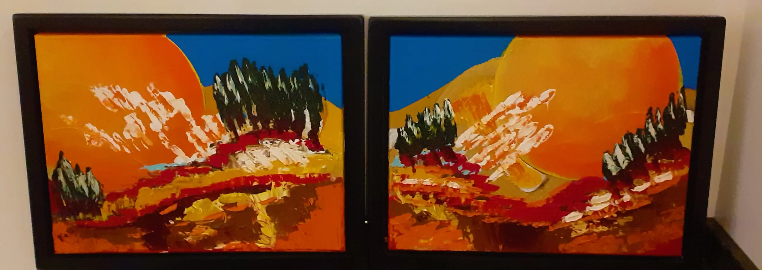 Tweeluik 'Kleurlandschap' Lijsten:Werken zijn zeer professioneel en degelijk ingelijst in zwarte baklijsten Prachtig, zeer kleurrijk tweeluik van kunstenaar Piet van Riel De acrylverf is zeer dik opgebracht, geeft 2D-effect, kleuren zijn prachtig (in het echt nog mooier dan op de foto)