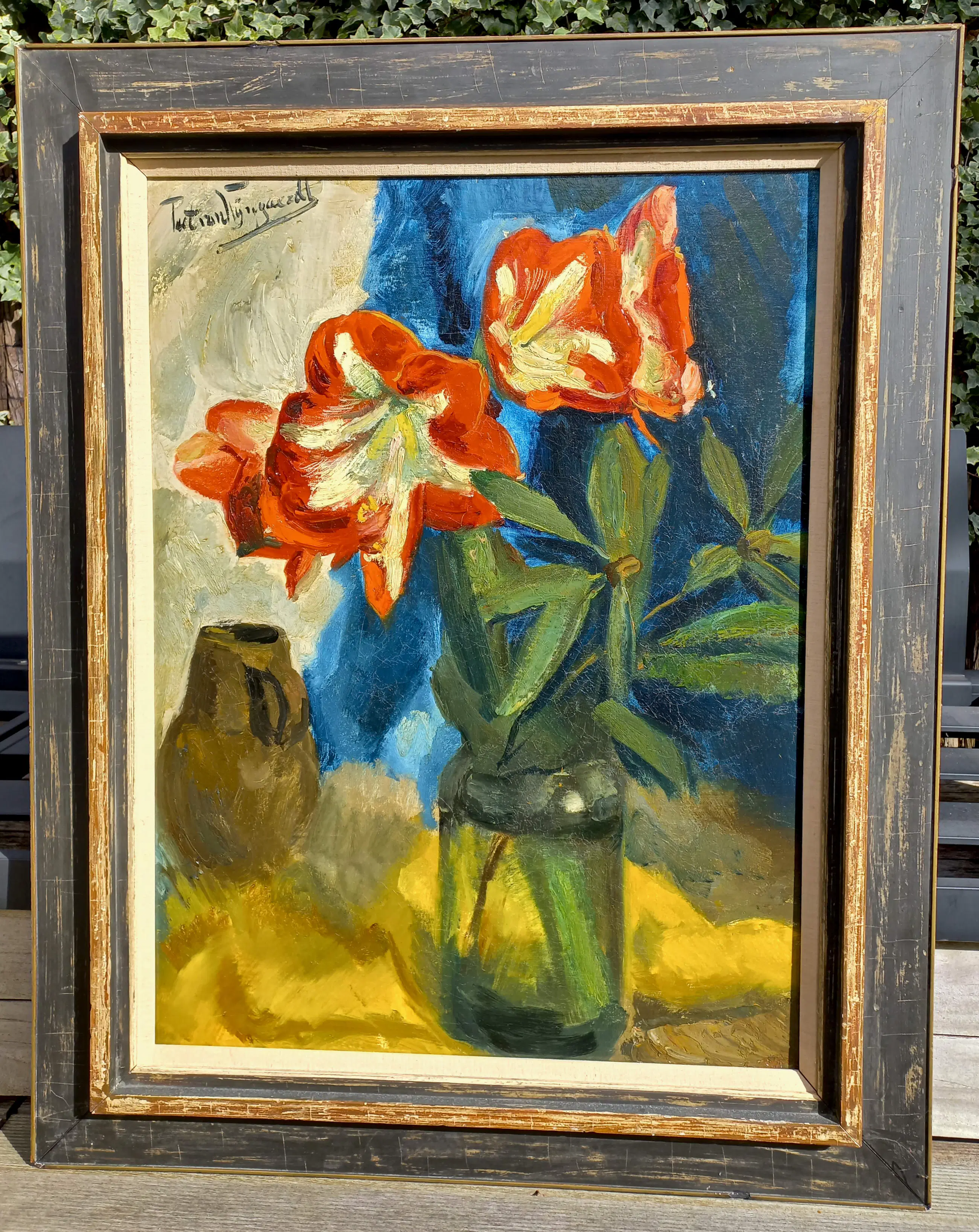 Prachtig, zeer kleurrijk stilleven van Piet van Wijngaerdt. Olieverf op doek, professioneel gedoubleerd, gesigneerd linksboven, in nette lijst. Alles in zeer goede conditie.