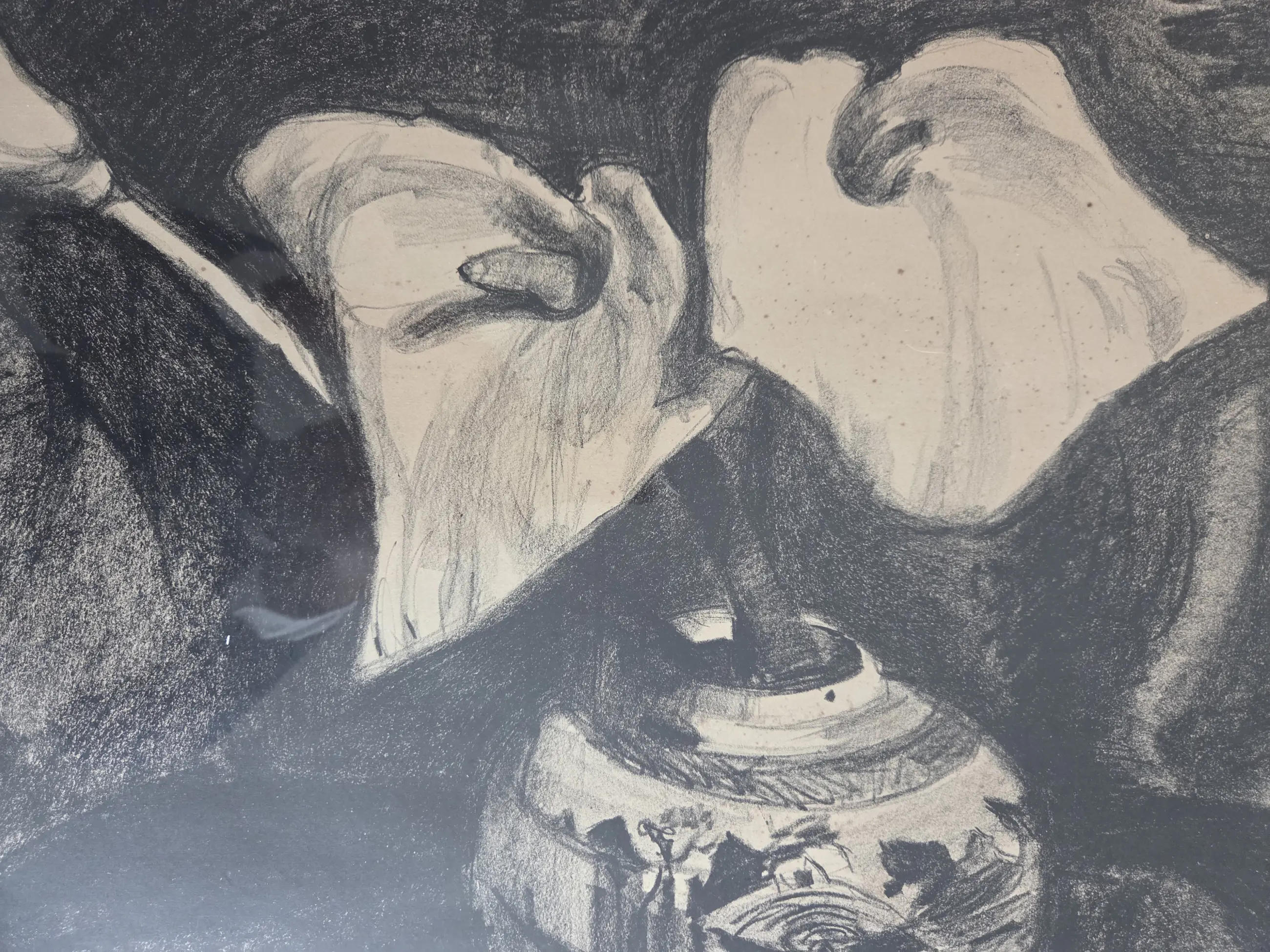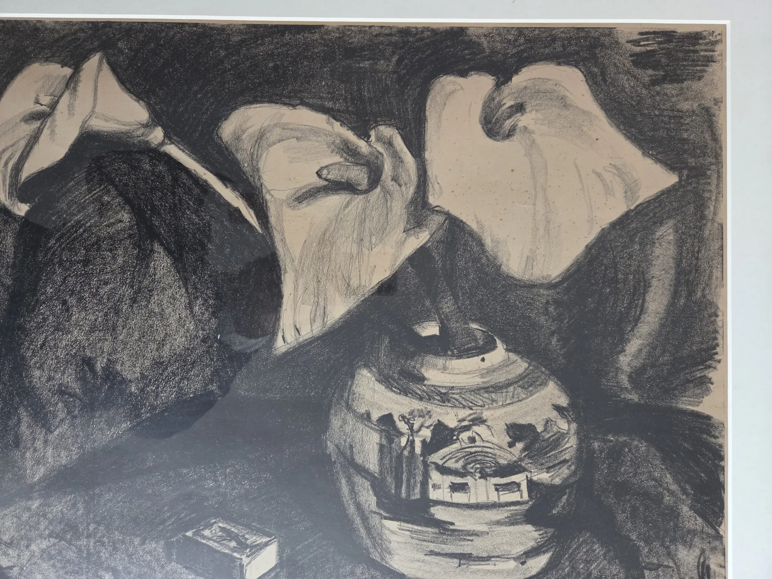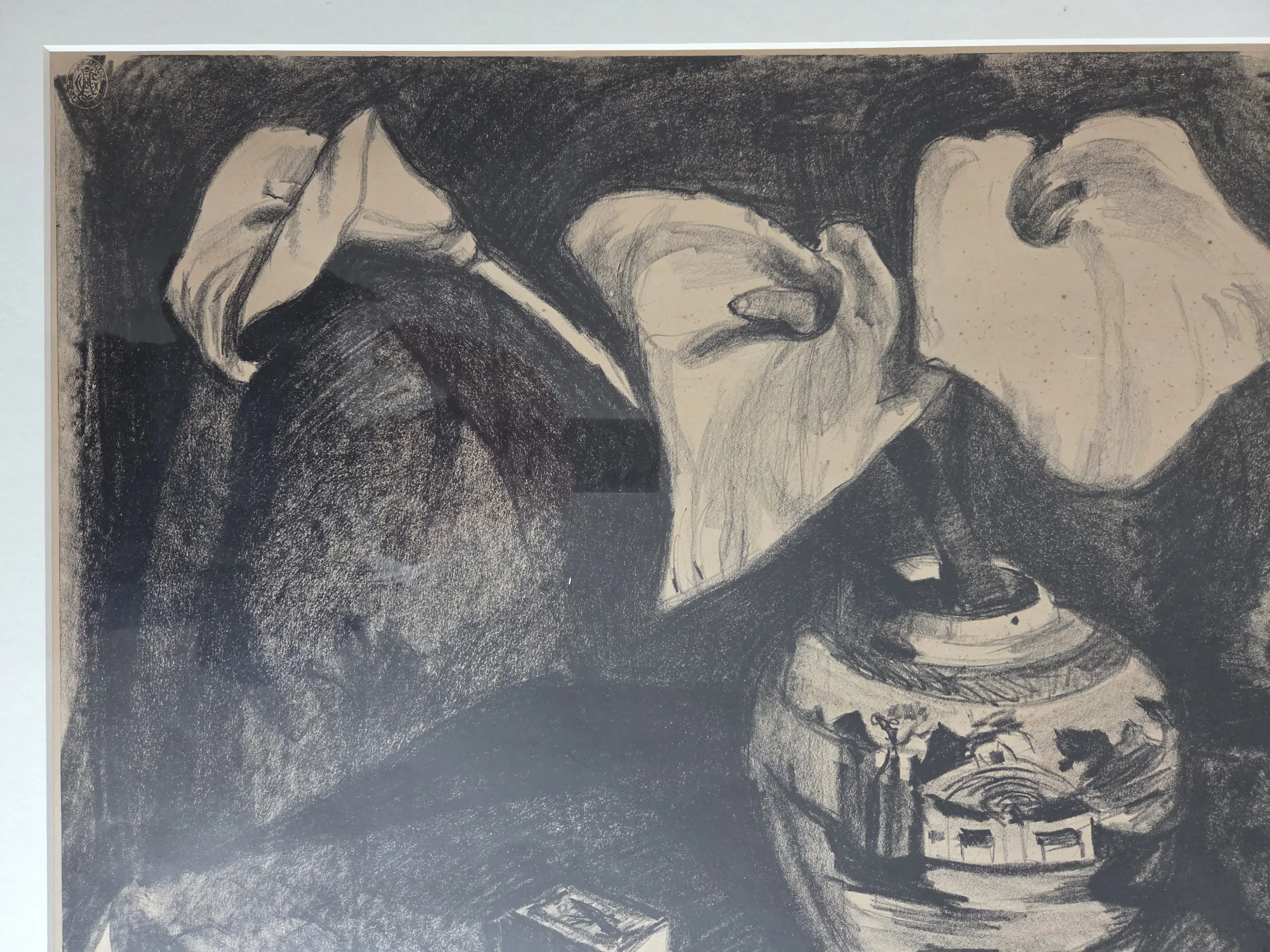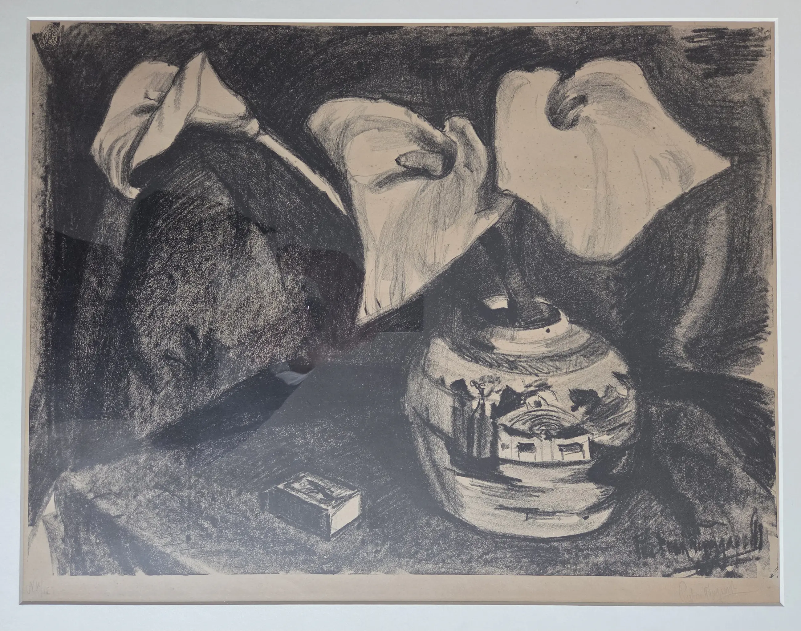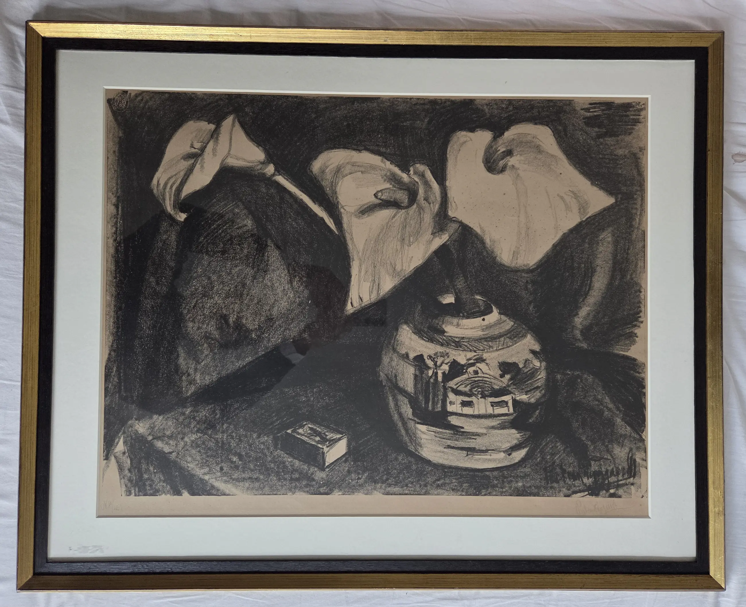 Piet van Wijngaerdt - Aronskelken in gemberpot. Prachtig ingelijst.
