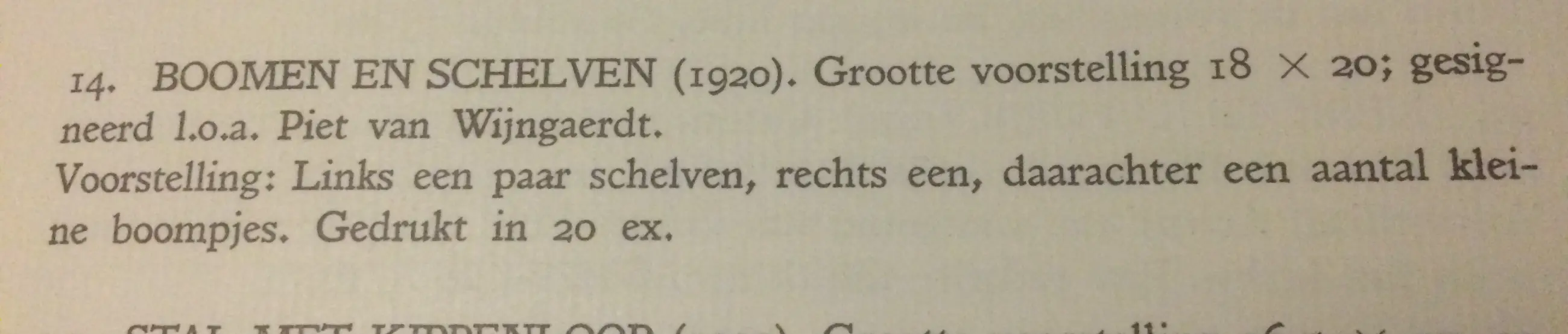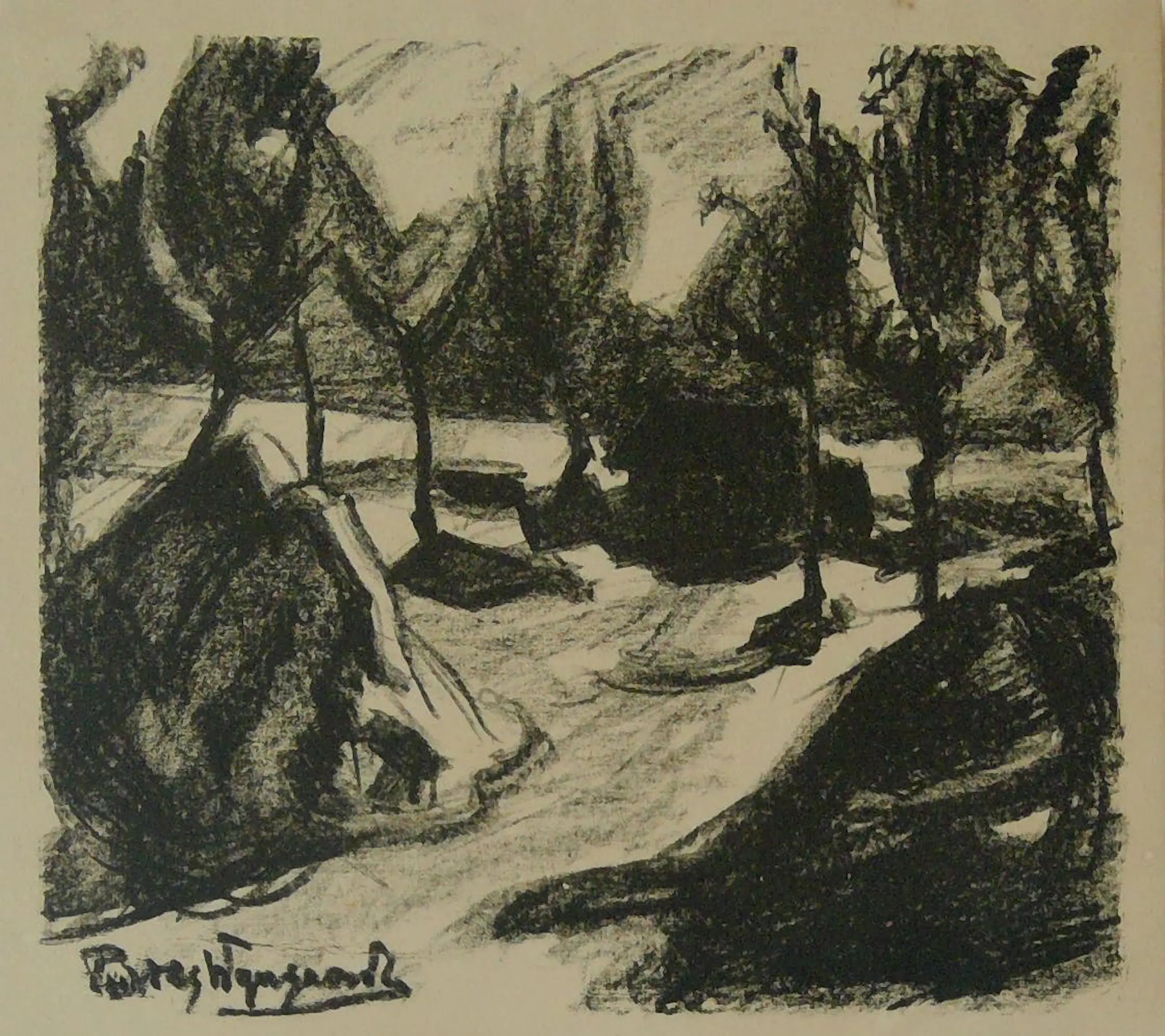 Zeldzame Litho: Bomen en schelven. 18x20 cm (Plasschaert 14) 1920