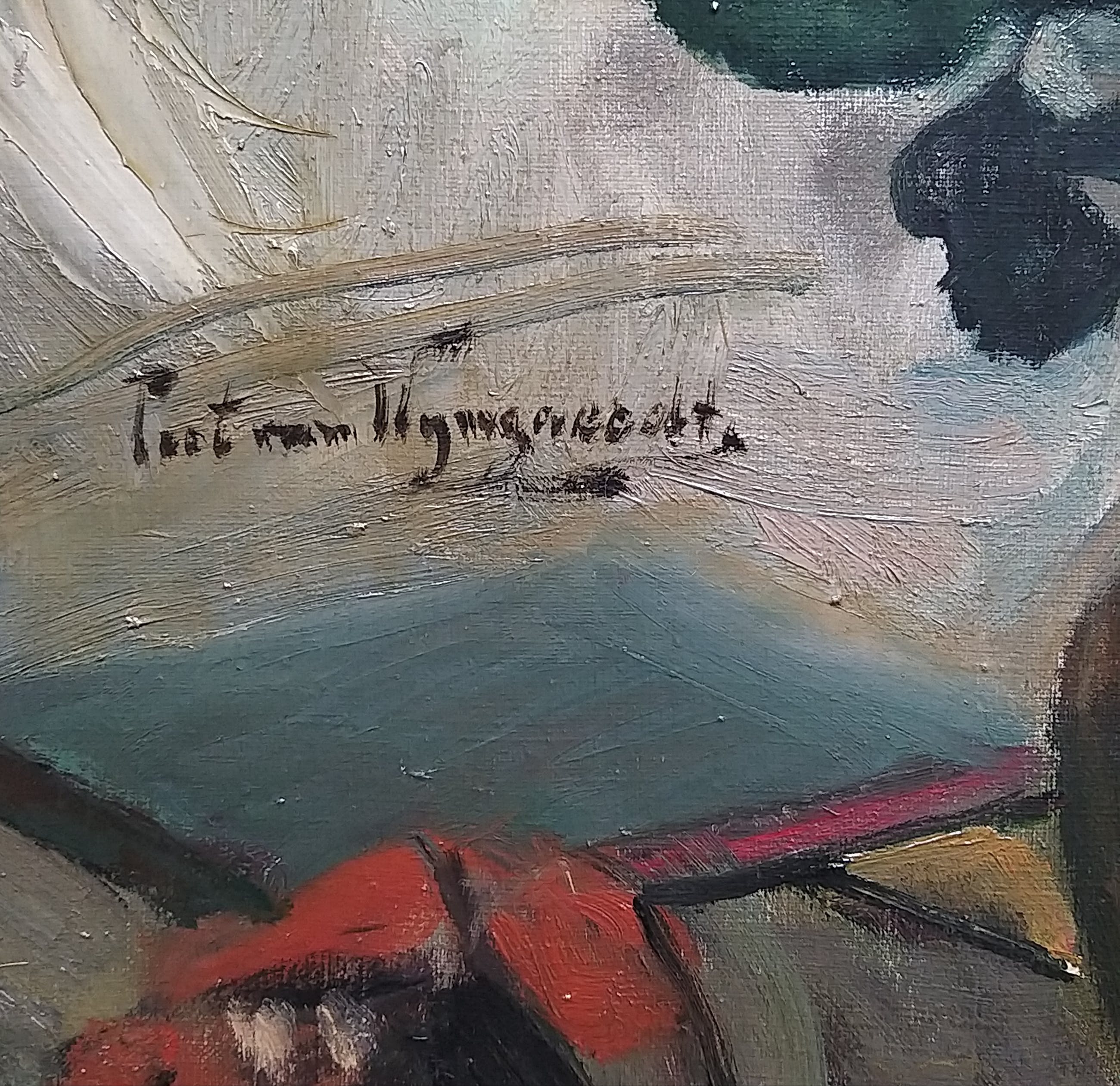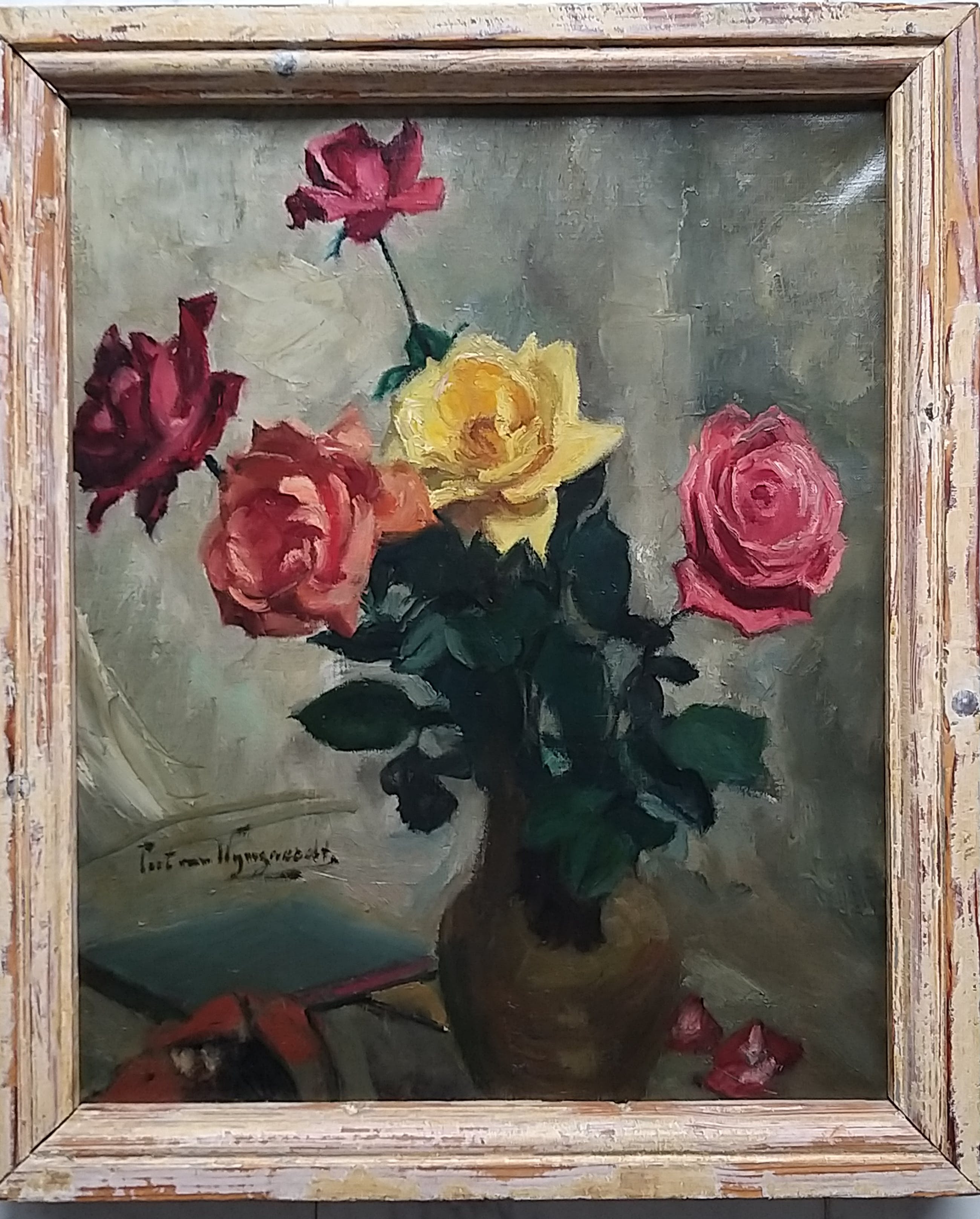 Rozen bouquet in een vaas van Piet van Wijngaard Voor en achterkant gesigneerd