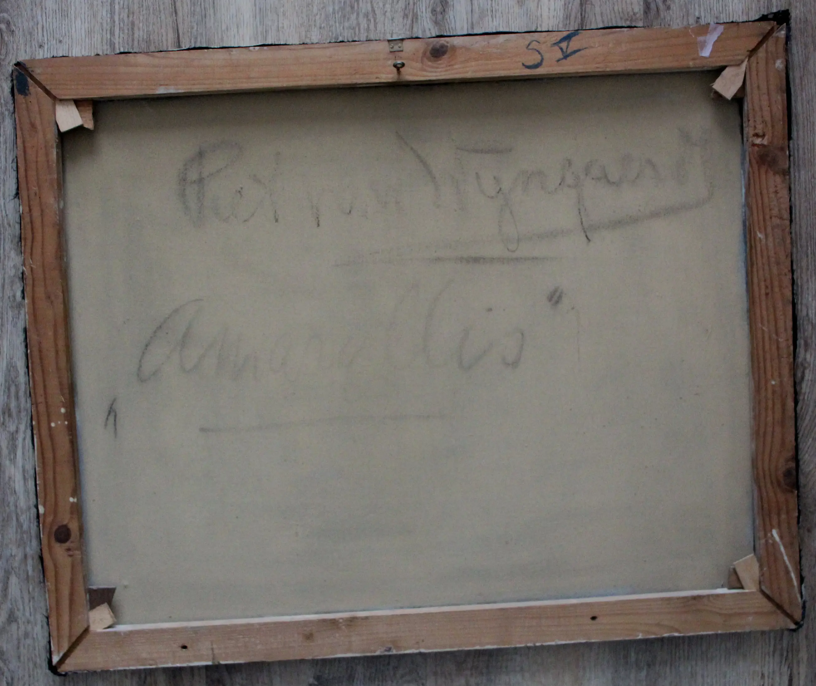 Olieverf op doek van Piet van Wijngaerdt. Titel: Amaryllis. Afmetingen werk: H62 x b77cm. Het werk is links onderaan en achterop gesigneerd en gedateerd door de kunstenaar. De authenticiteit van dit werk wordt volledig gegarandeerd. Een certificaat kan, op aanvraag, worden gemaild.