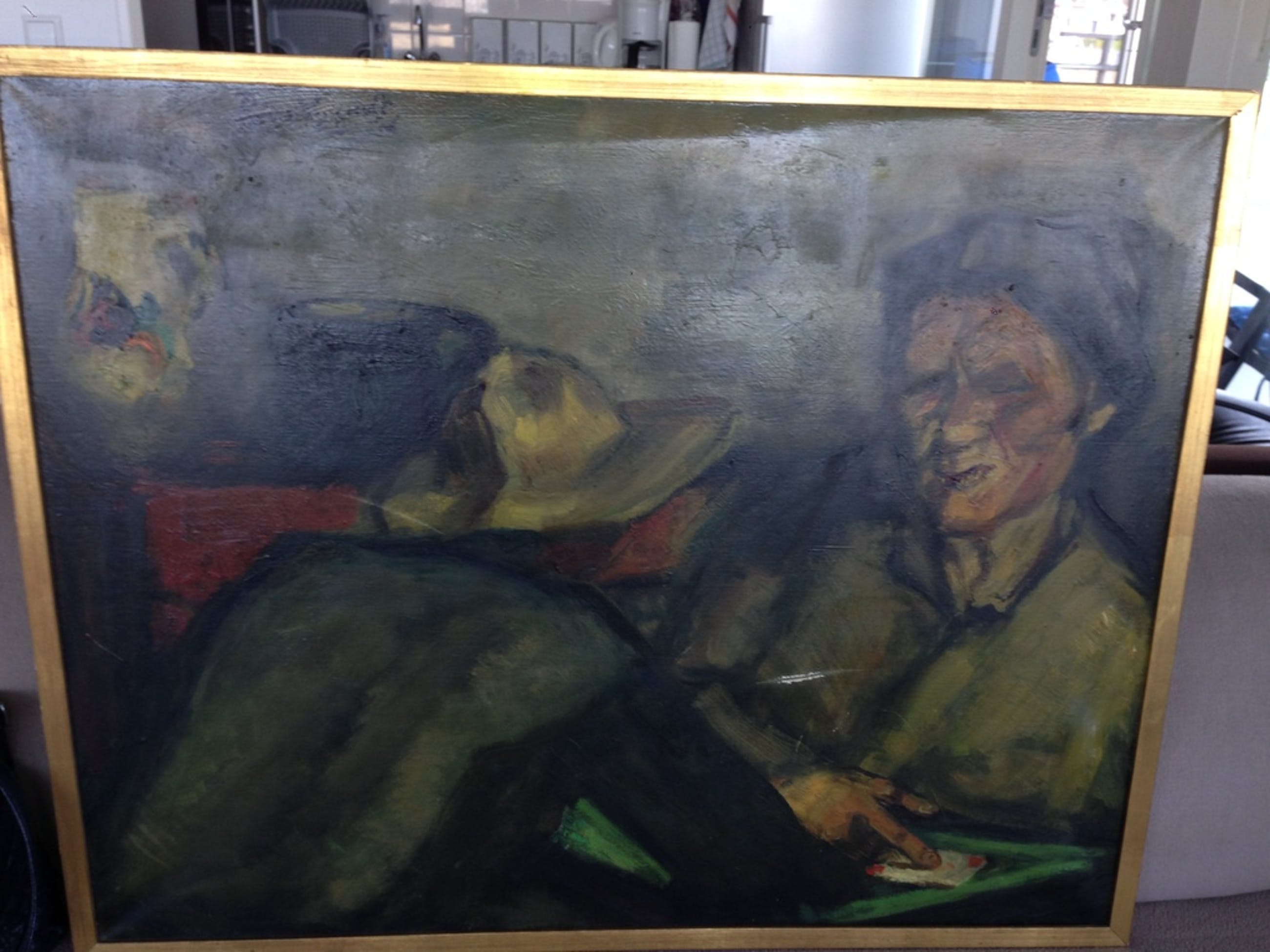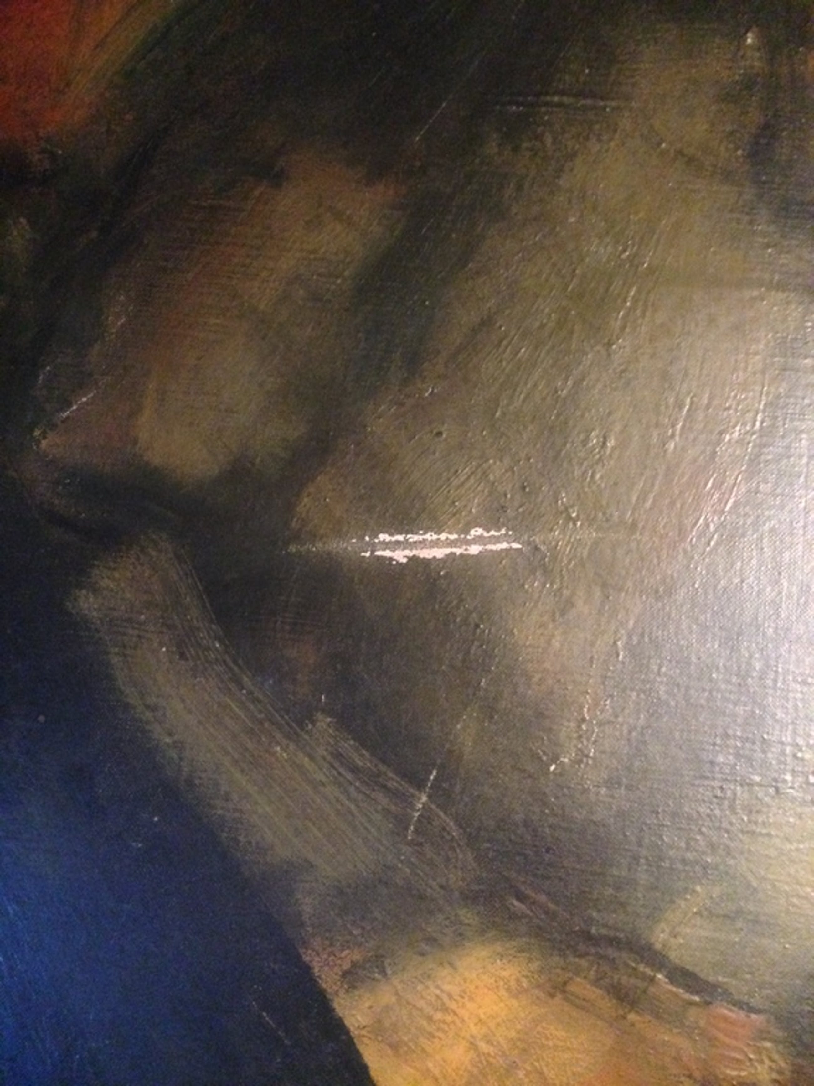 '56-olie op doek. Echter verfschade opgelopen door een verhuizing, geen scheur in het doek.