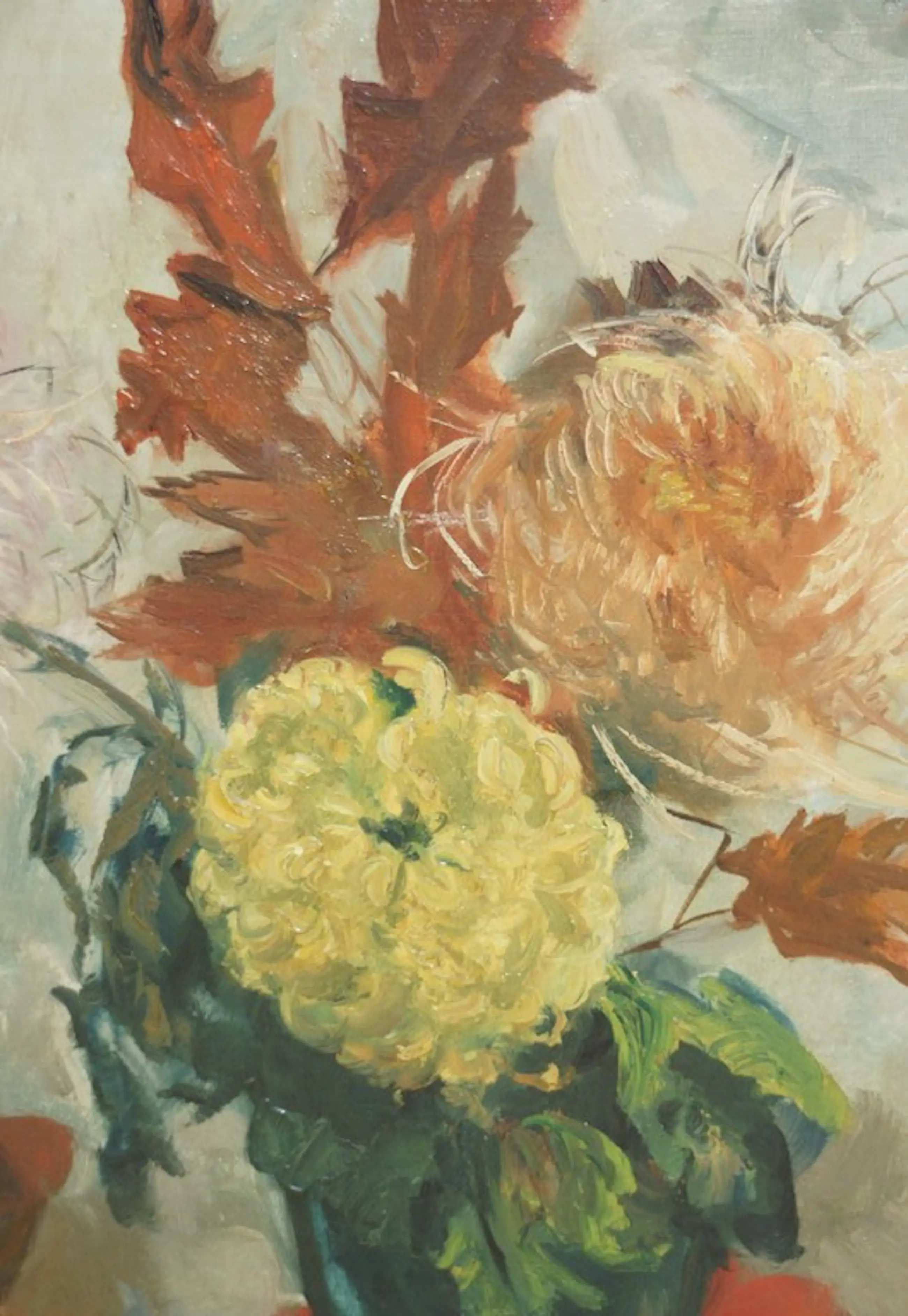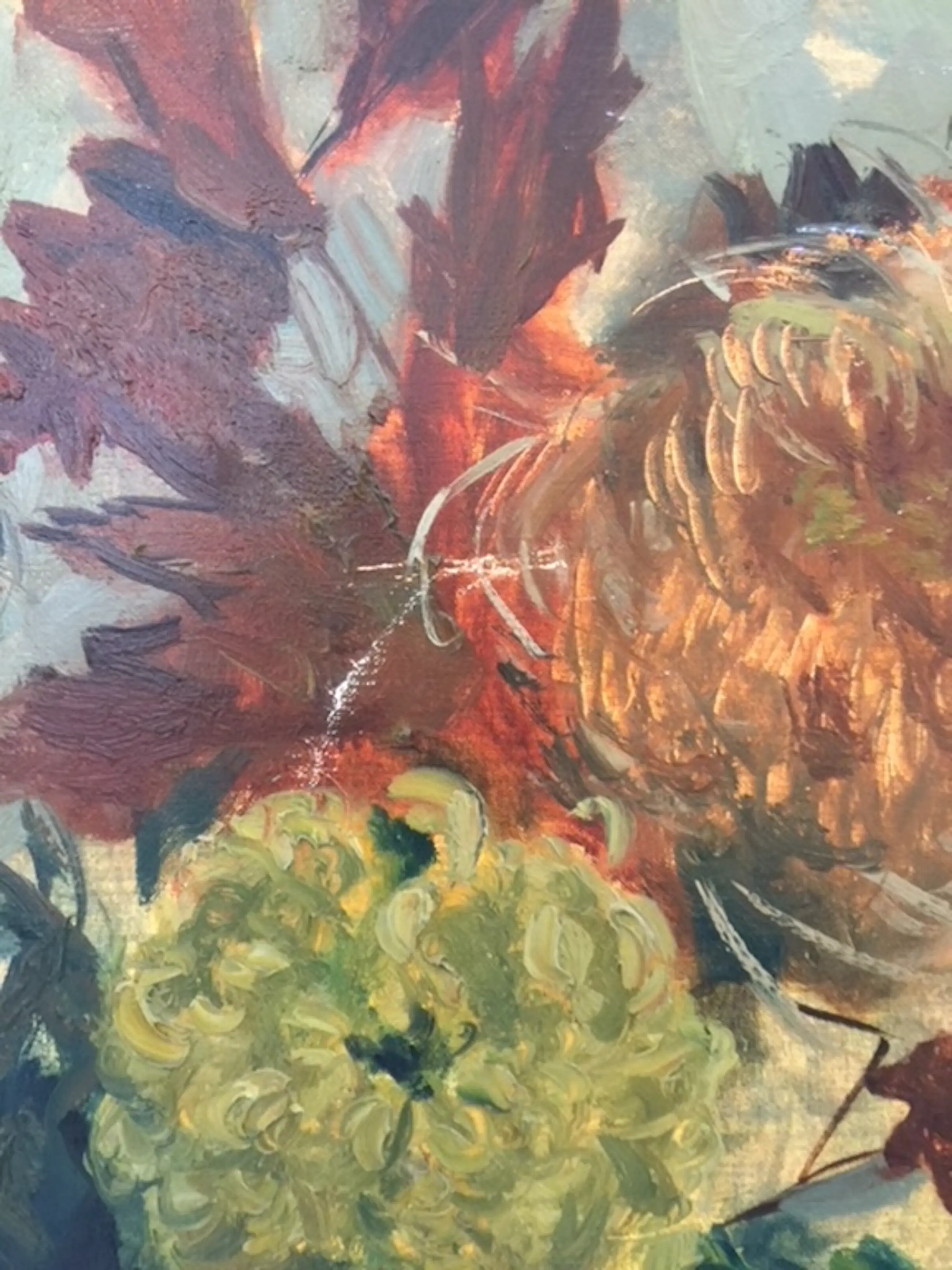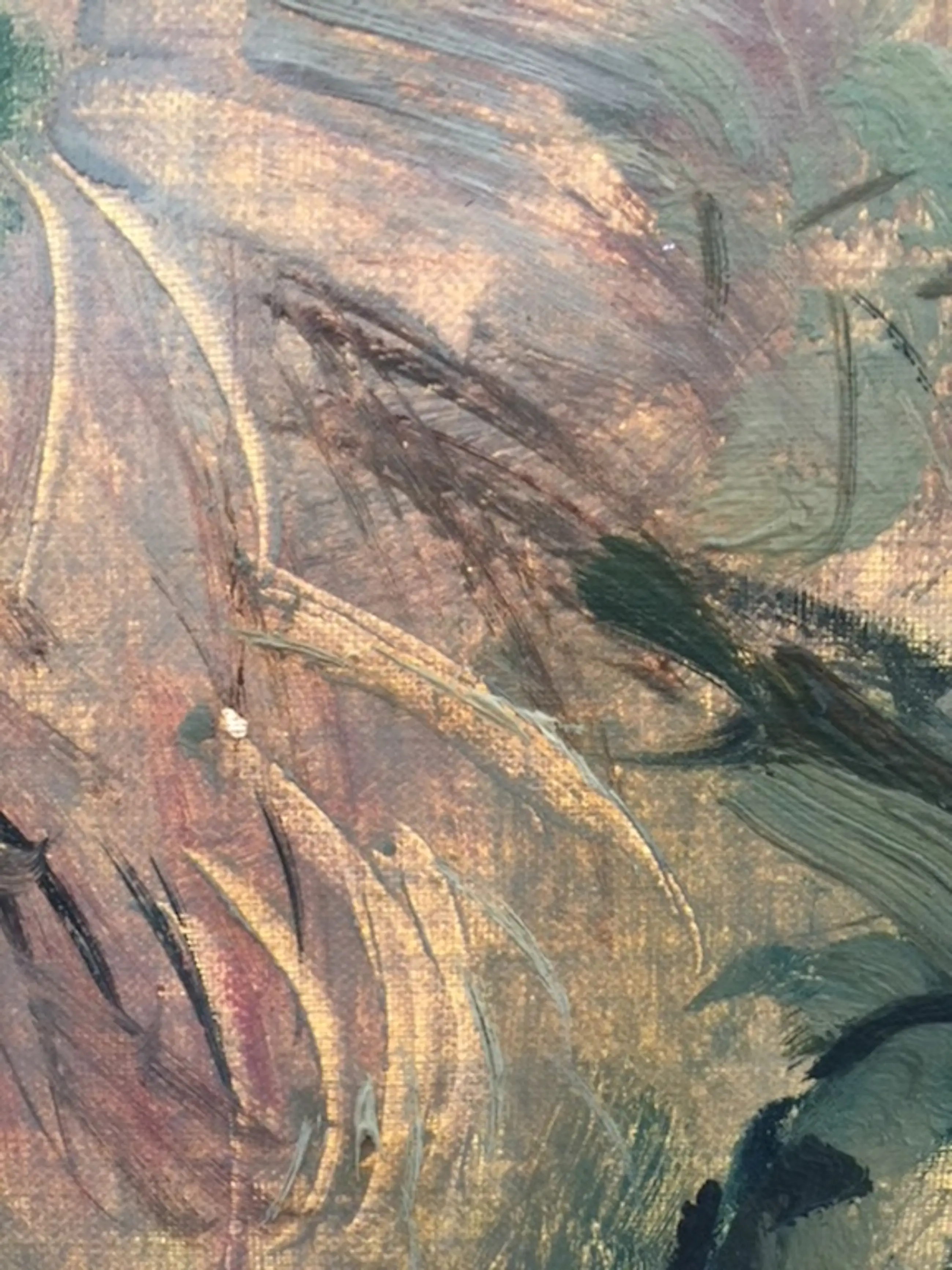 | redelijke staat (lijst ontbreekt een klein stukje aan de bovenkant, doek op twee plaatsen dun, zichtbaar indien het werk tegen het licht gehouden wordt, niet indien opgehangen) | |