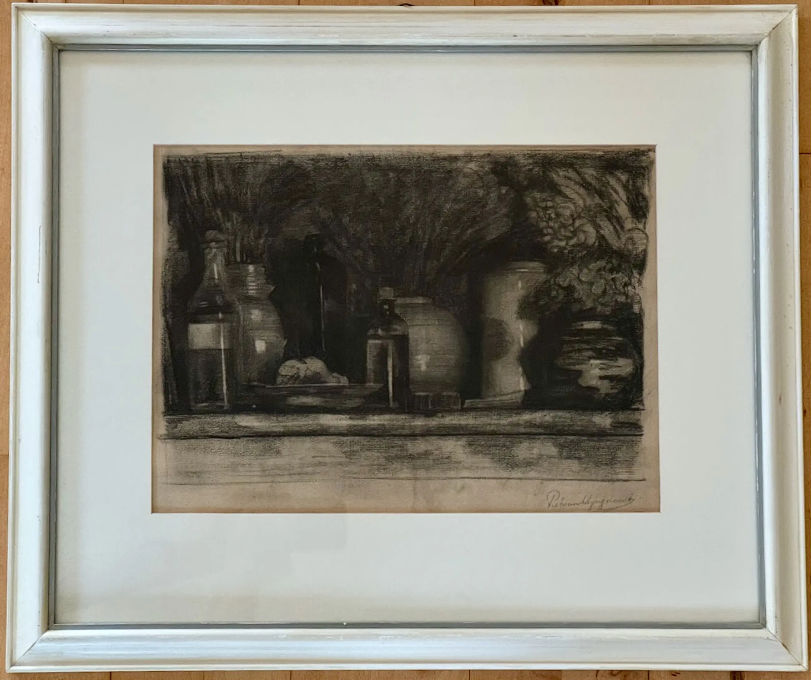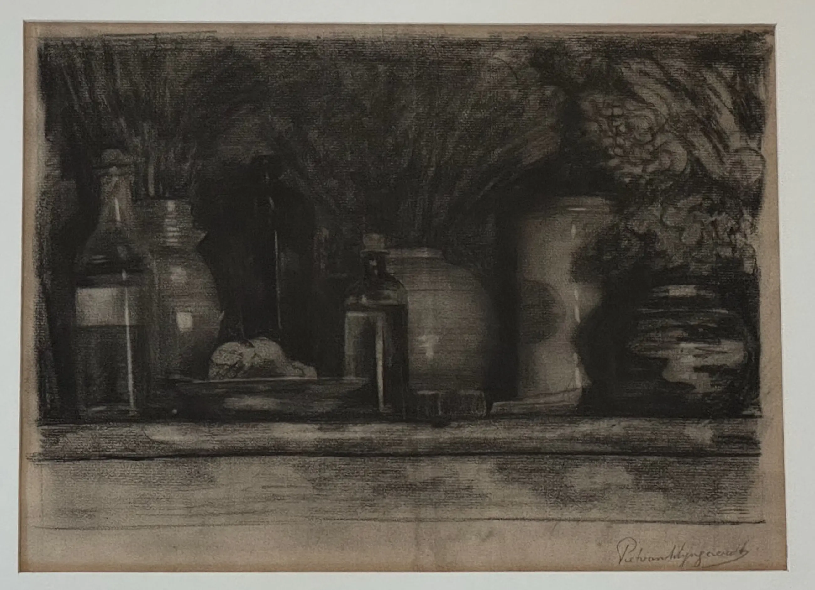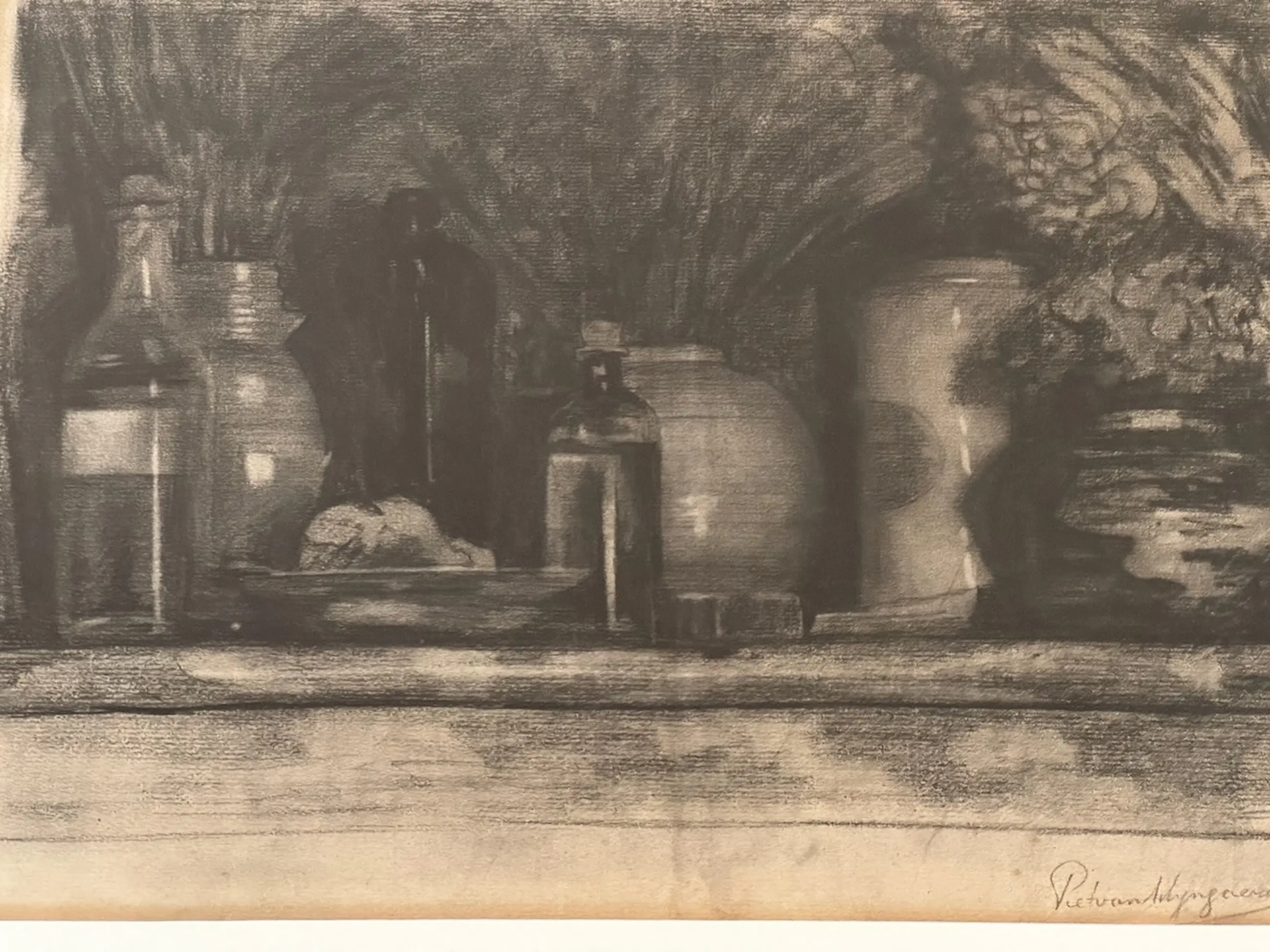 Dit is een conté potlood tekening, zoals op de achterzijde is vermeld, met titel: Stilleven met potten en flessen. Van Wijngaerdt koos vaak stillevens als onderwerp. Met de potten en flessen daagde hij zichzelf extra uit. De kunstenaar toont hier zijn meesterschap. Hij hield de tekening donker, hetgeen doet vermoeden dat hij dit stilleven tekende in de eerste jaren van de Bergense school.