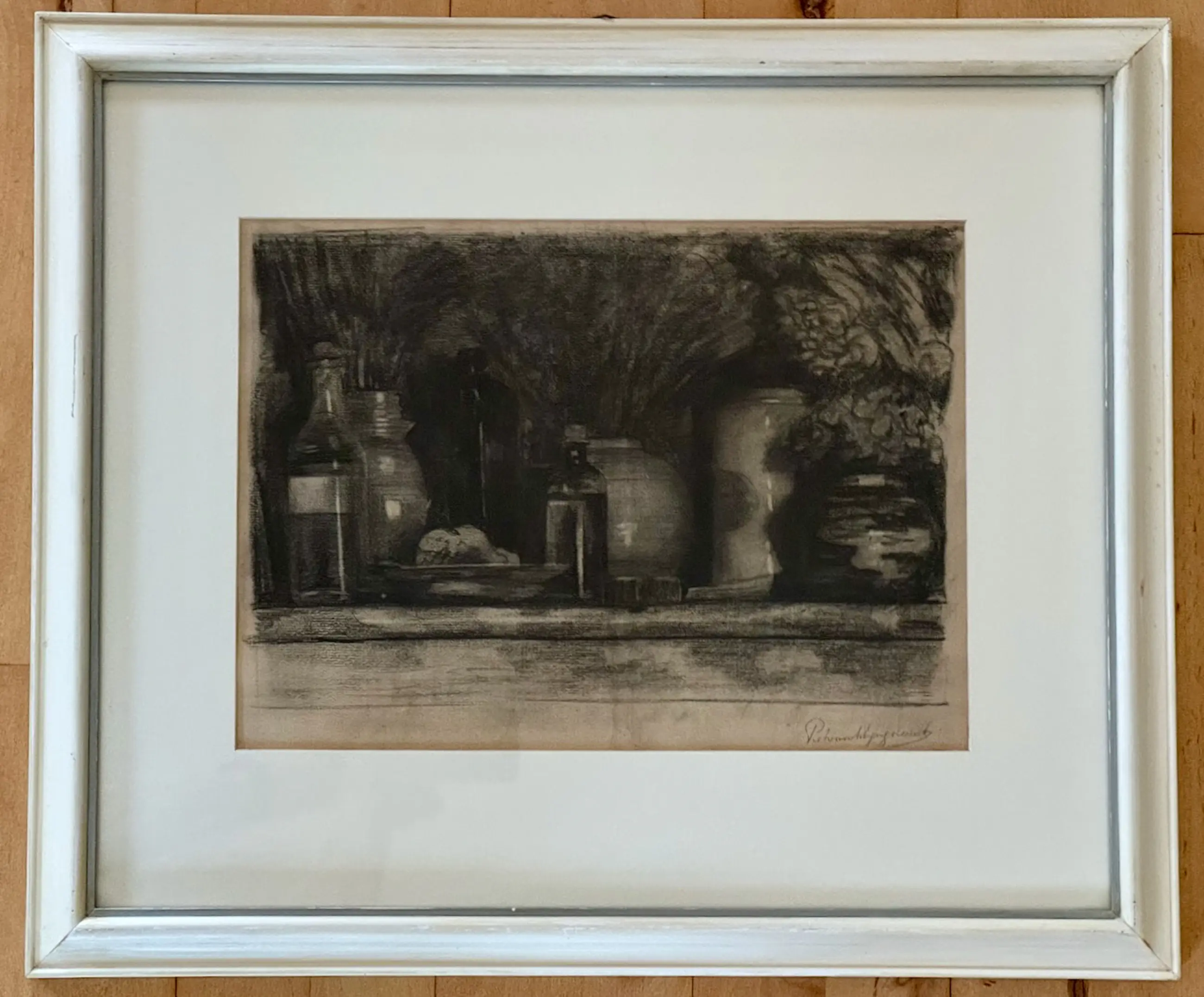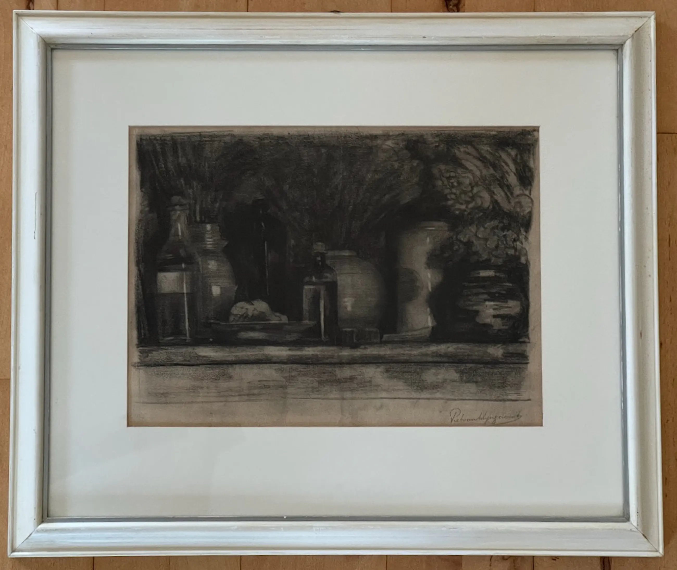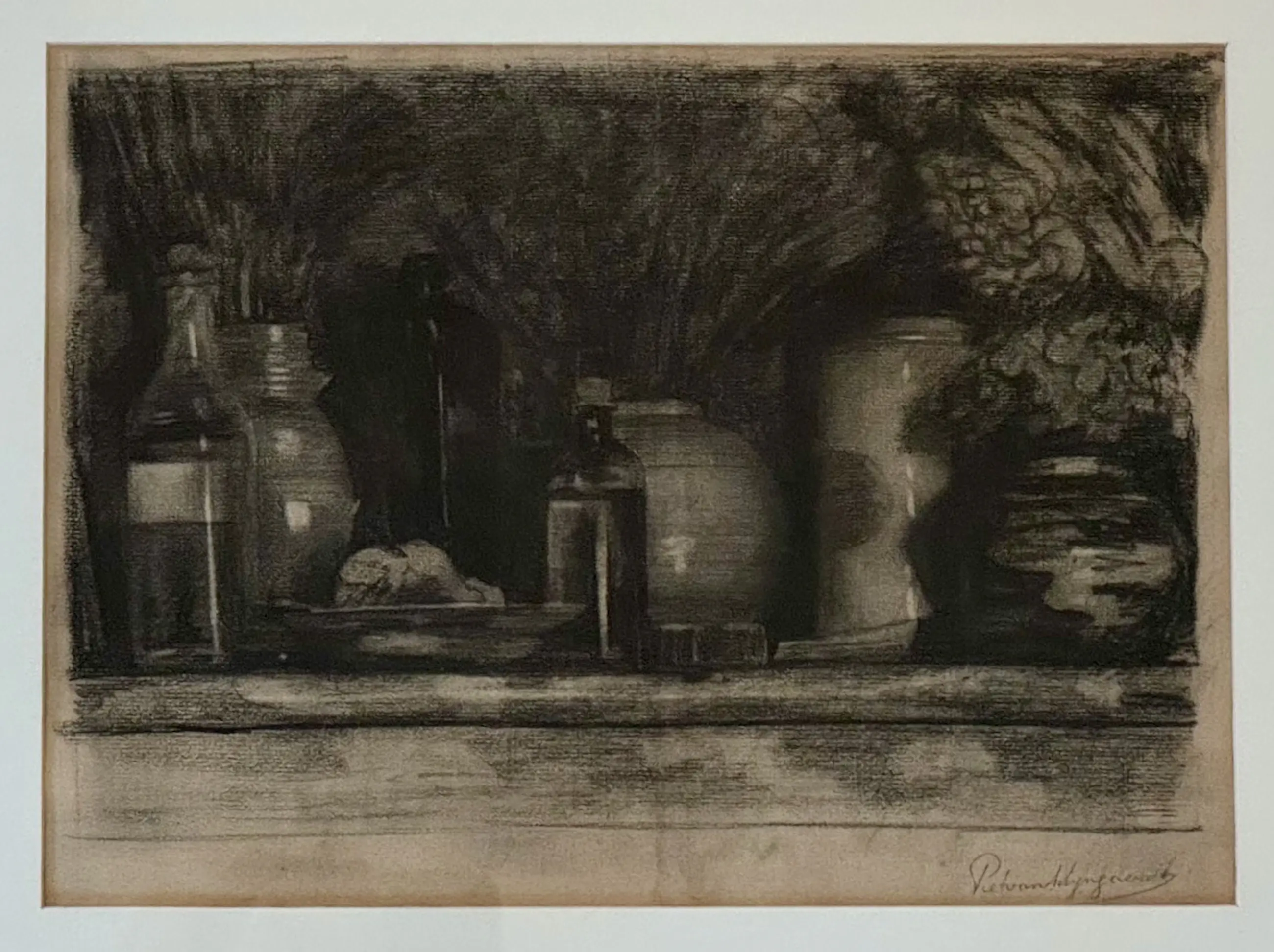 Dit is een conté potlood tekening, zoals op de achterzijde is vermeld, met titel: Stilleven met potten en flessen. Van Wijngaerdt koos vaak stillevens als onderwerp. Met de potten en flessen daagde hij zichzelf extra uit. De kunstenaar toont hier zijn meesterschap. Hij hield de tekening donker, hetgeen doet vermoeden dat hij dit stilleven tekende in de eerste jaren van de Bergense school.