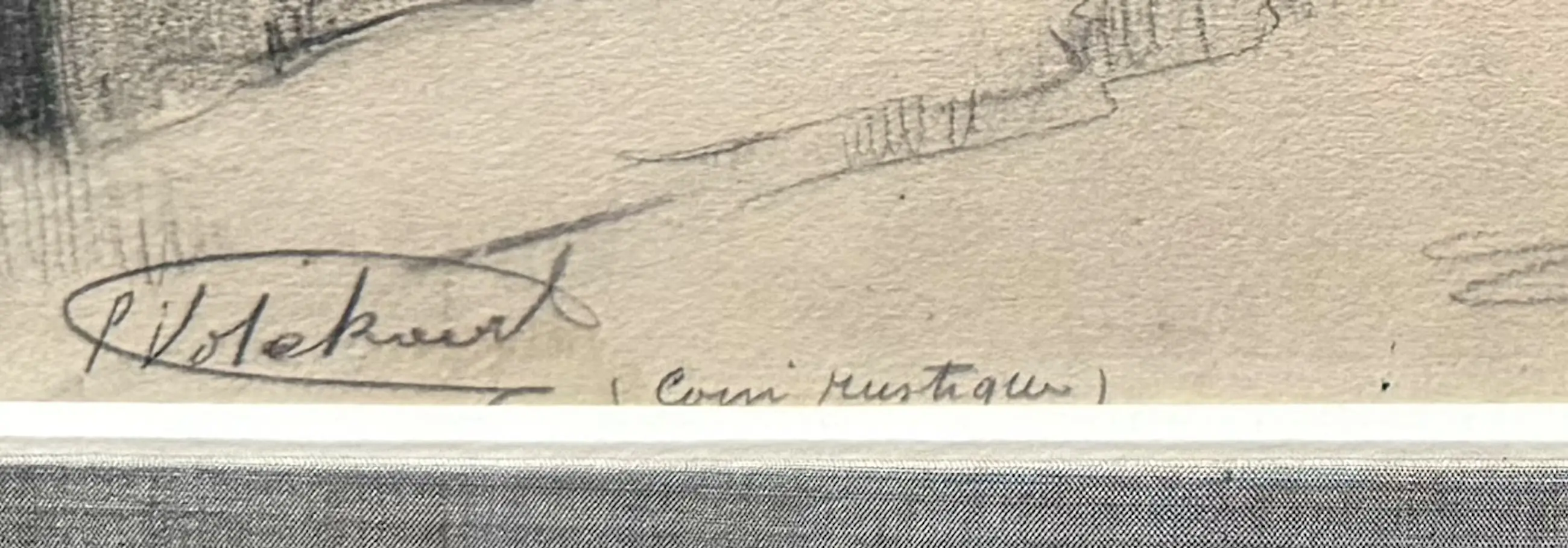 Tekening in potlood op papier, voorstellend een landelijk straatgezicht met figuren tussen traditionele woningen. Het werk is uitgevoerd in een sobere, fijnzinnige lijnvoering met sterke aandacht voor perspectief en sfeer, typerend voor het oeuvre van Piet Volckaert. Rechtsonder gesigneerd en getiteld door de kunstenaar. Volckaert was een Belgische kunstenaar bekend om zijn poëtische weergave van dorps- en straattaferelen, waarin rust en menselijke aanwezigheid centraal staan. Het werk verkeert in goede staat en is professioneel ingekaderd.