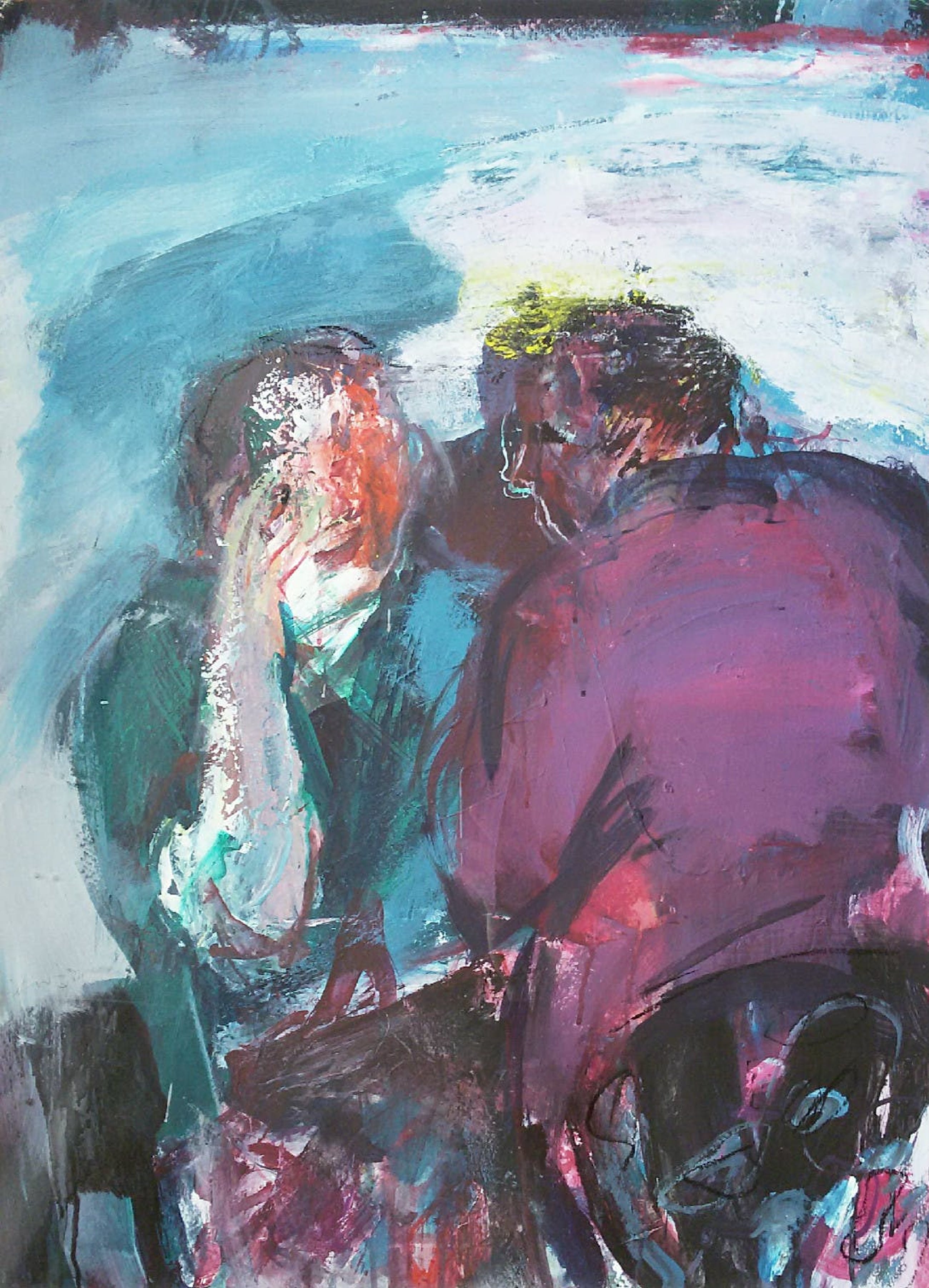 Prachtig, karakteristiek werk van de invloedrijke Limburgse kunstenaar Piet Vos. Acrylverf op papier, met potlood gesigneerd en gedateerd (’84). In nette houten lijst, achter glas en met smetteloos, zuurvrij passe-partout. Alles in uitstekende conditie. Afkomstig uit de kunstcollectie van de Nederlandsche Middenstandsbank (NMB, later overgegaan in de ING).