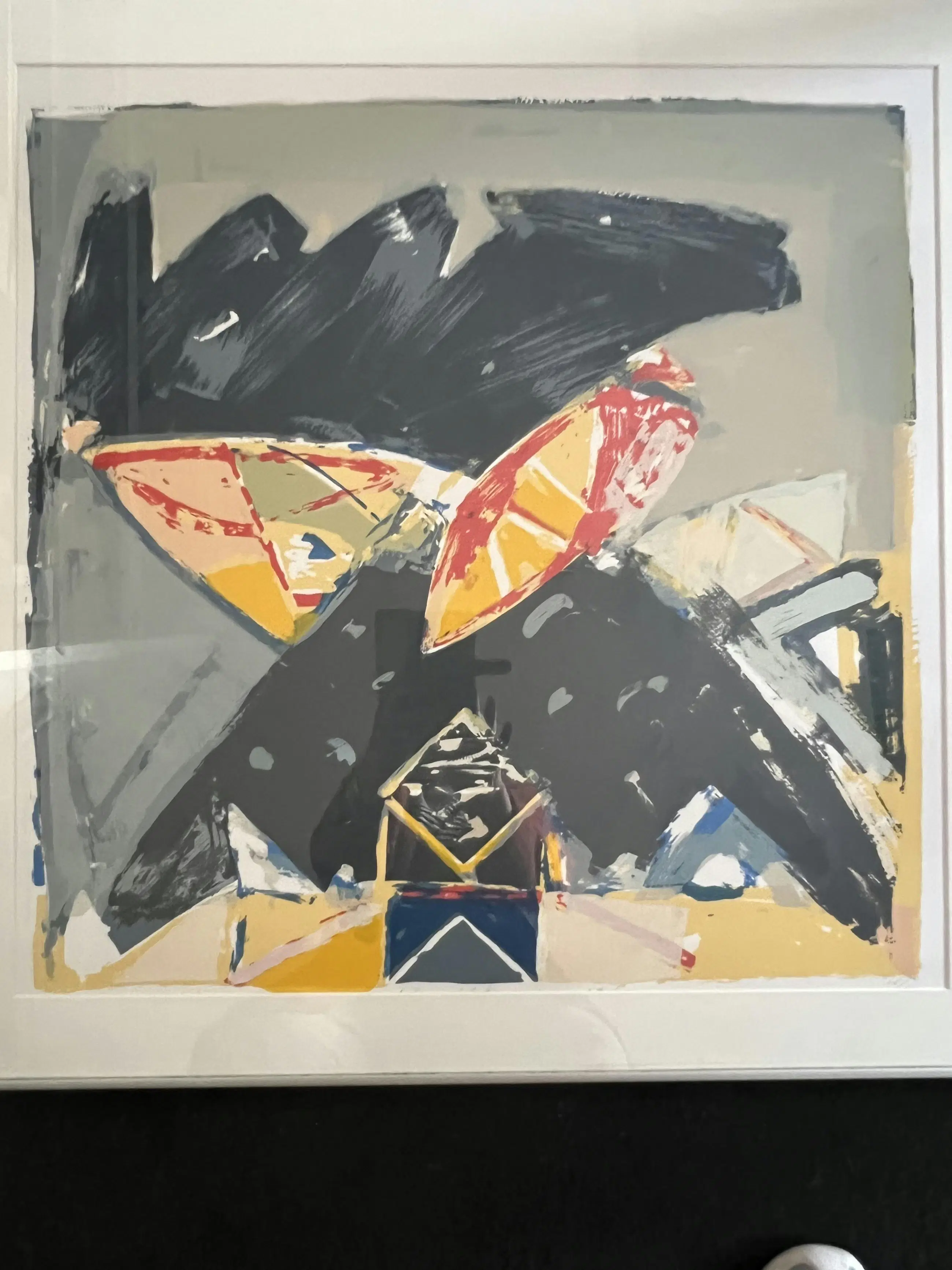 Het is een abstract kleurrijk werk. Het is niet verkleurd en helemaal gaaf. Evenals de lijst. Afmeting 65 x 65cm. Met lijst. 80 x 80cm