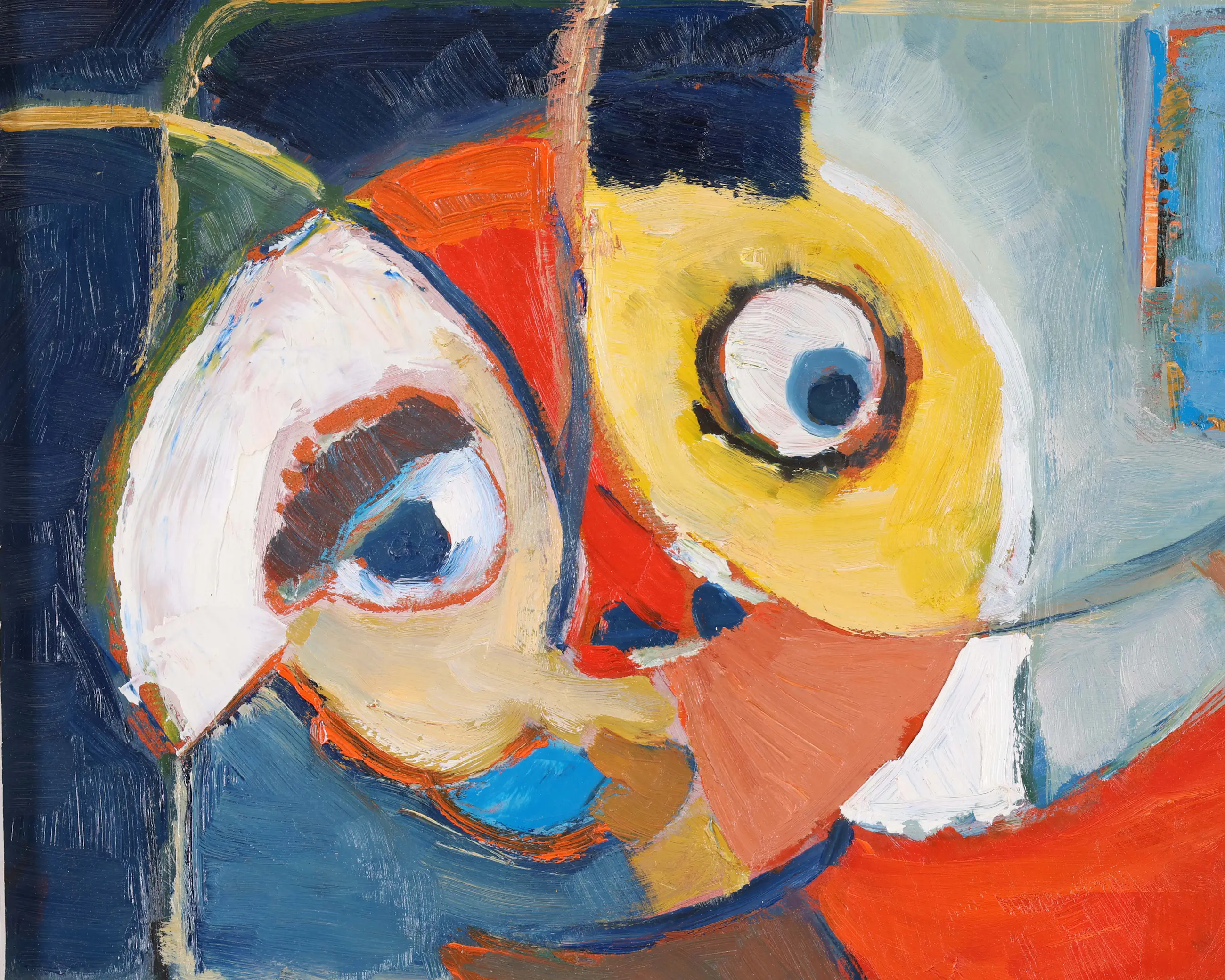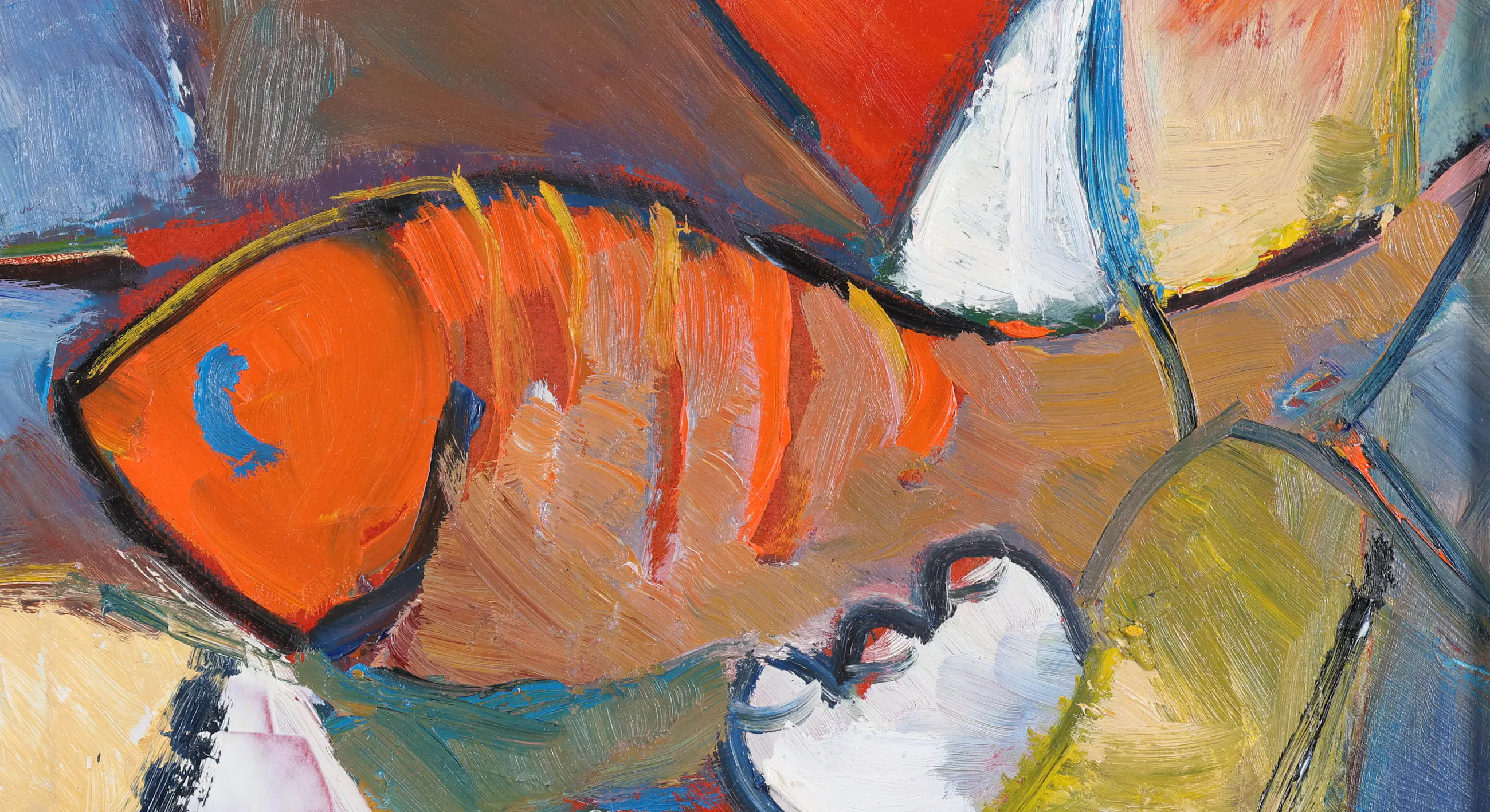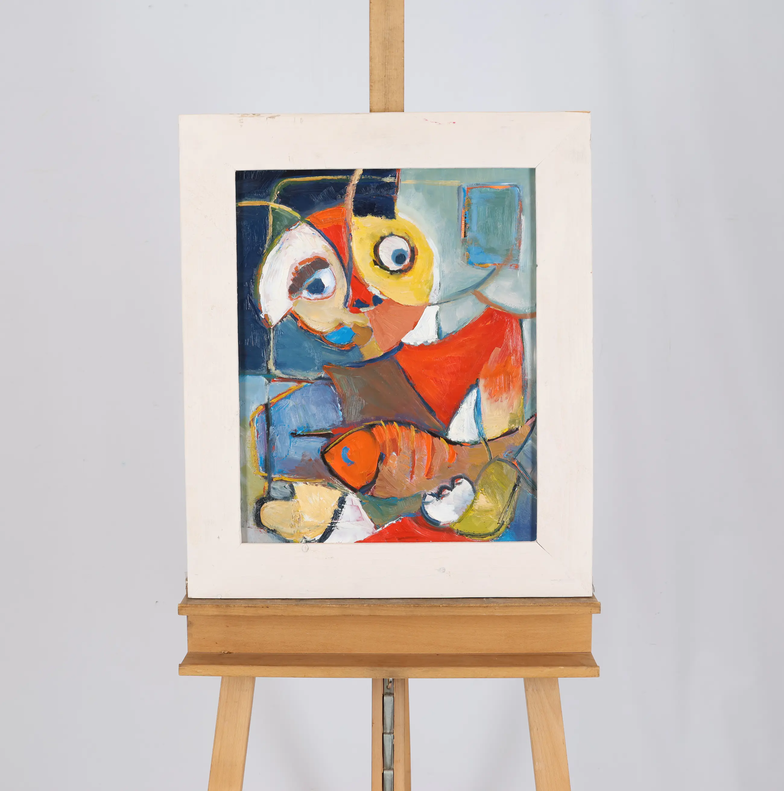 Dit olieverfschilderij is toegeschreven aan Piet Wiegman. Het werk toont op kleurrijke en speelse wijze een poppetje en een vis, weergegeven in een expressieve stijl. De compositie en het levendige kleurgebruik geven het schilderij een karaktervolle uitstraling. Het werk bevindt zich in een nette lijst en kan direct worden opgehangen.