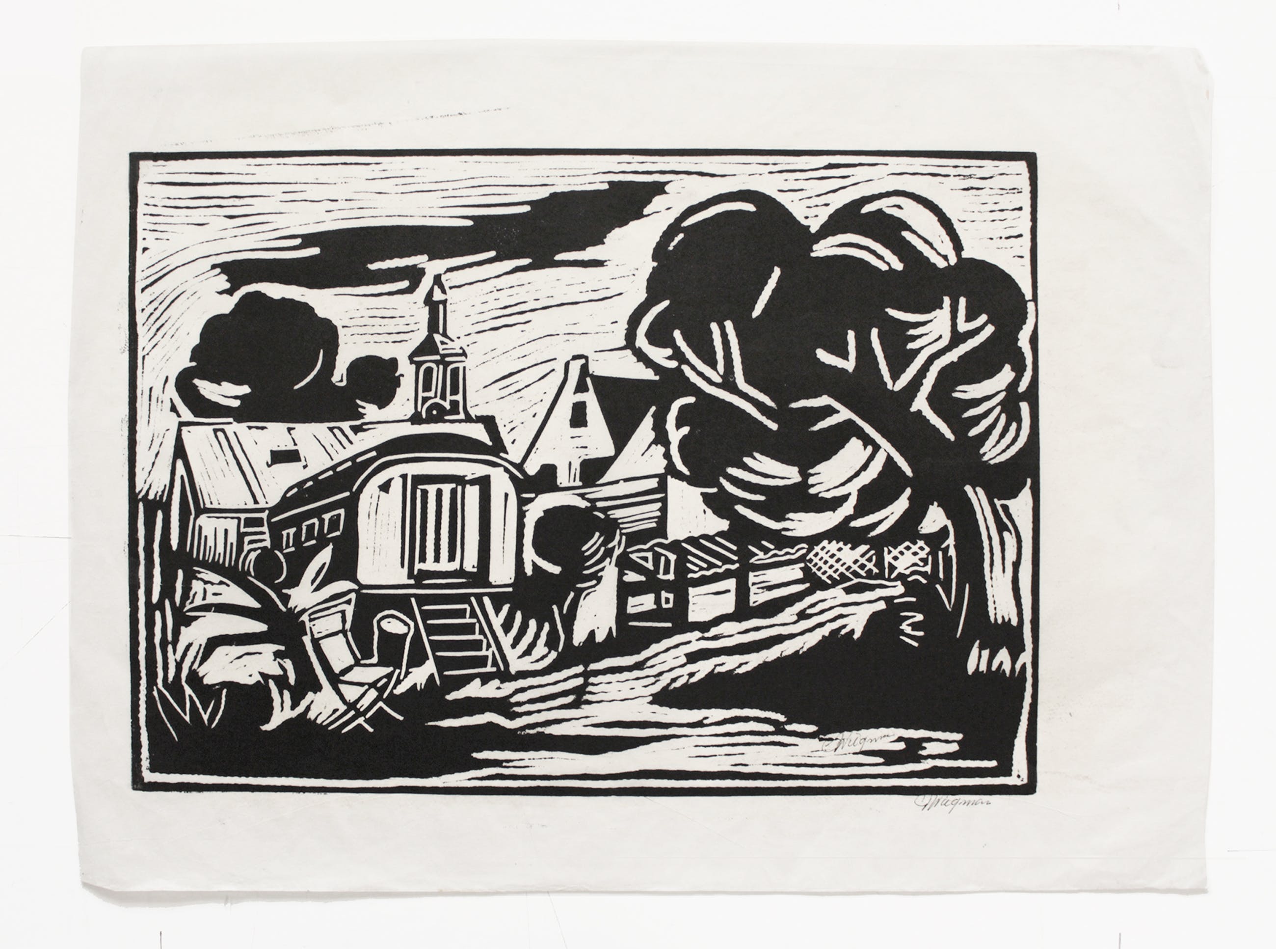 maat afdruk lino 'Woonwagen': 36 x 50 cm.