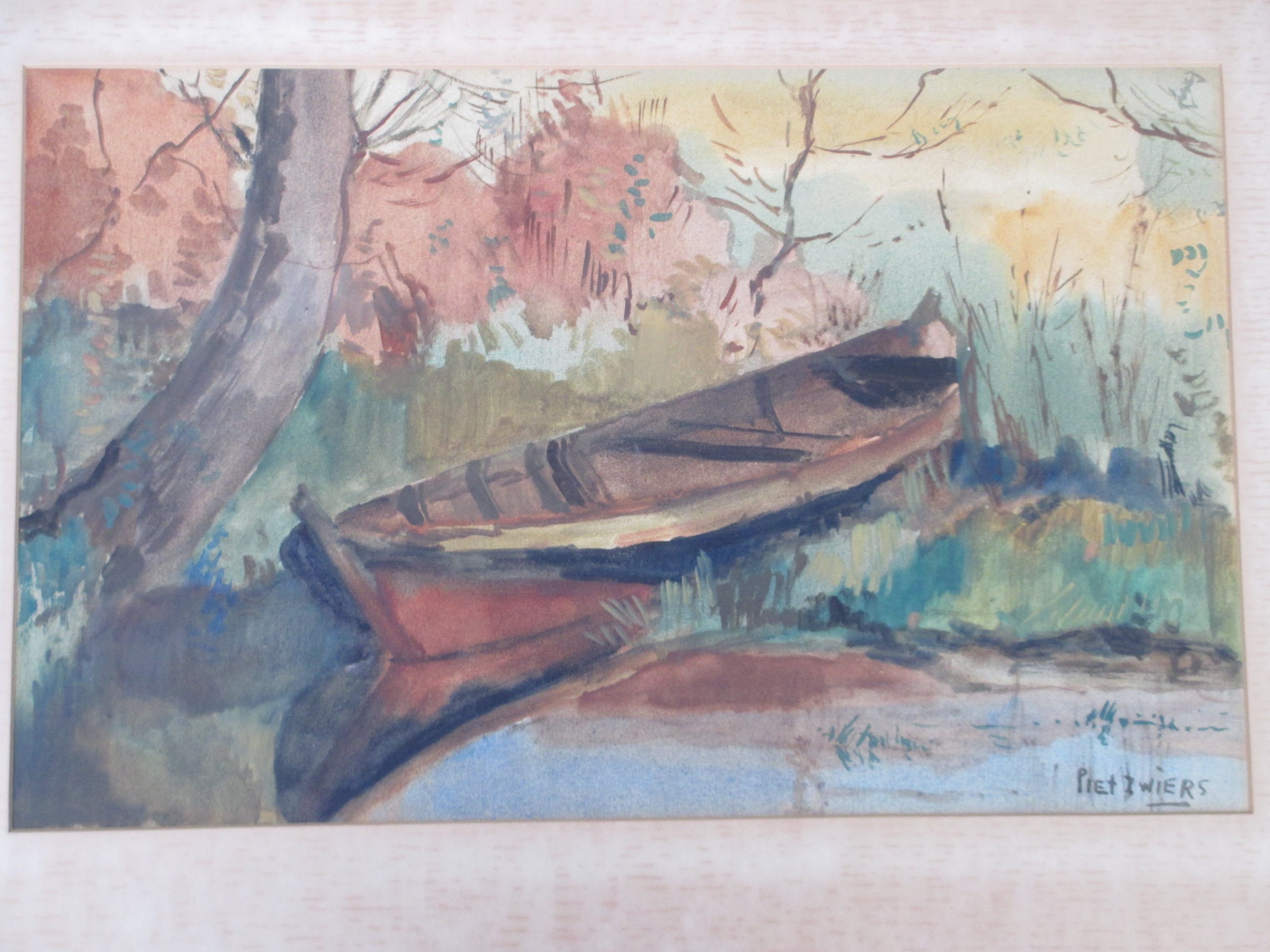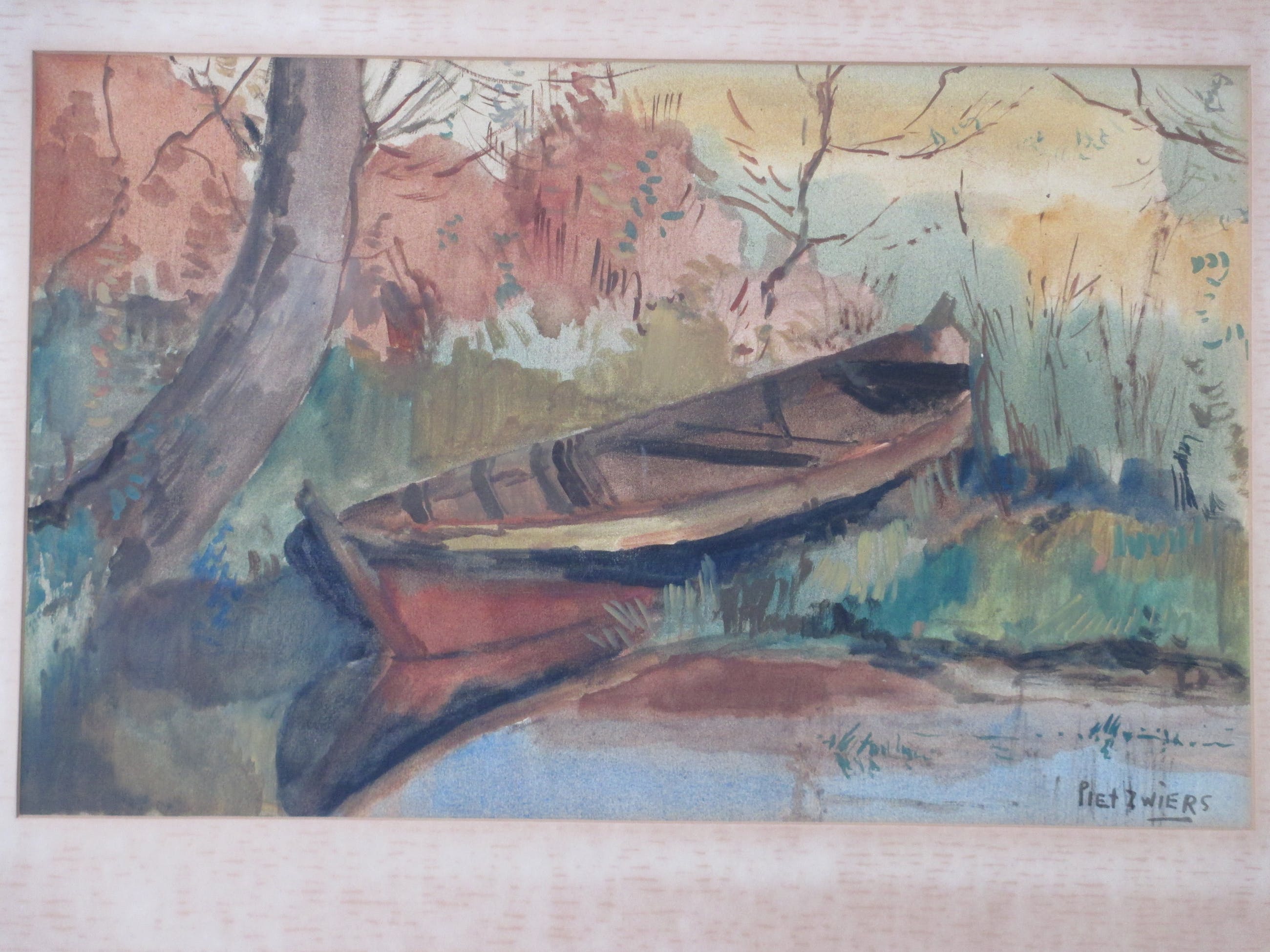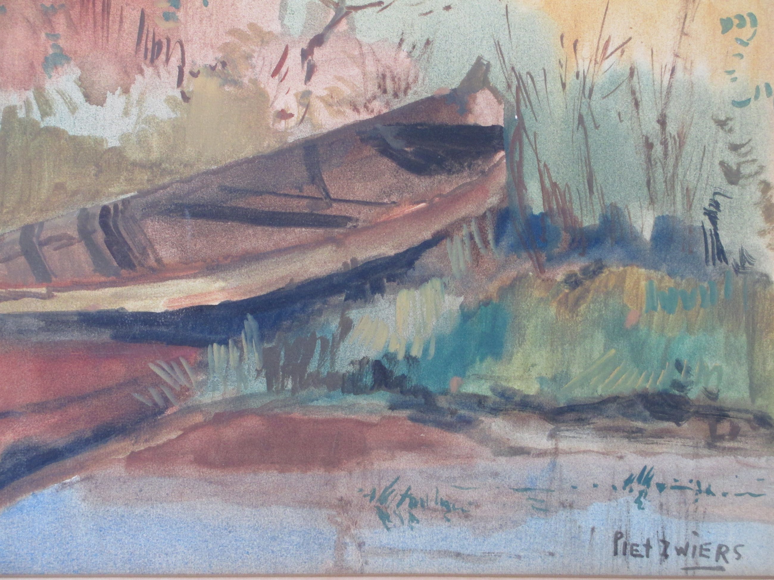 Gemengde techniek door Piet ZwiersVoorstelling van een roeiboot aan een slootkantIn passepartout, beeldmaat 31x50Gesigneerd r.o. ' Piet Zwiers' Authenticiteit gegarandeerd