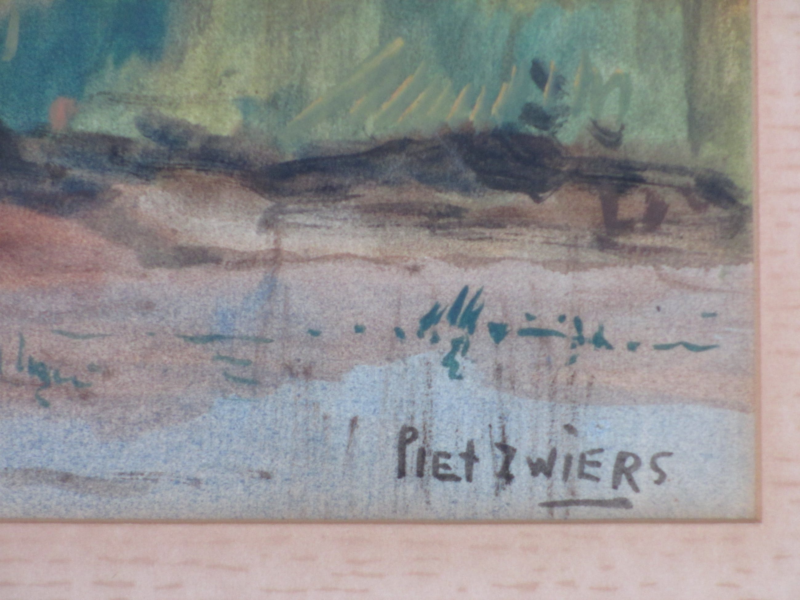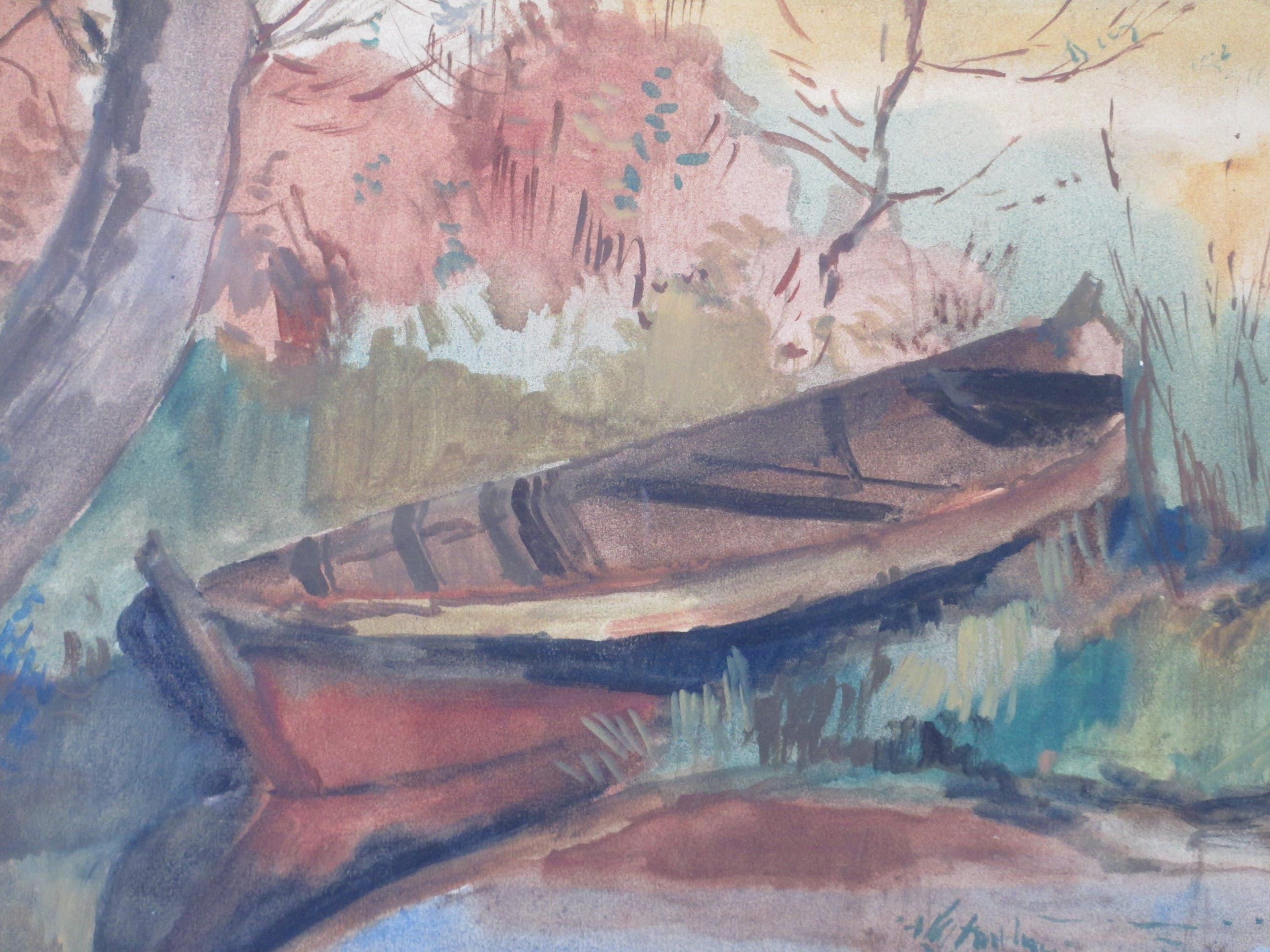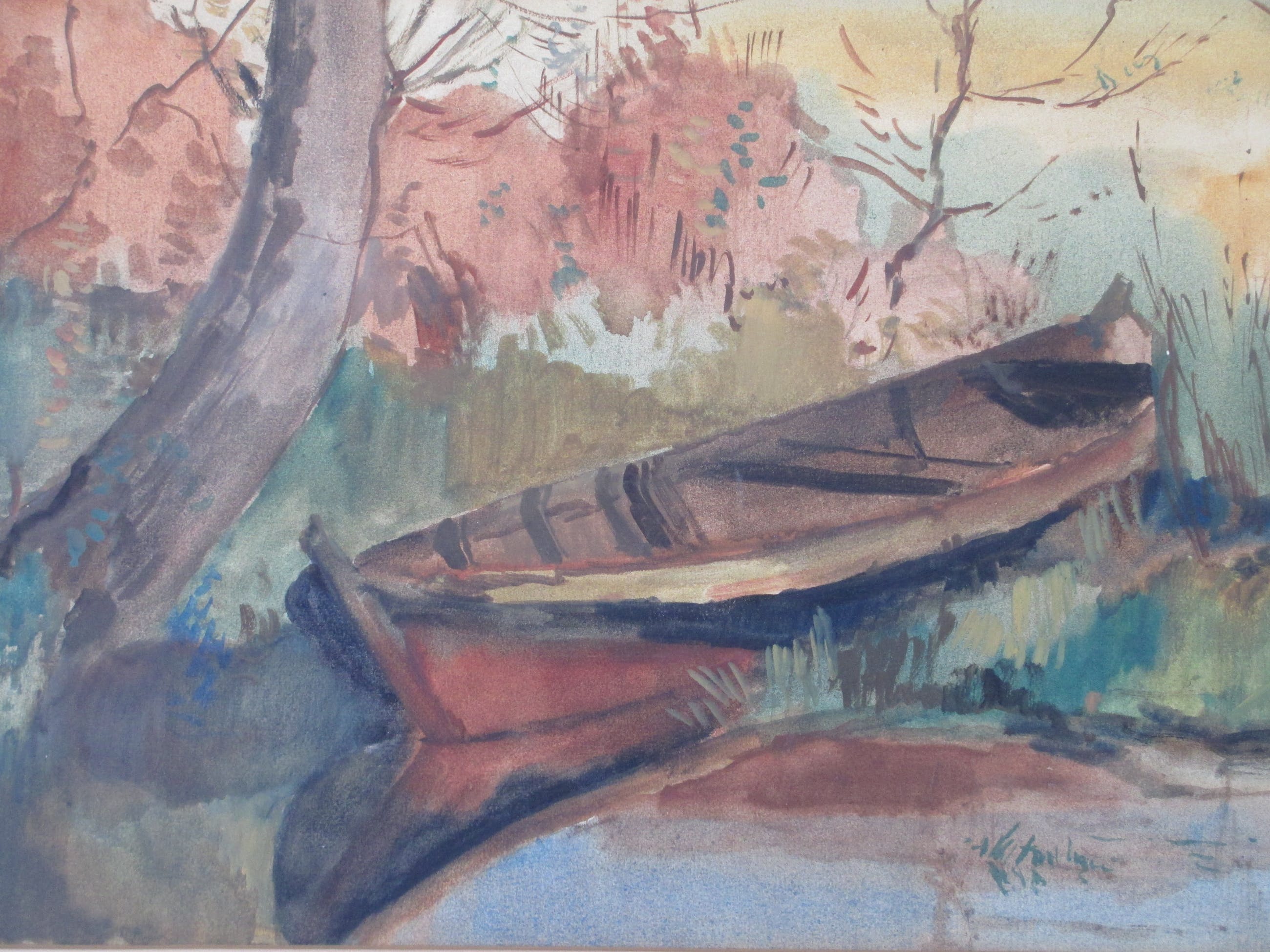 Gemengde techniek door Piet ZwiersVoorstelling van een roeiboot aan een slootkantIn passepartout, beeldmaat 31x50Gesigneerd r.o. ' Piet Zwiers' Authenticiteit gegarandeerd