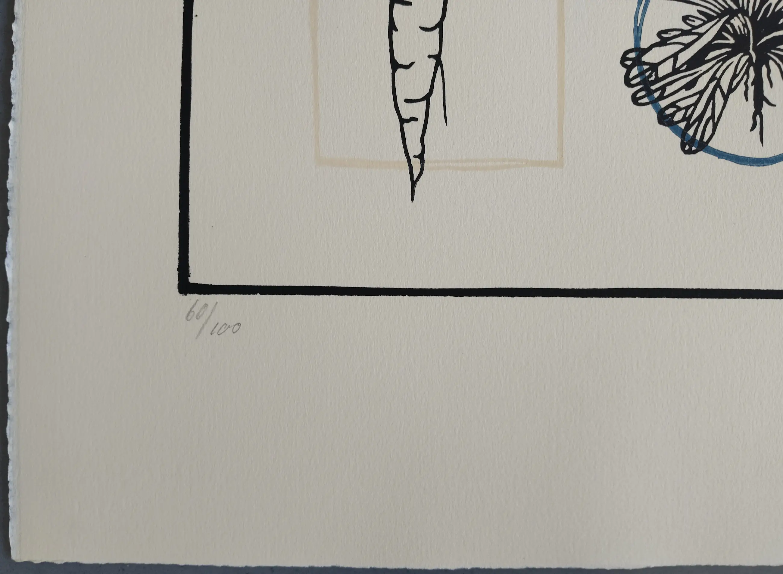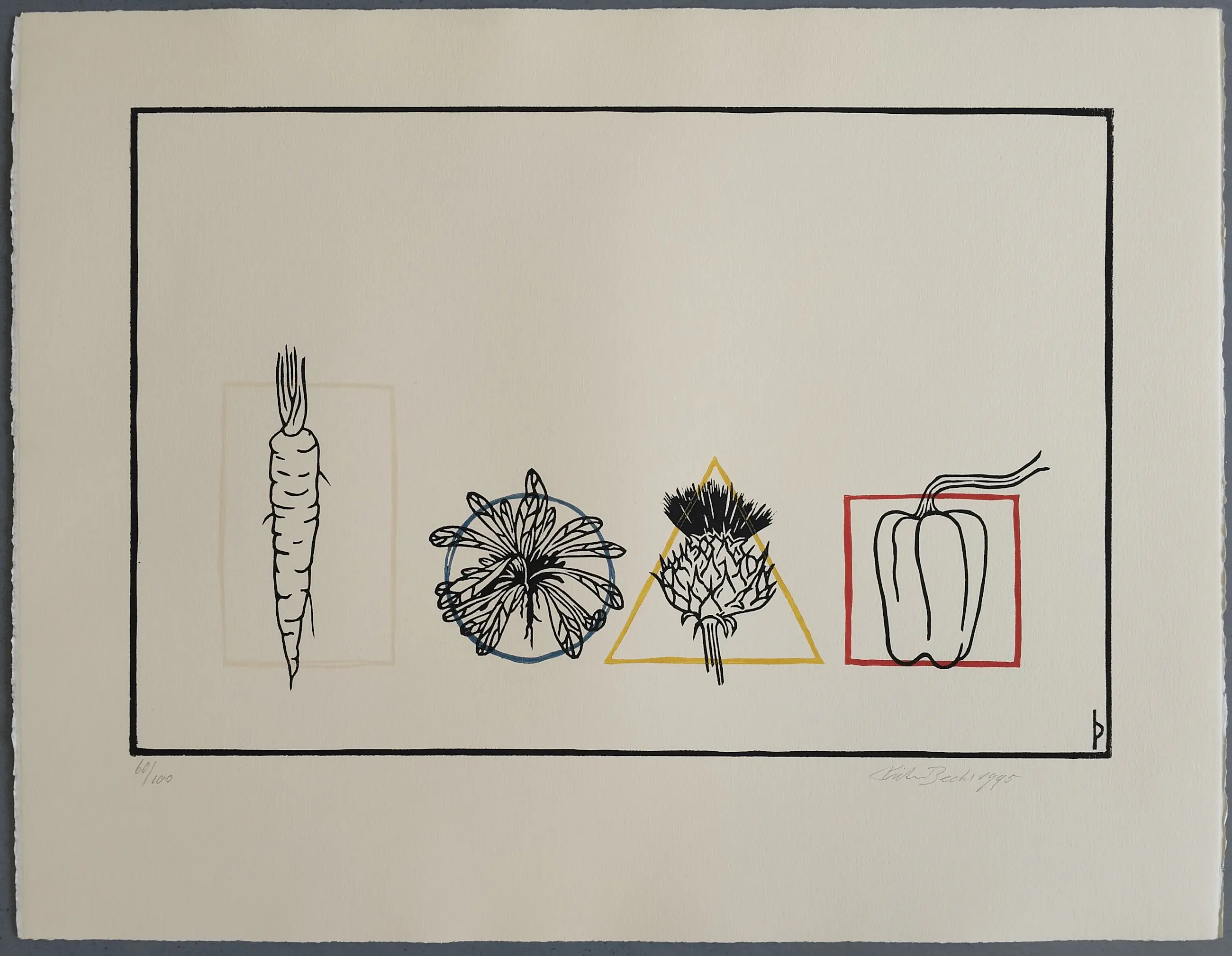 Pieter Becks (1969) gesigneerde houtsnede uit 1995. Gedrukt in een oplage van 100 stuks op crèmekleurig papier. Het werk is gesigneerd in potlood, 1995 en 60/100. Papiermaat 50 x 65 cm. (hxb) De houtsnede is in zeer goede staat.