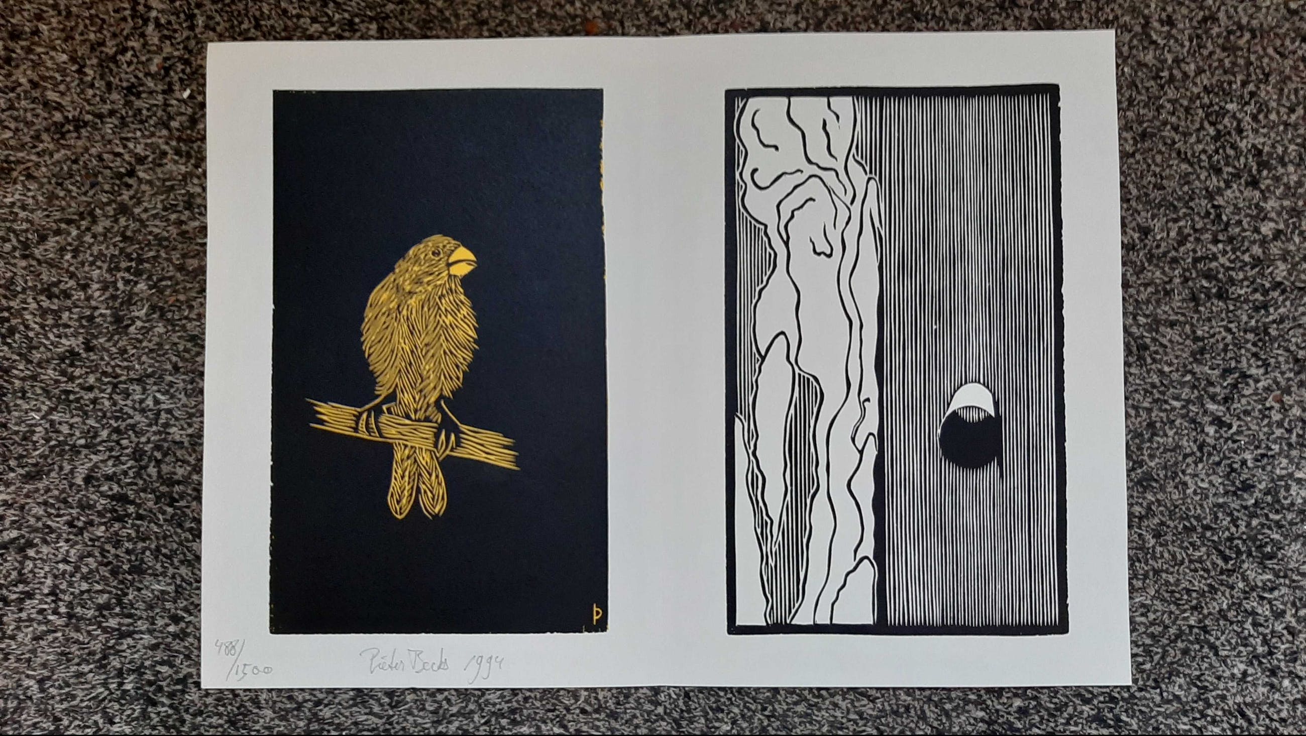 Eigenlijk zijn het 2 prenten naast elkaar. Links een gele vogel op een gele tak op een zwarte achtergrond. Rechts in zwart een boom met gat naar het nest.