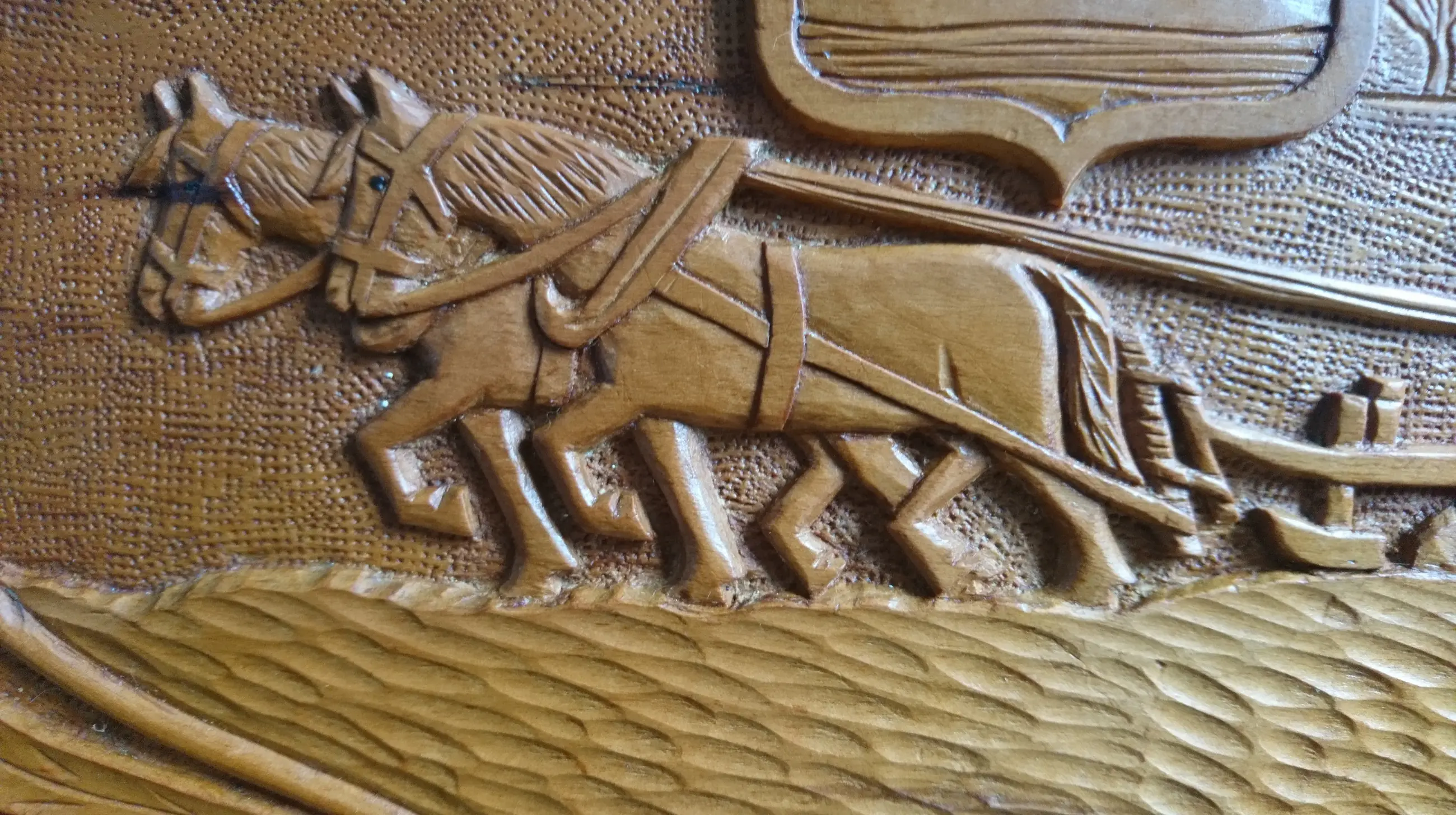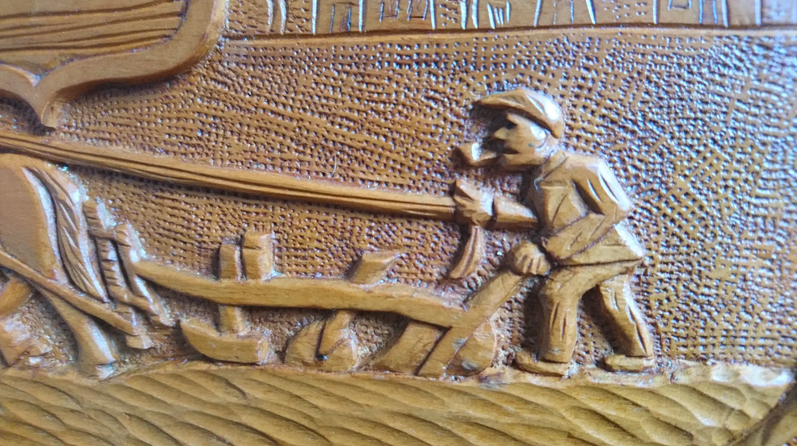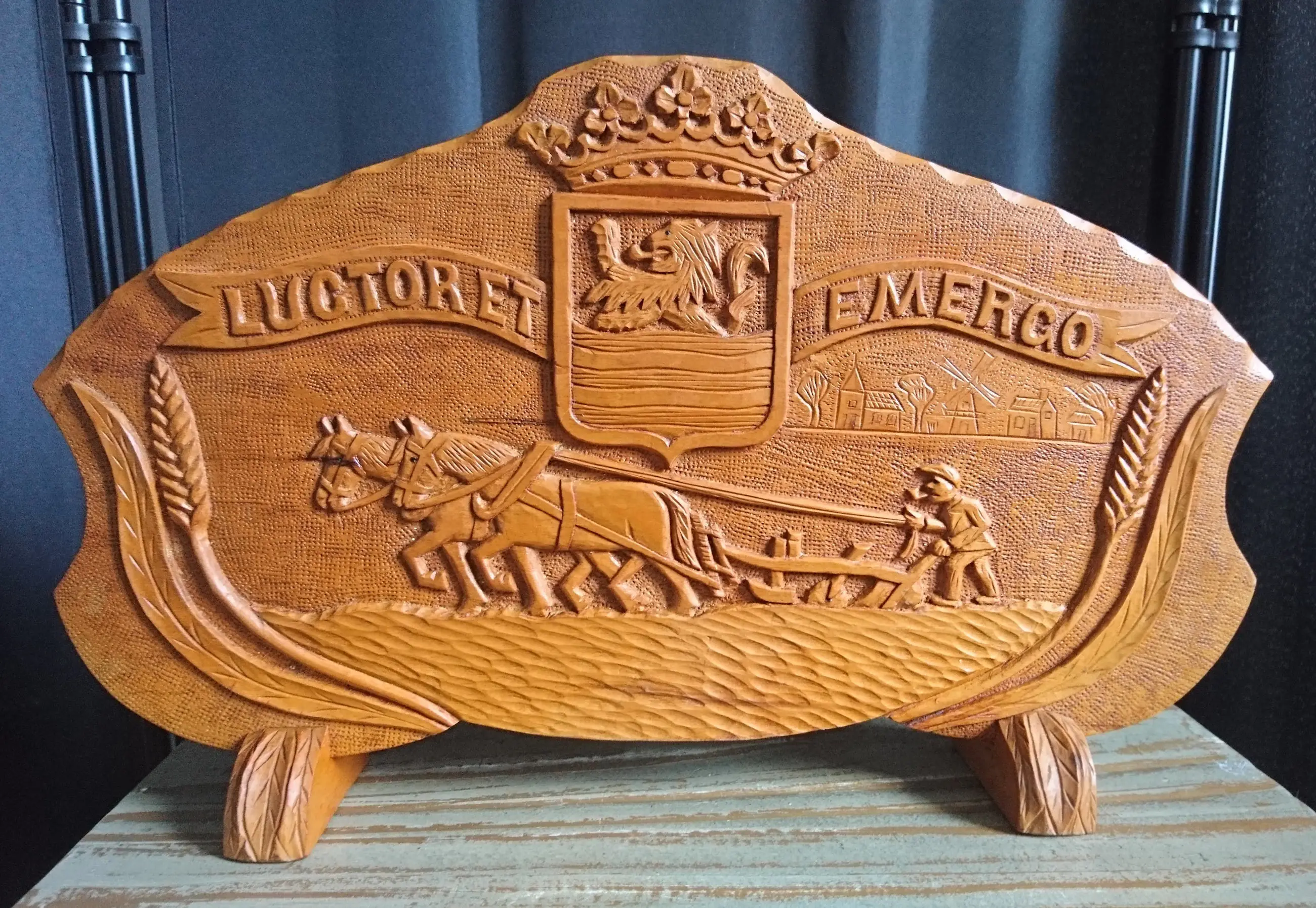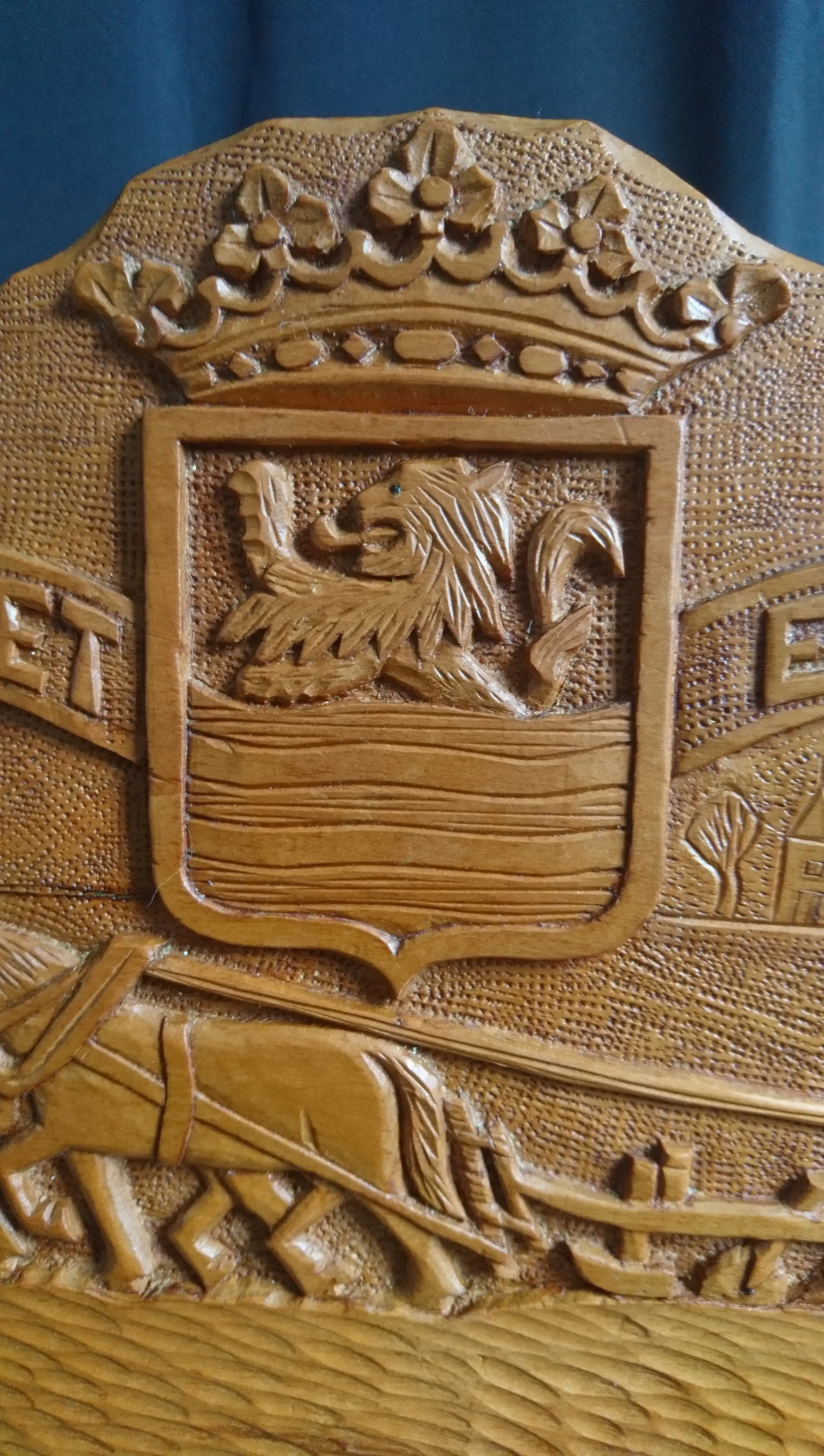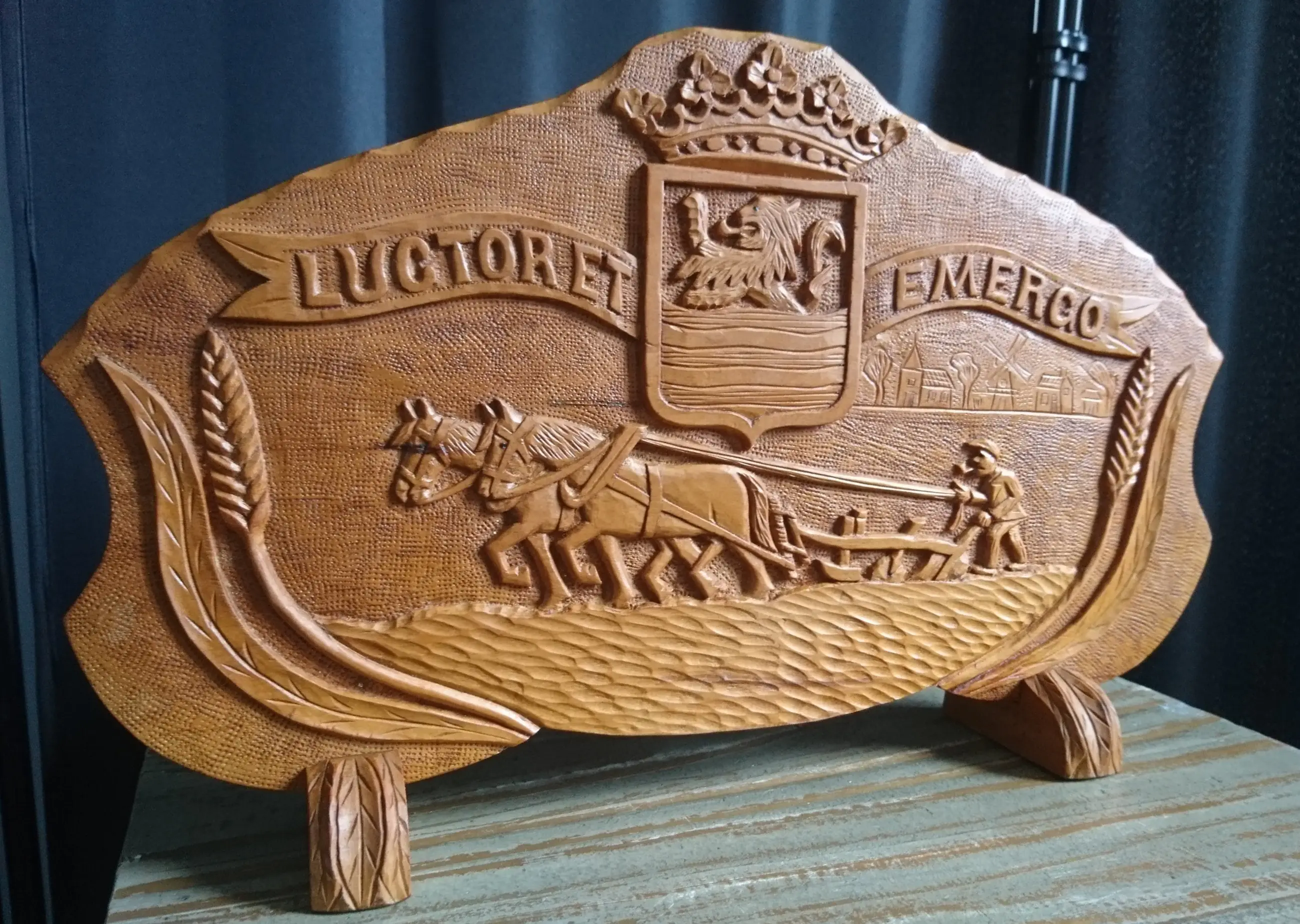 Houten messenblok met het wapen van Zeeland "Luctor et Emergo" (ik worstel en kom boven) en een ploegende boer met zijn knollen. Gemaakt voor Zeeuwse paeremessen door de houtsnijkunstenaar Pieter Buijs in 1977. Een paeremes (paardenmes) was/is een Zeeuws boerenzakmes en is als zodanig dan ook cultureel erfgoed.