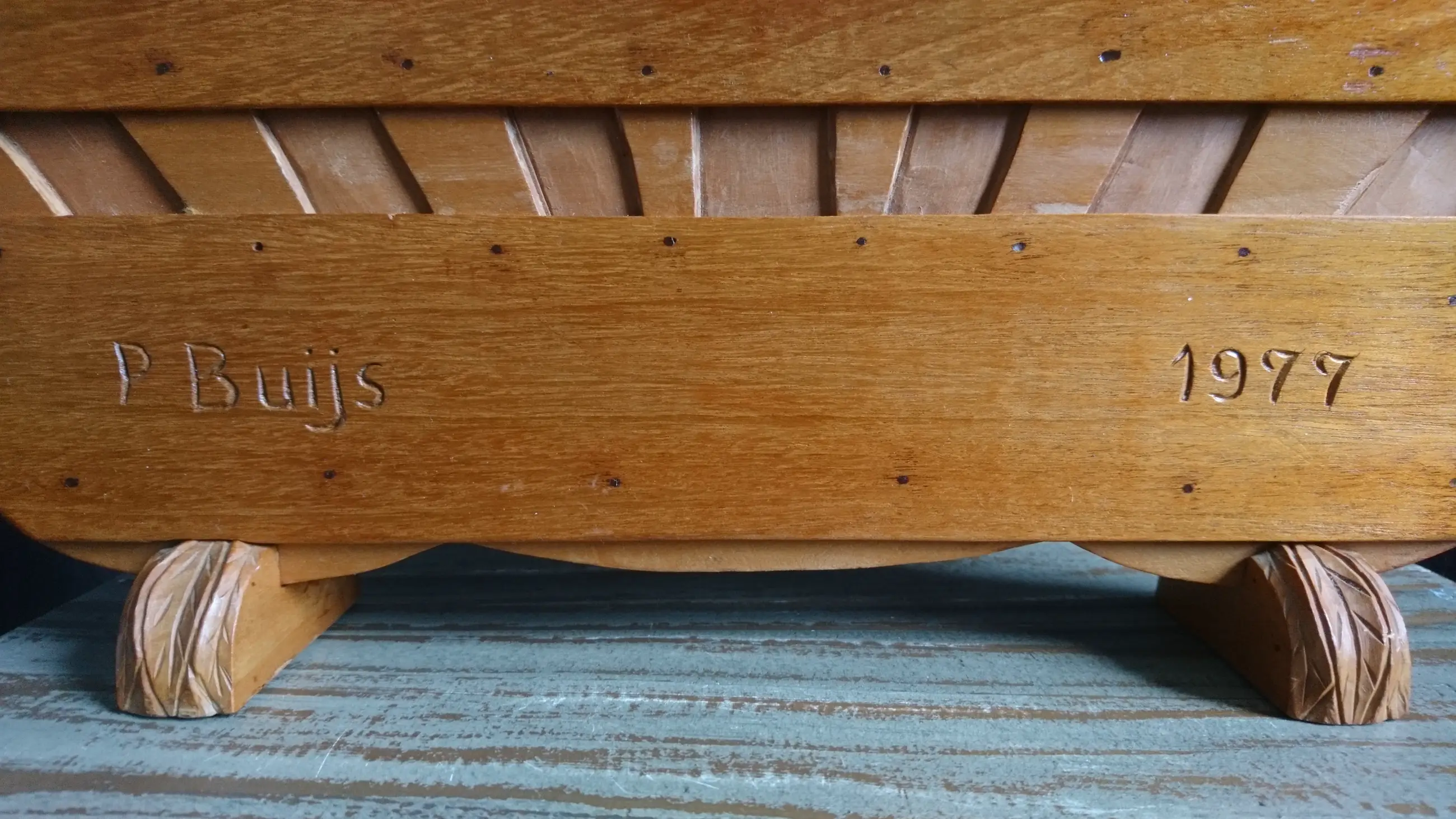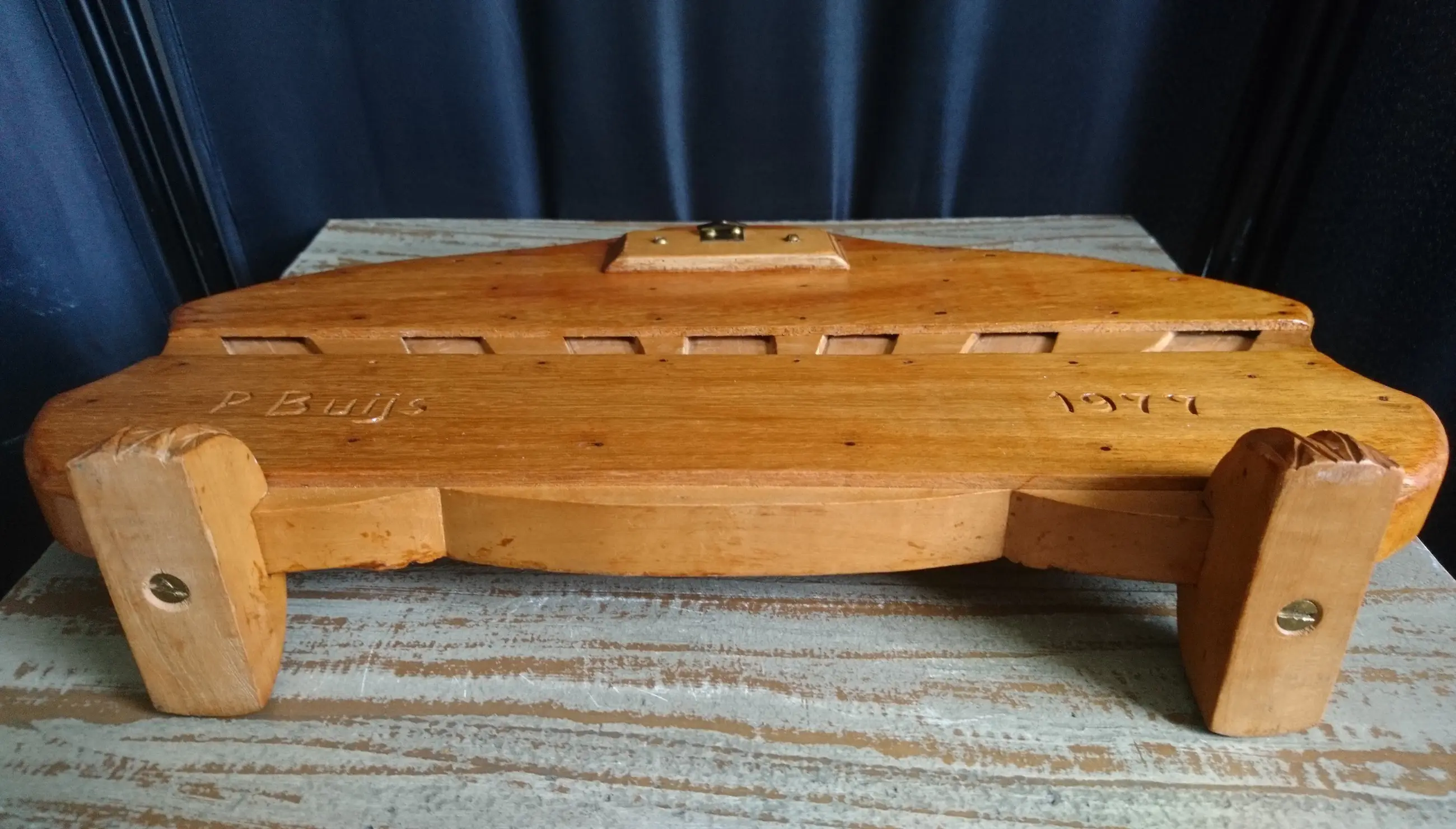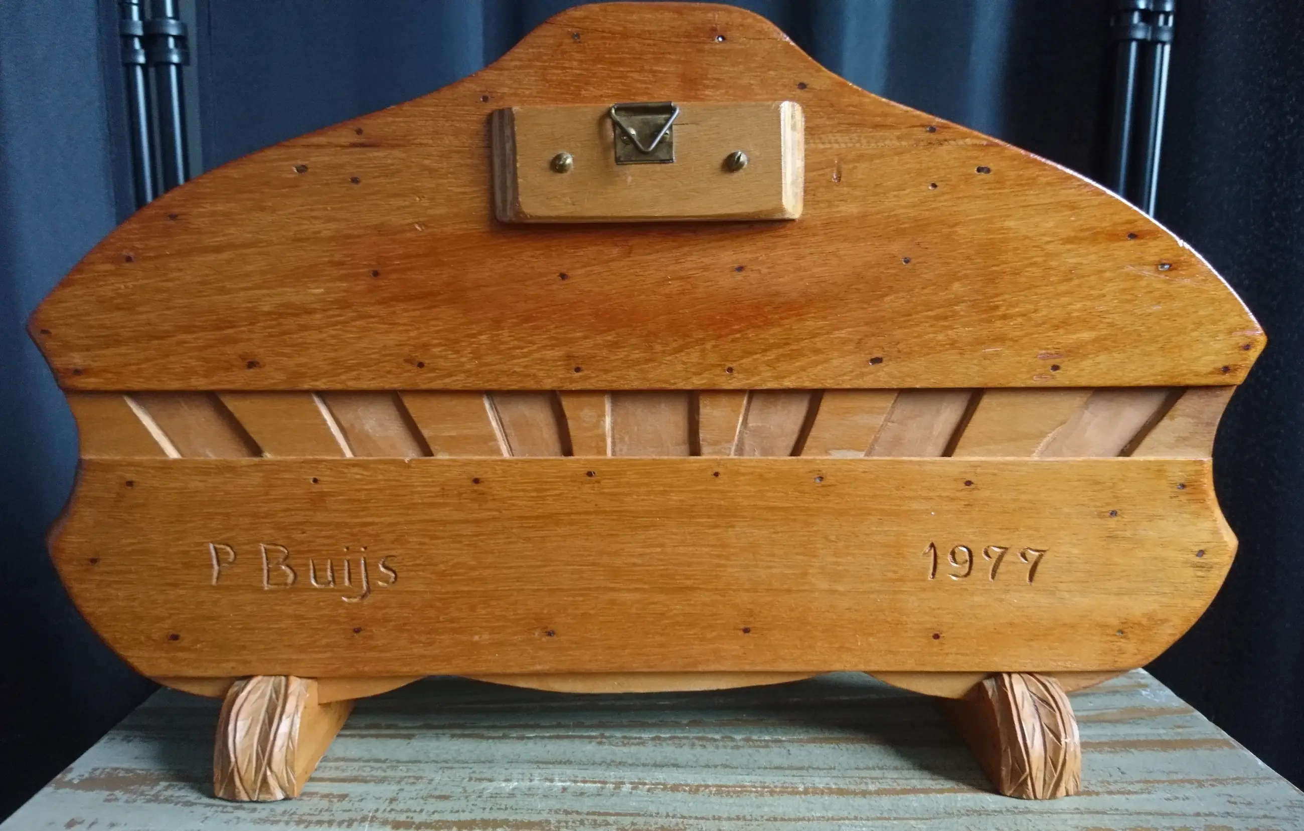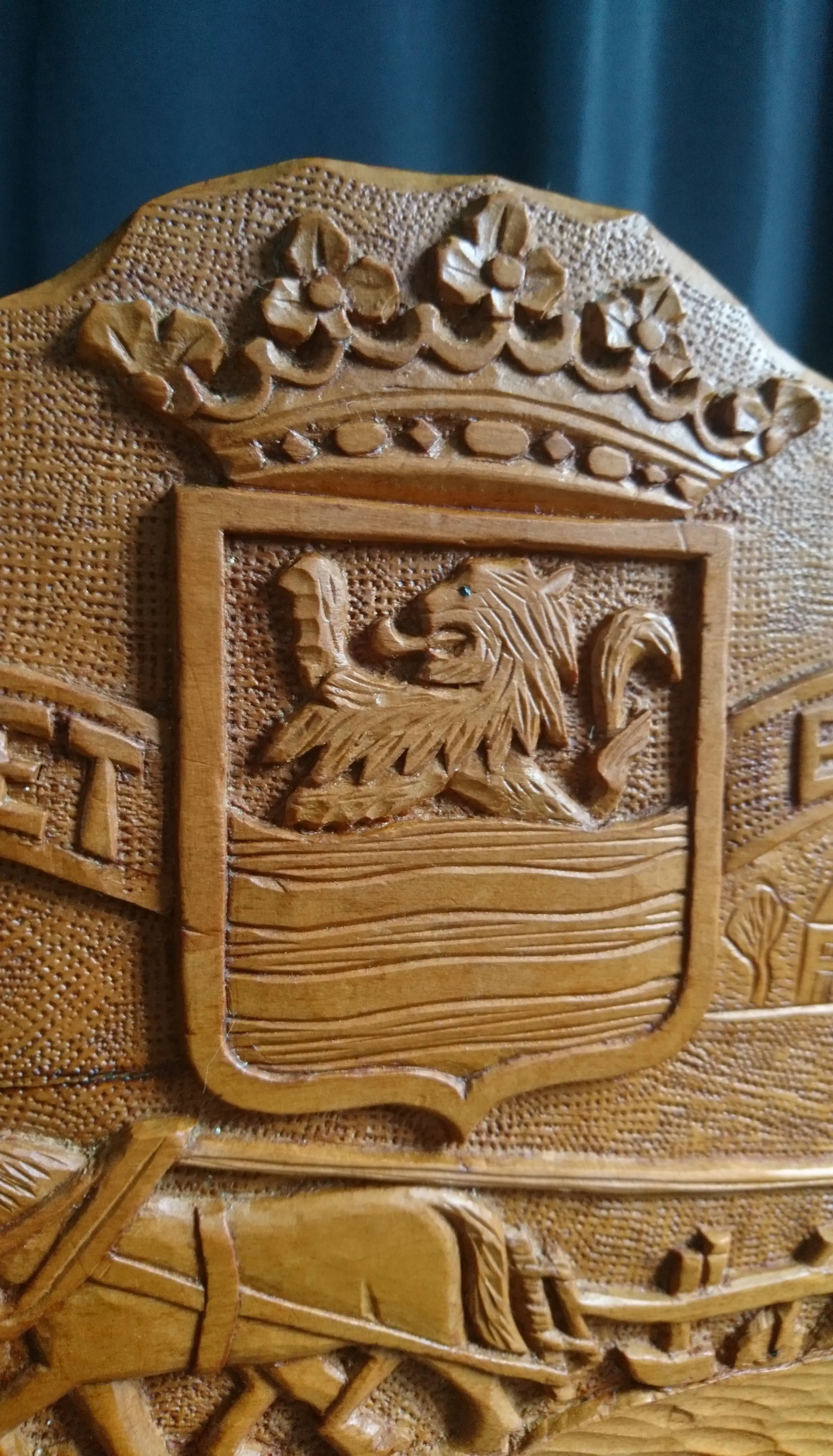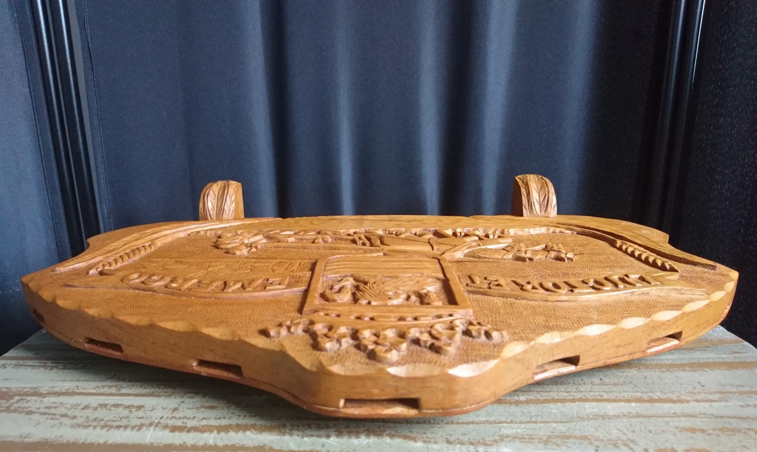 Houten messenblok met het wapen van Zeeland "Luctor et Emergo" (ik worstel en kom boven) en een ploegende boer met zijn knollen. Gemaakt voor Zeeuwse paeremessen door de houtsnijkunstenaar Pieter Buijs in 1977. Een paeremes (paardenmes) was/is een Zeeuws boerenzakmes en is als zodanig dan ook cultureel erfgoed.