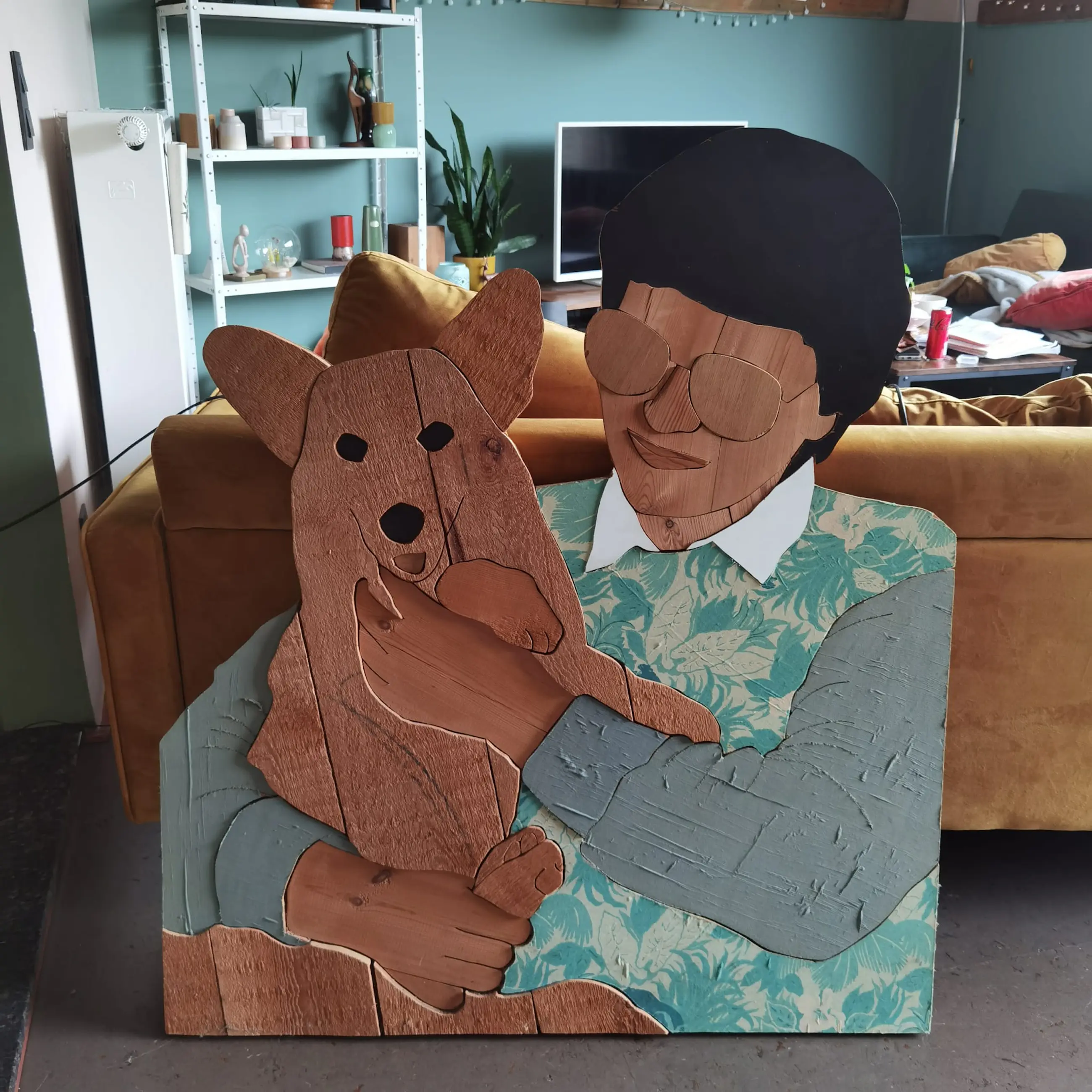 Gesigneerde collage in gemengde techniek, tegenhanger van Man met hond.