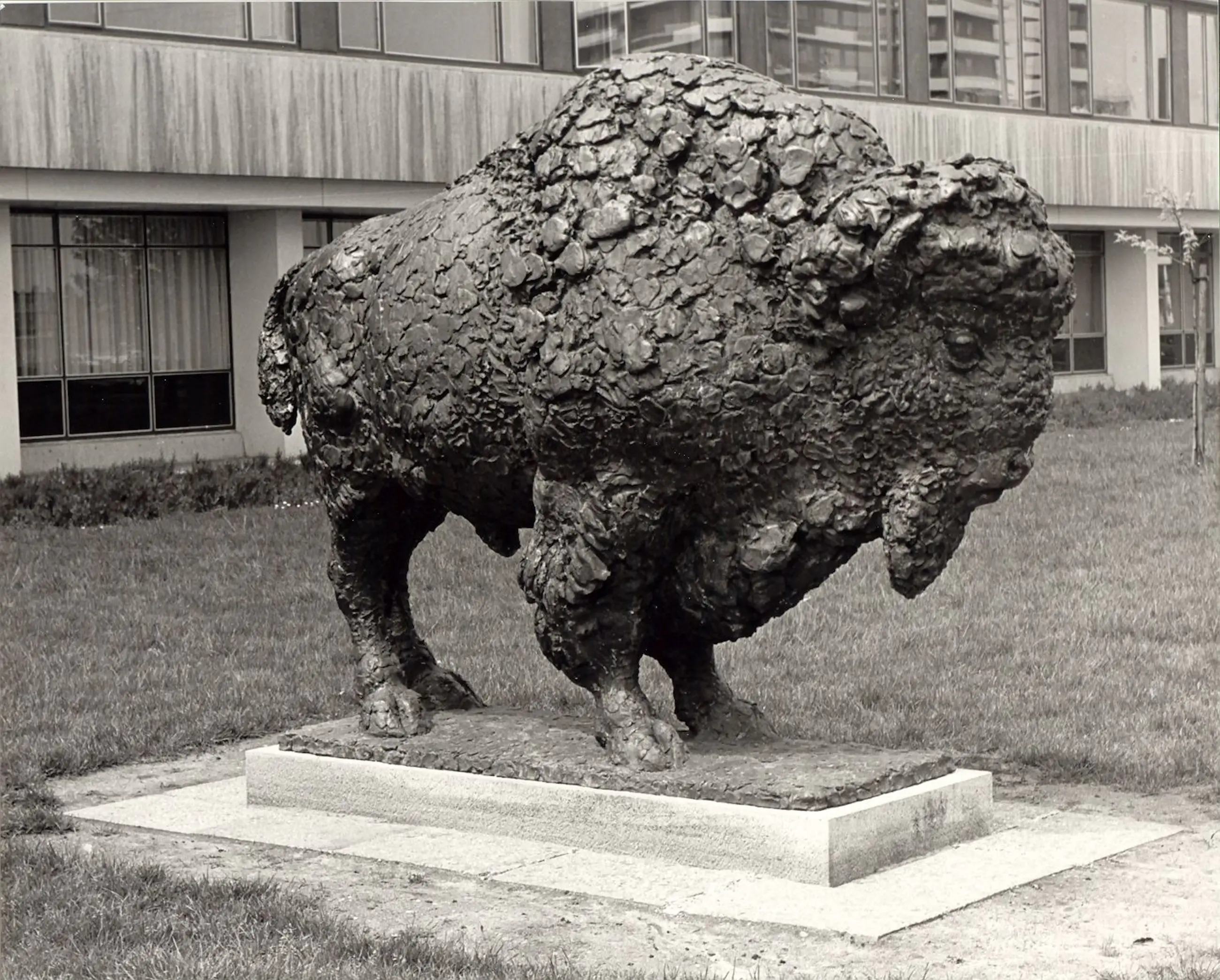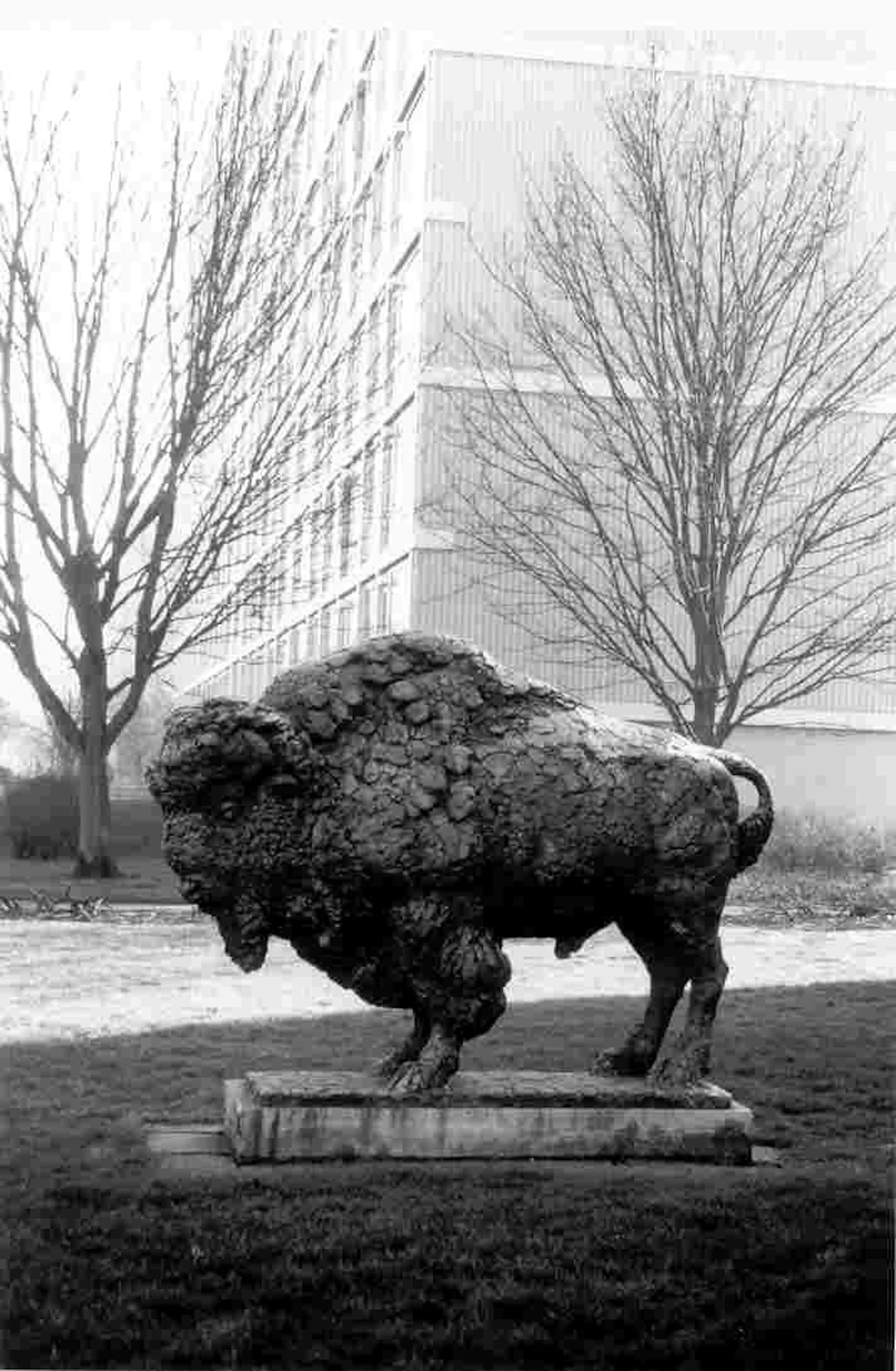 Een jaar later presenteert Pieter d’Hont zijn ontwerp voor Bizon. De kunstenaar heeft het beeld opgebouwd uit talloze proppen en ruwe klonteringen klei, het geheel is zodanig expressief gemodelleerd dat in het bronzen afgietsel de textuur van het materiaal en het kneedwerk nog zichtbaar is. De harige huid en dikke kraag van het dier zijn bepalend voor de expressieve kracht van de forse torso, die onverzettelijkheid uitdrukt.