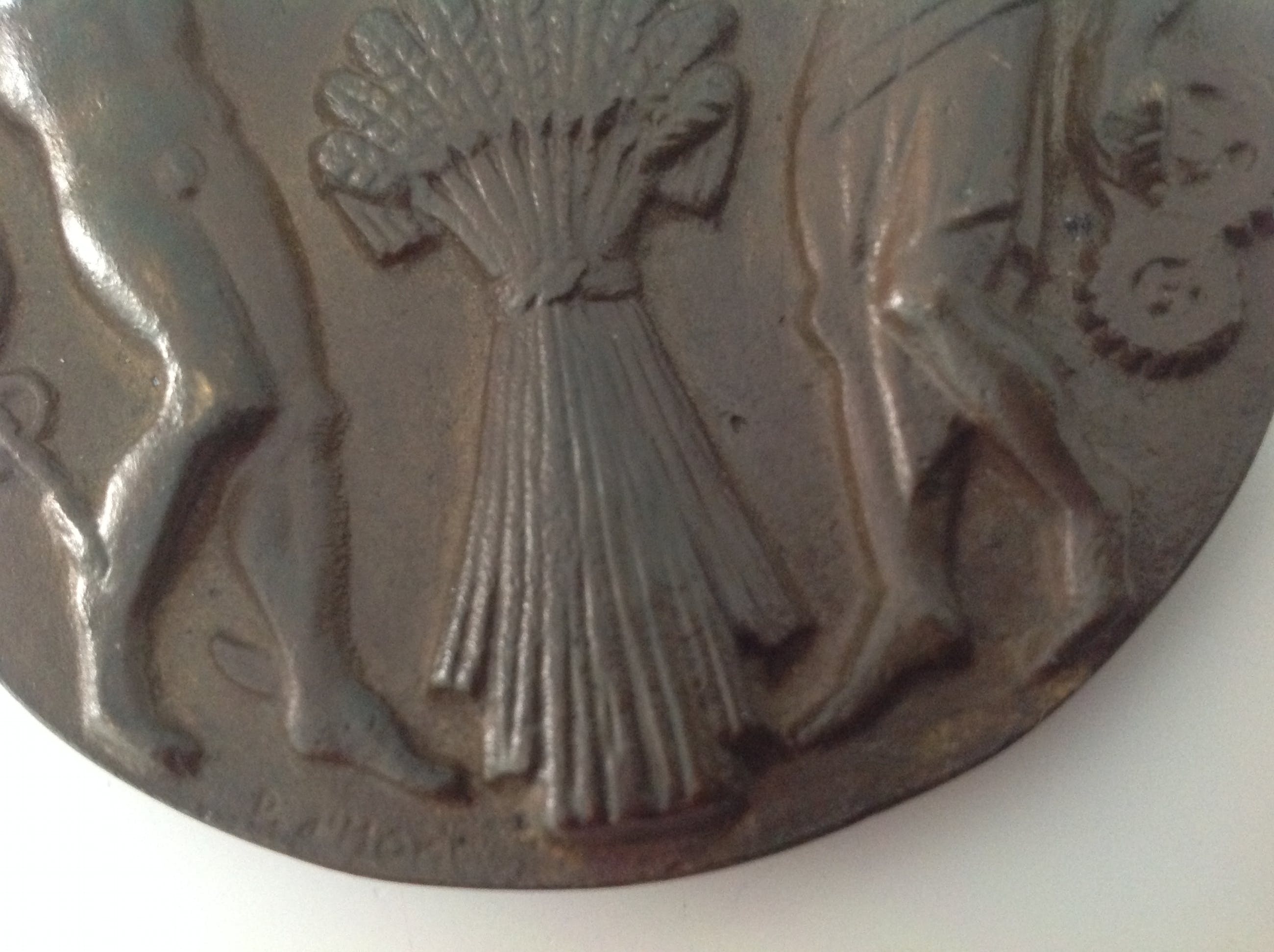 Jaarbeurspenning door Pieter d'Hont. Brons, dikte 0,3mm. doorsnede 8 cm. Gesigneerd voorzijde onder voet linkerfiguur. Gemerkt in rand, echter voor mij onleesbaar. Fraaie zware penning.