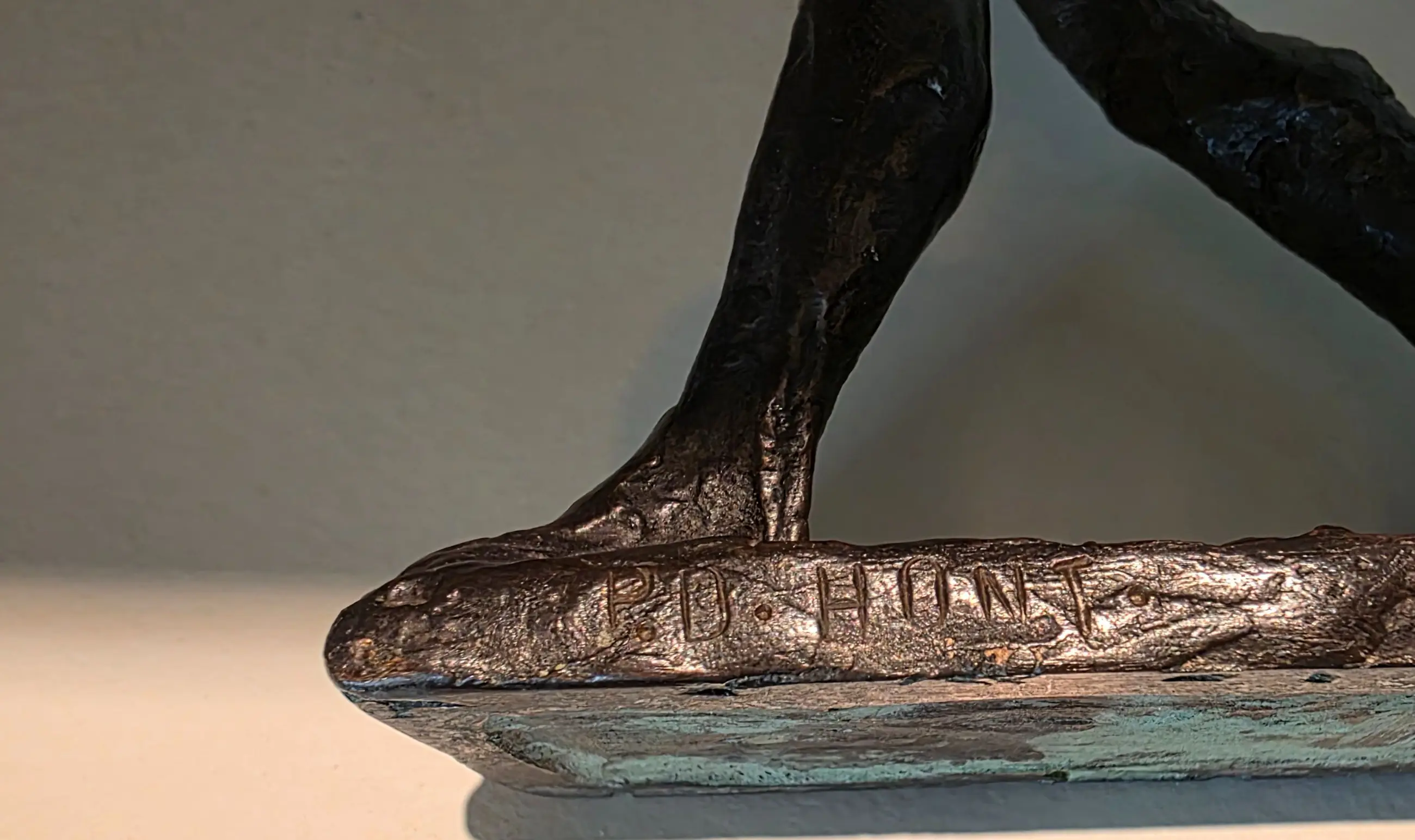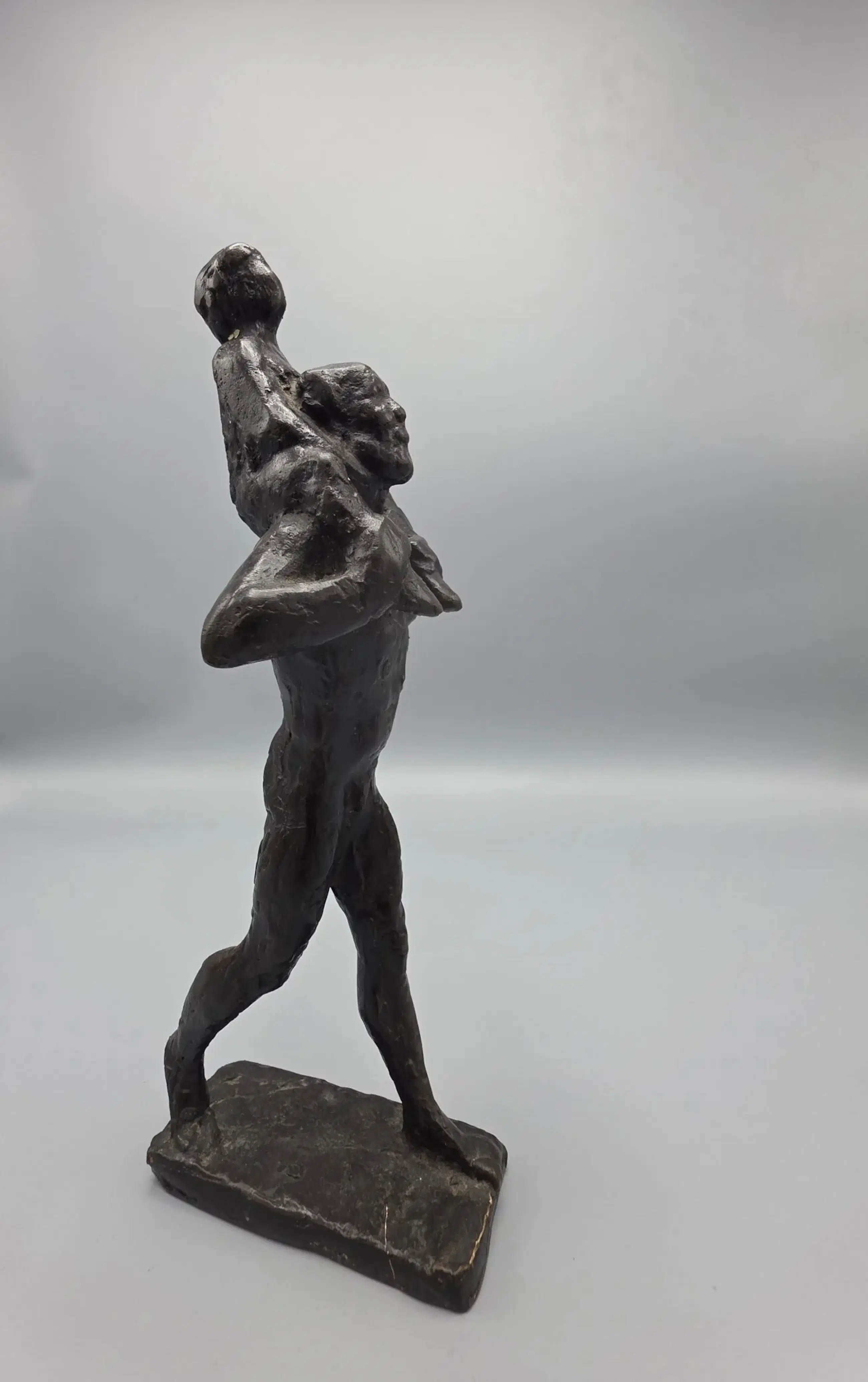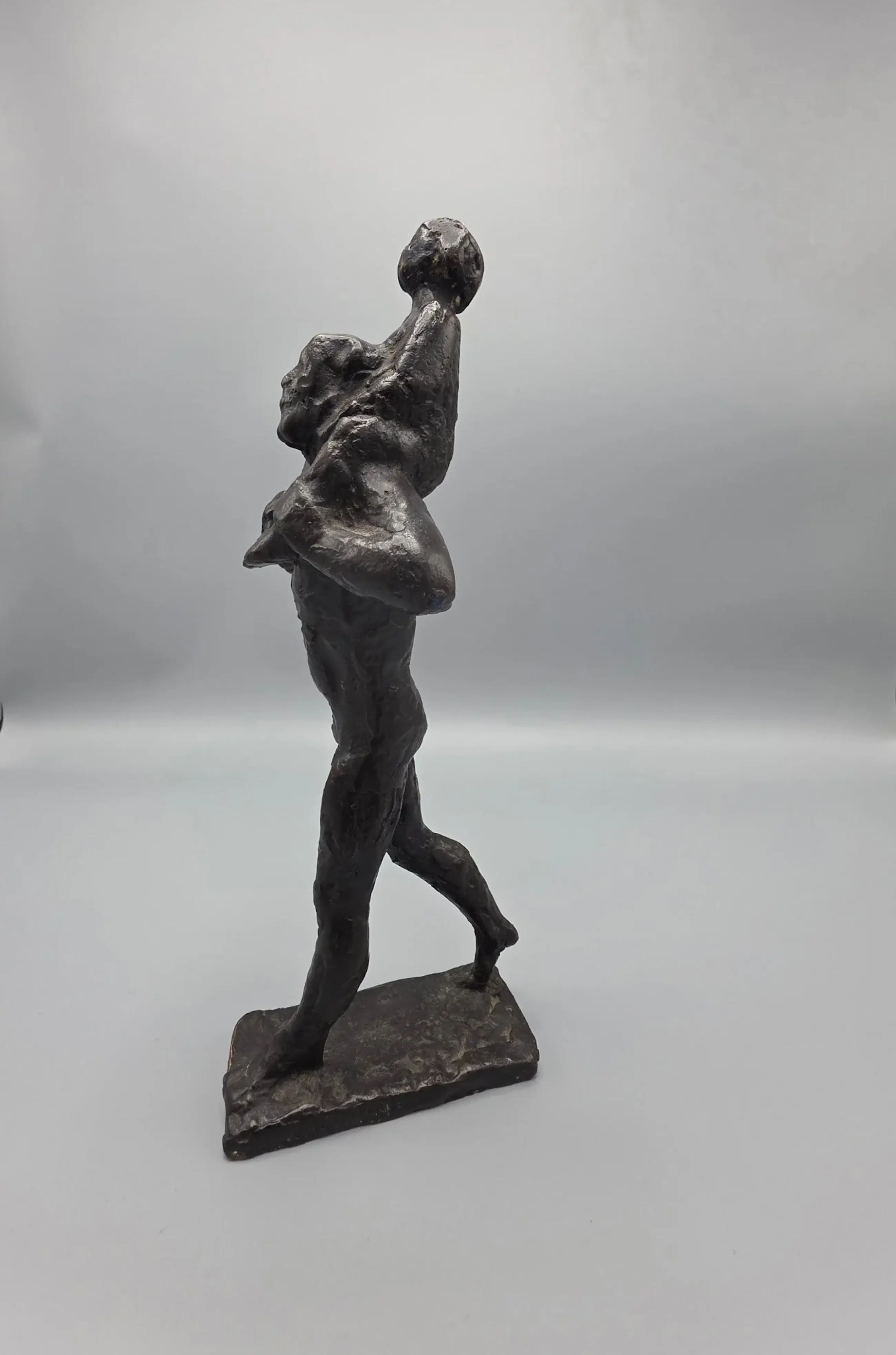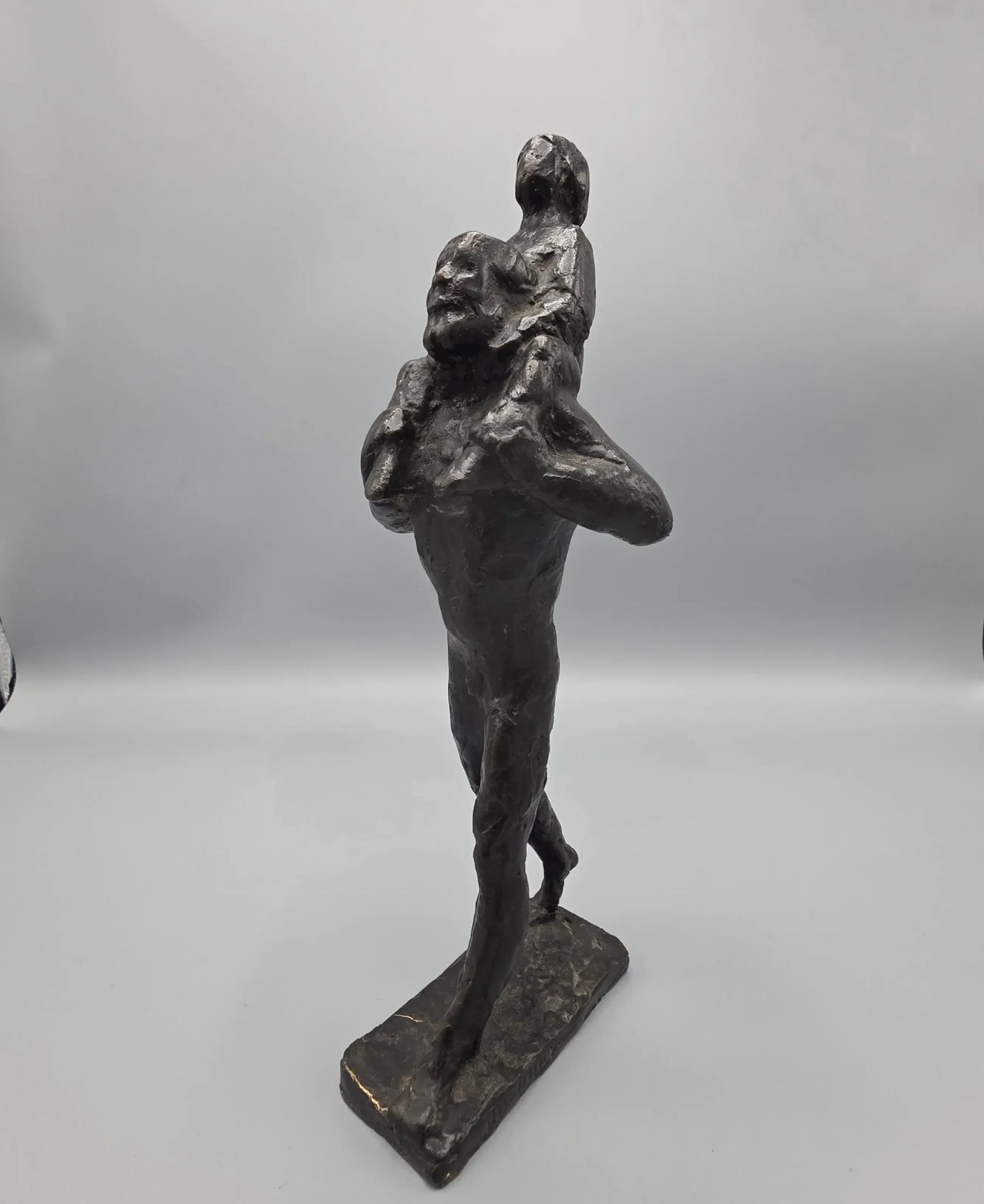Dit bronzen beeld Man and child van Pieter d'Hont uit 1963 toont het motief van de lopende man met het kind op zijn schouders, een symbool voor 'de cirkel van het leven'. De sculptuur kenmerkt zich door d'Honts karakteristieke expressieve vormgeving met een huid opgebouwd uit kleine stukjes klei, wat resulteert in een krachtige en dynamische uitstraling. Er bestaat ook een grote versie van dit beeld in Utrecht, voor het Transwijkpark op Kanaleneiland. In het boek "Beelden in de stad" (1998) wordt dit monumentale werk beschreven als een grote man met een machtige borstkas die een klein kind hoog op zijn schouders draagt, de armen omhoog geheven – een passend symbool van vooruitgang voor een nieuwe woonwijk. Het beeld is gesigneerd en in goede conditie.