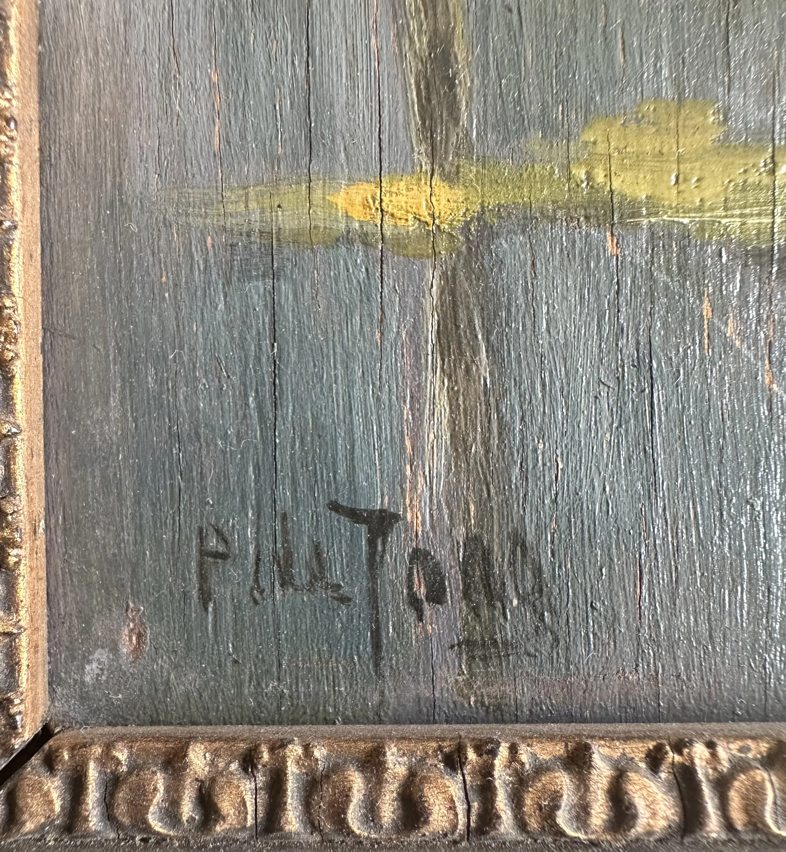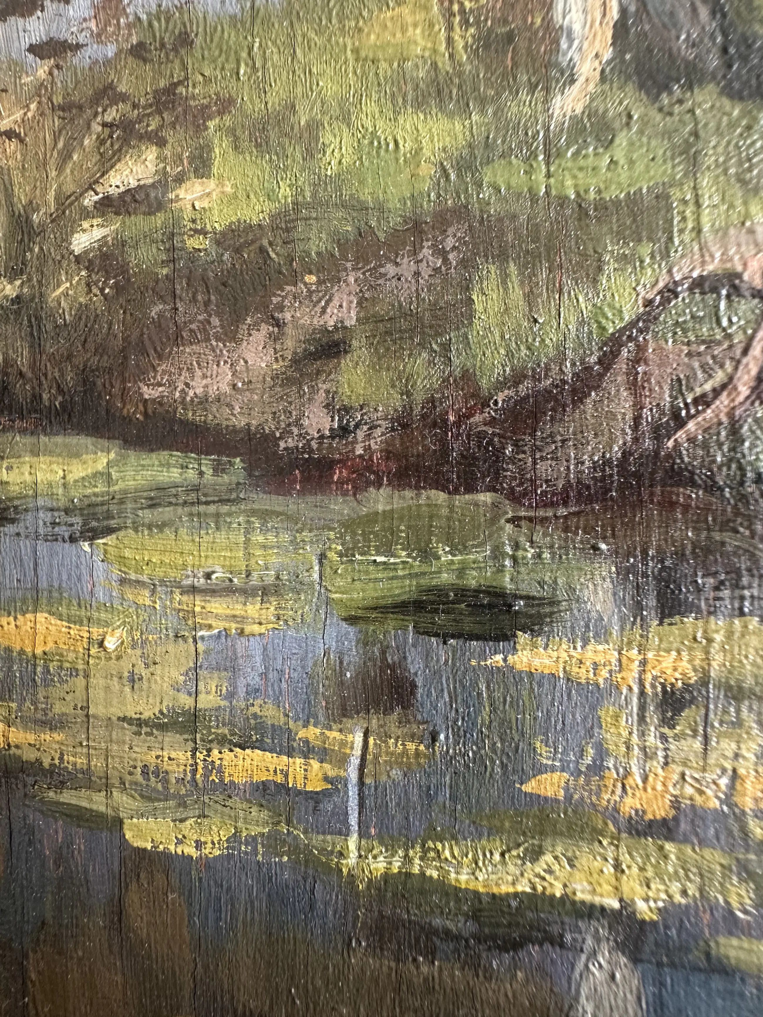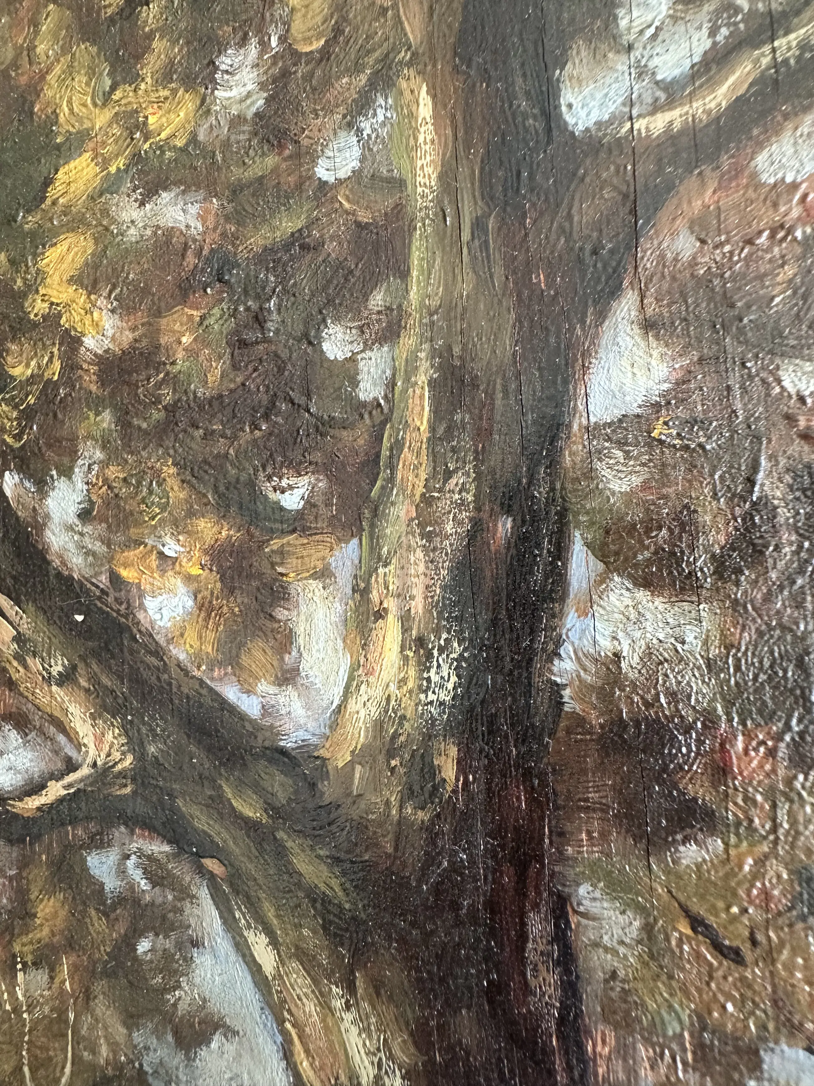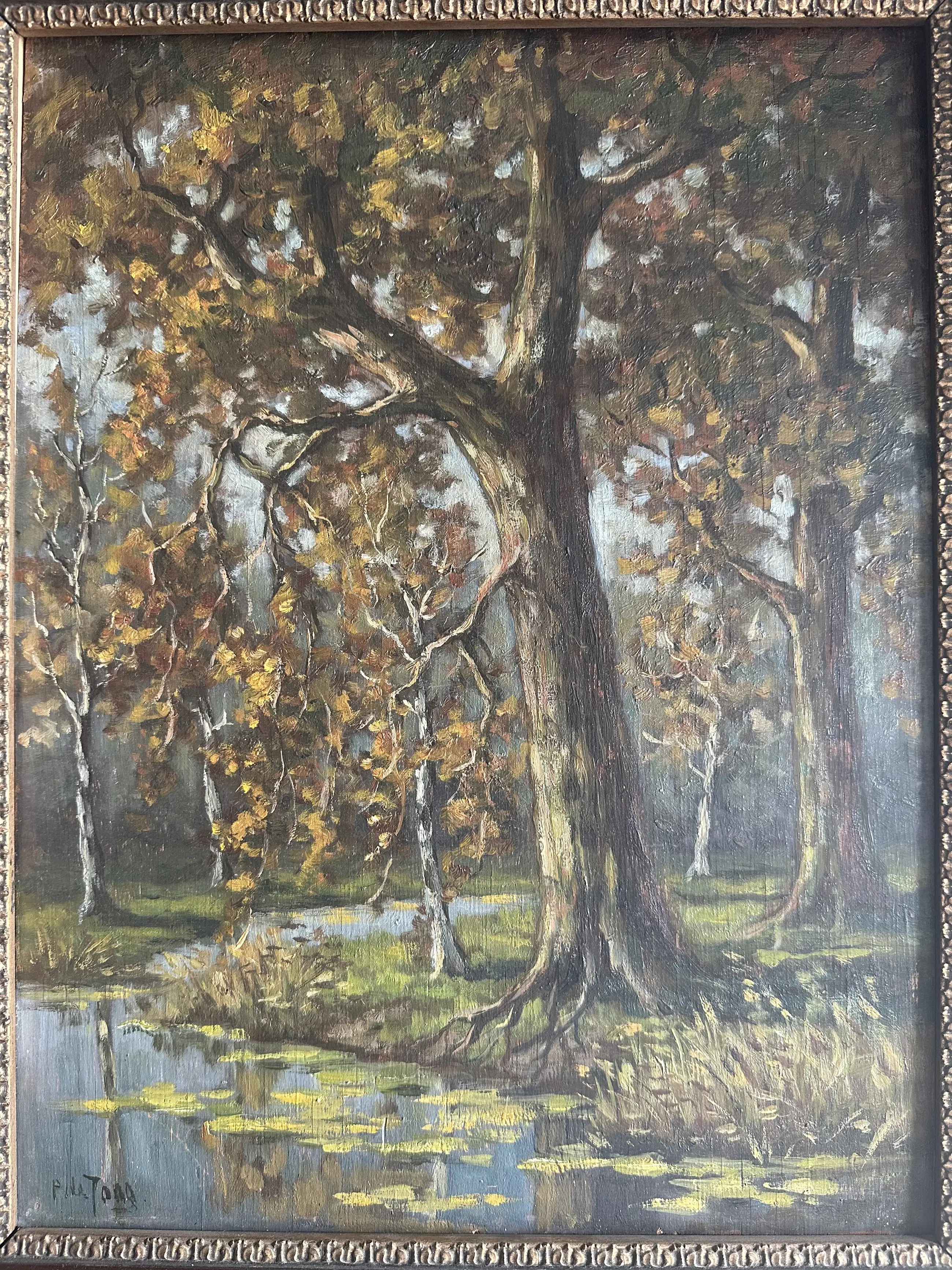 Mooi schilderij van Pieter de Jong. Herfst in het bos. Geschilderd op een houten paneel . Op de lijst van het schilderij zitten wat kleine beschadigingen.