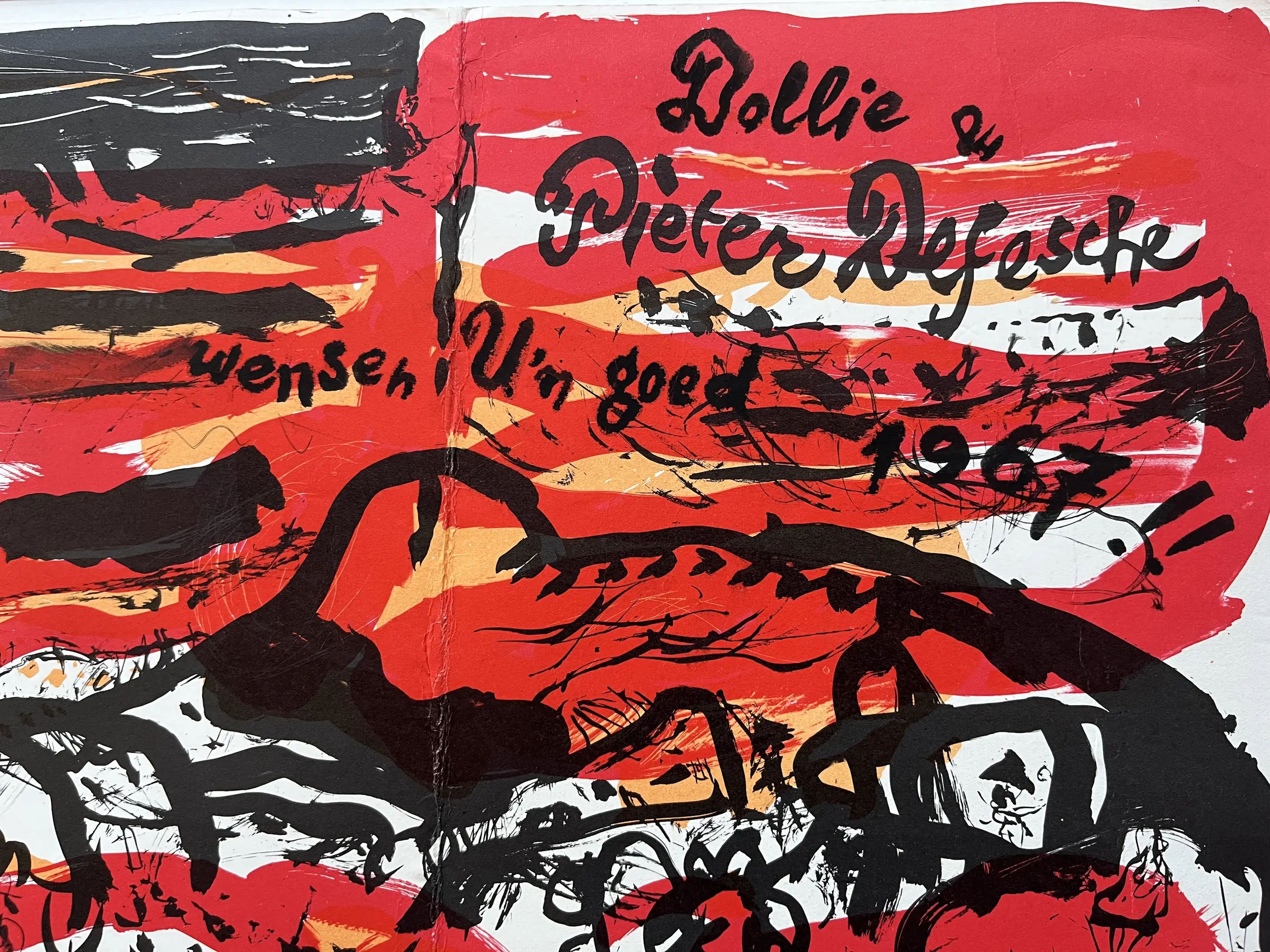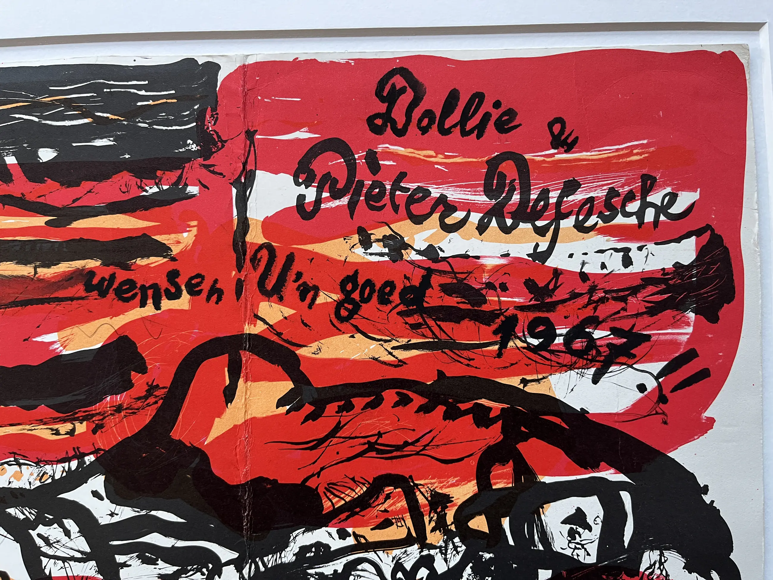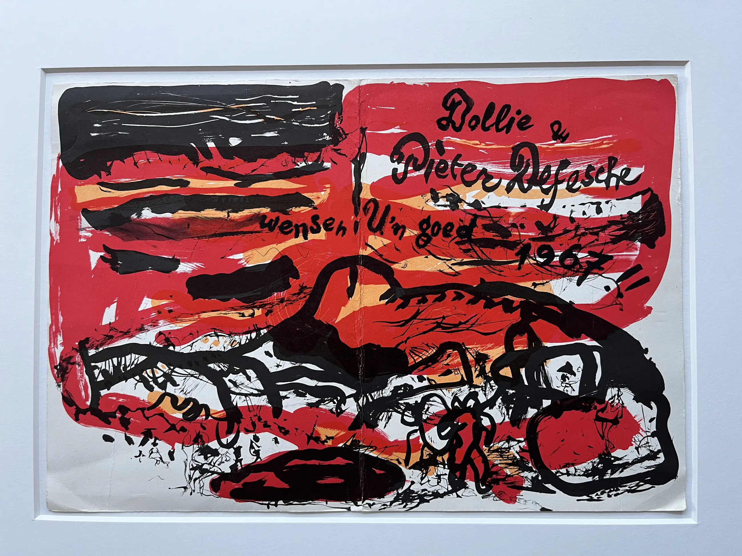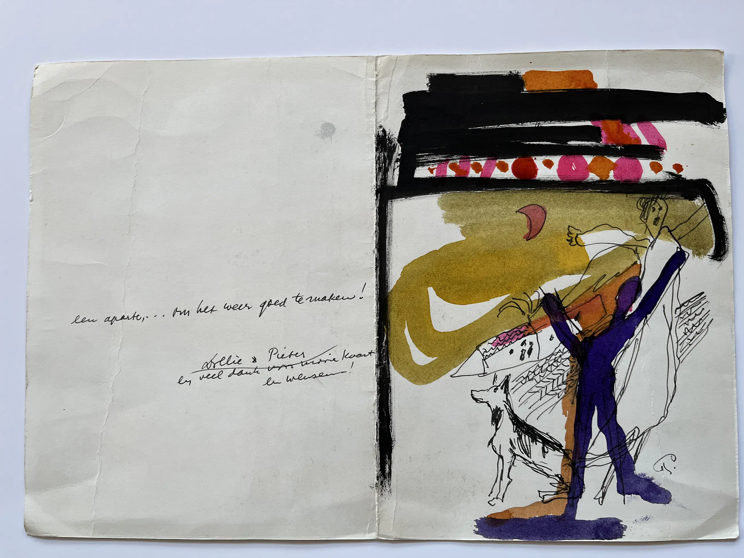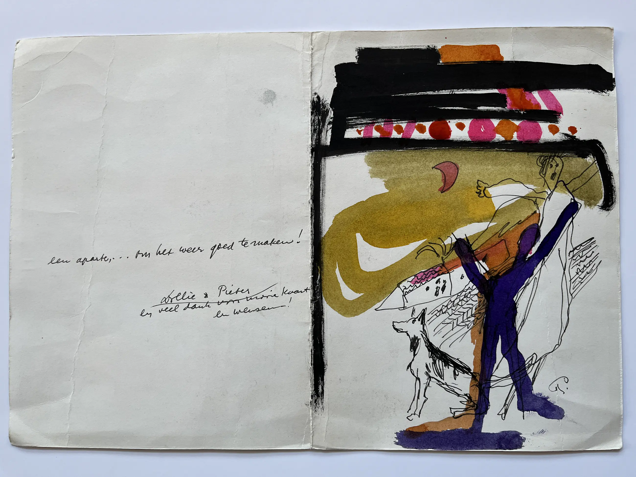 Uniek en zeer leuk werk van de veelzijdig Kunstenaar Pieter Defesche. Een persoonlijke Nieuwjaarskaart/wens met op de achterzijde een tekening met persoonlijke tekst.