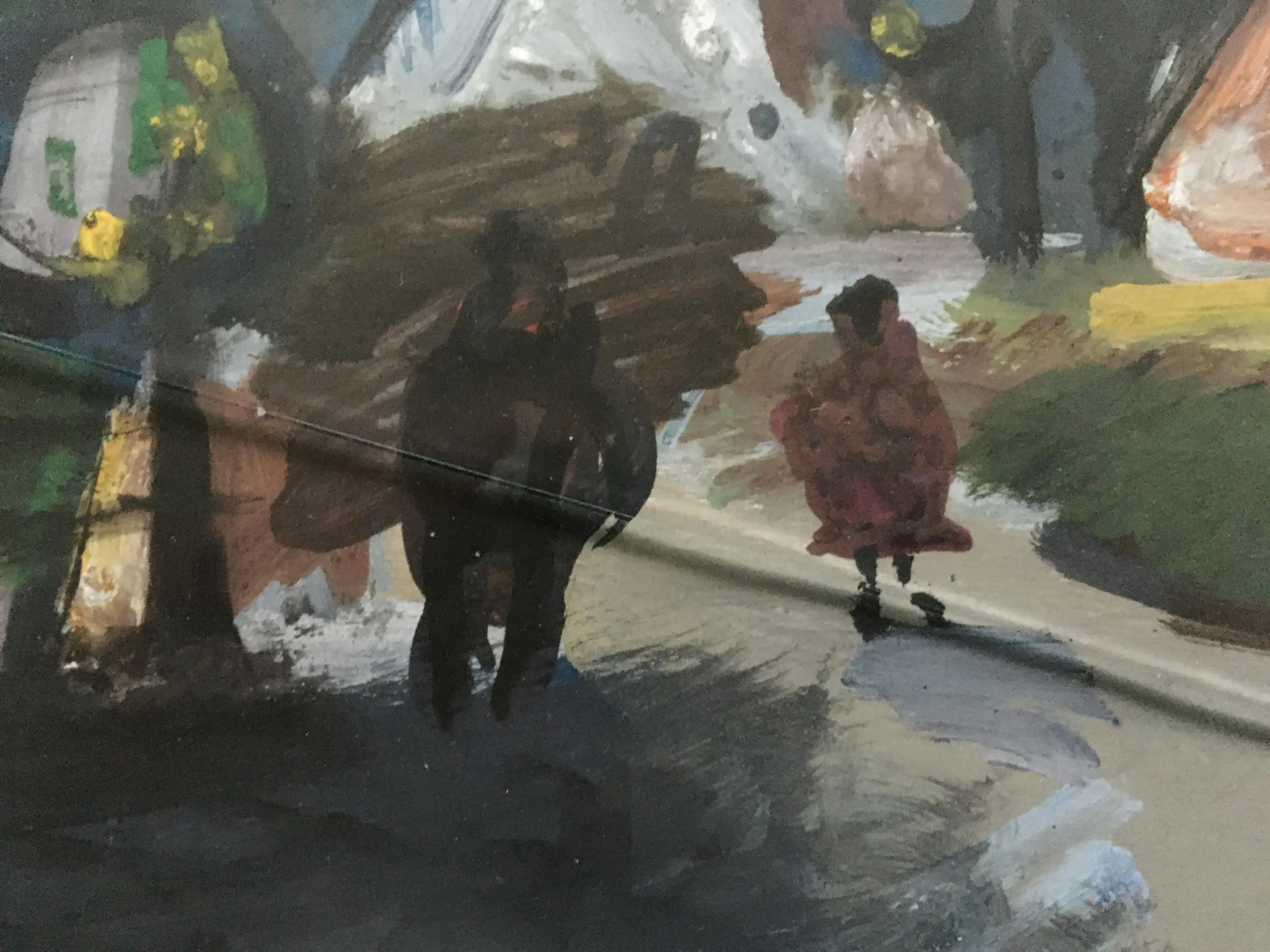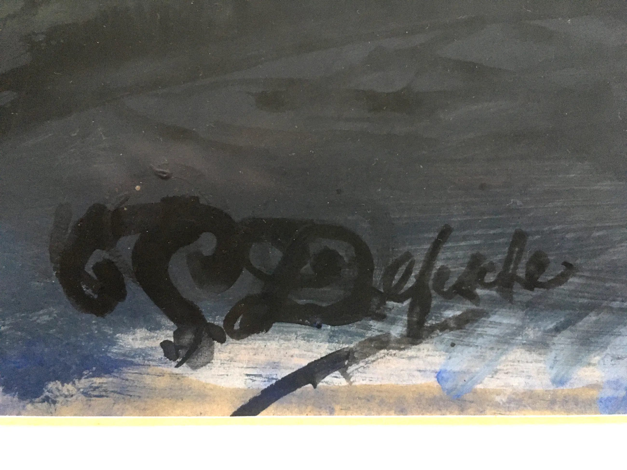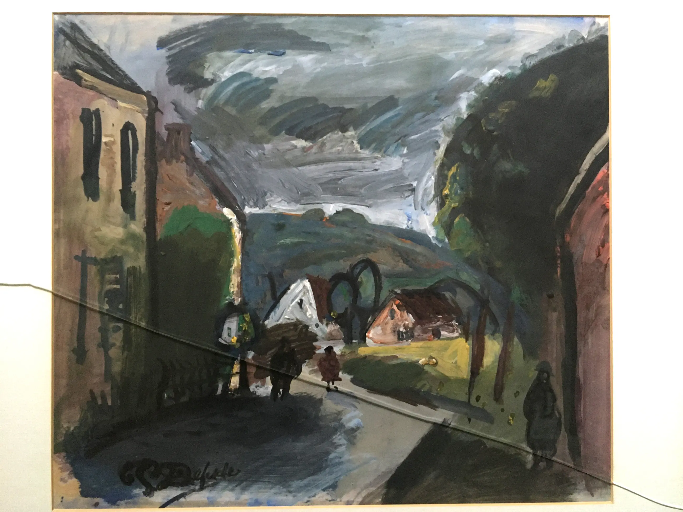 Werk, passepartout en lijst in goede conditie. Glas heeft een barst.