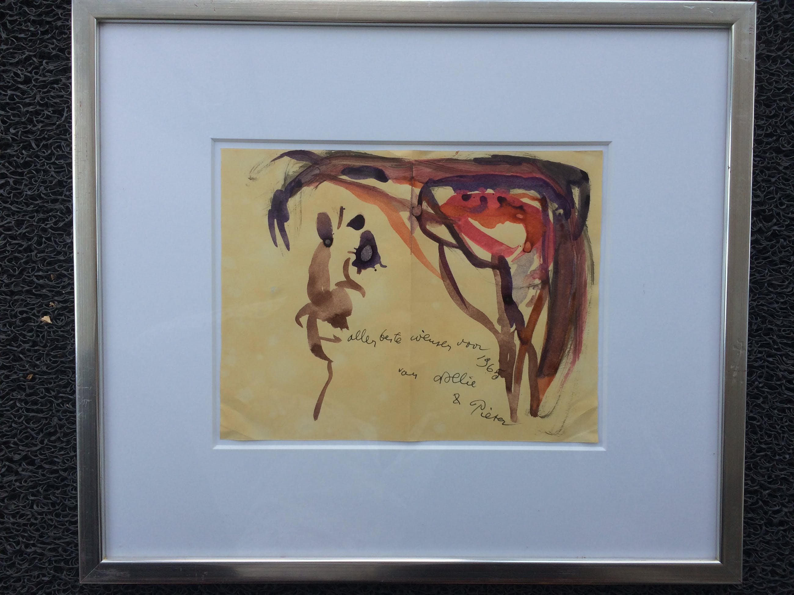 Leuk werkje van Pieter Defesche ter ere van het nieuwejaar:1965.Ingelijst met zuurvrij passe partout. Kan zo worden opgehangen.U kunt het werk vooraf bekijken en of na aankoop ophalen bij galerie Rotor in Arkel.